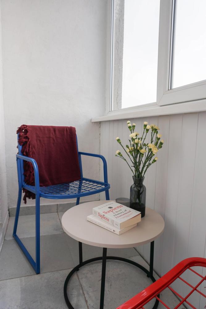 На балконе оборудована зона отдыха, 2 стула и столик.