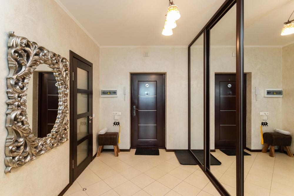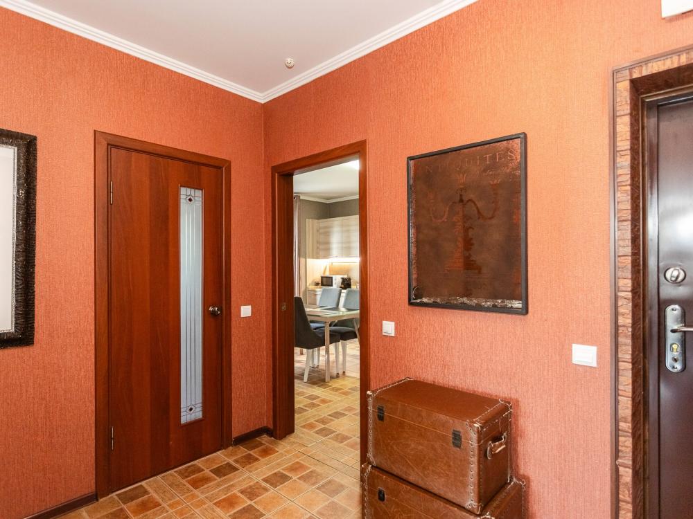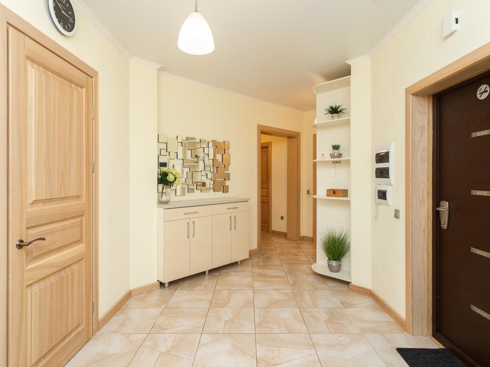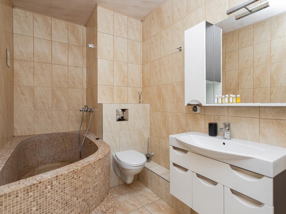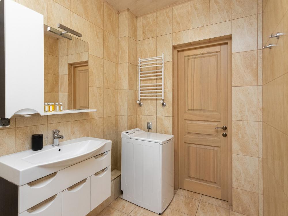 Апартаменты удовлетворят даже самый взыскательный вкус. При ремонте и декорировании использовались материалы известных европейских марок таких как: Boen, Villeroy and Boch, Schuller, Maytoni и др. Деревянный паркетный пол, посудомоечная машина, кондиционер, просторный кабинет с компьютером и терраса сделают ваш отдых комфортным и незабываемым. В квартире имеются: фен, утюг, гладильная доска, пылесос, полотенца (одно большое, одно среднее на каждого проживающего), шампуни, гель для душа, жидкое мыло, постельное белье, чай, сладкий презент, кухонное полотенце, моющие средства для посуды, средства индивидуальной гигиены, столовые приборы, посуда, электрический чайник, микроволновка, кабельное ТВ, высокоскоростной Wi-fi, стиральная машина, тапочки, холодильник.
