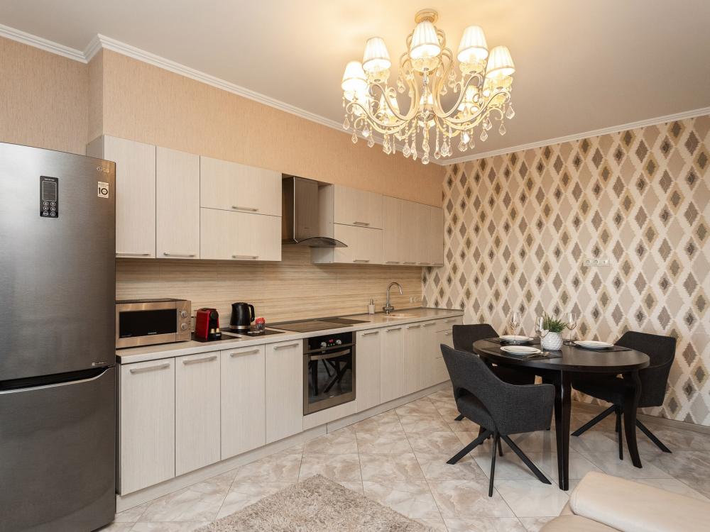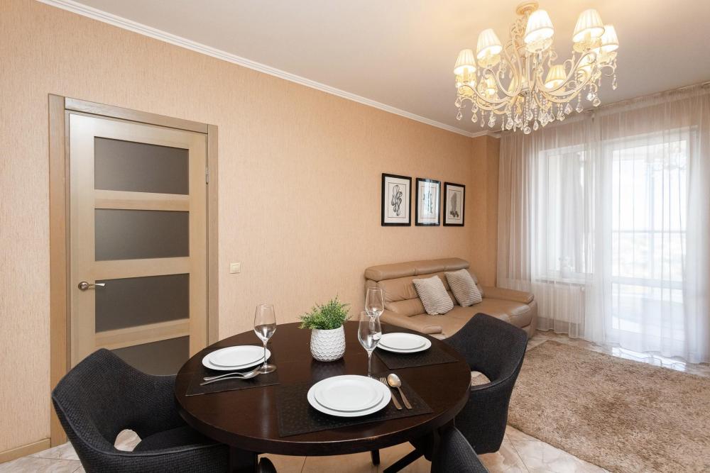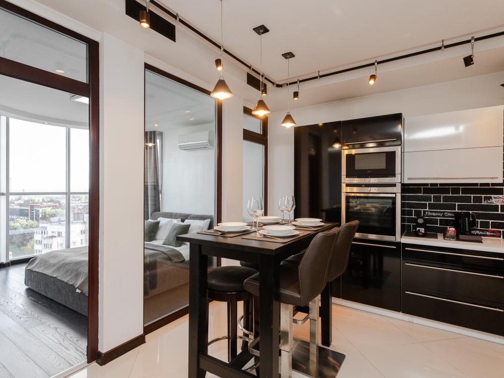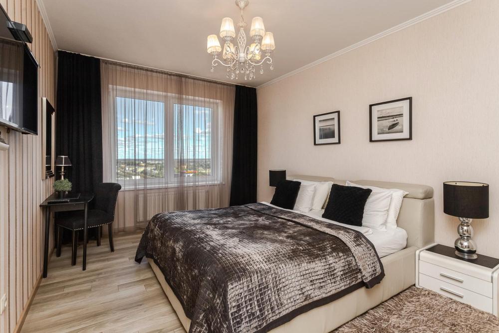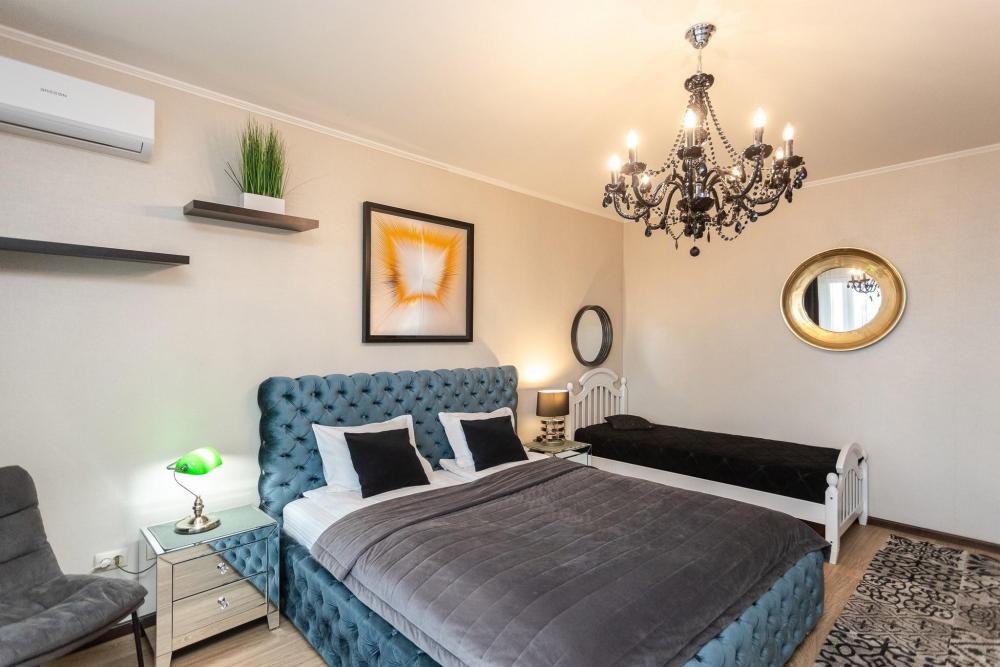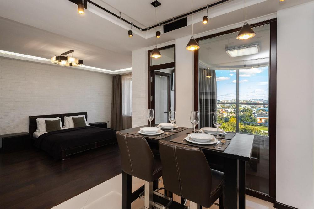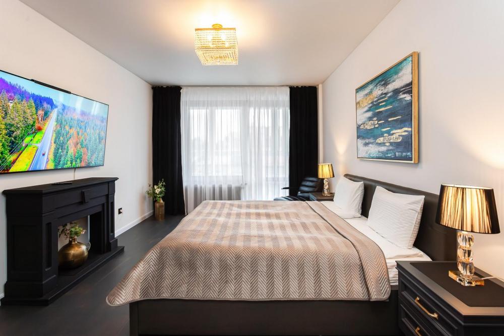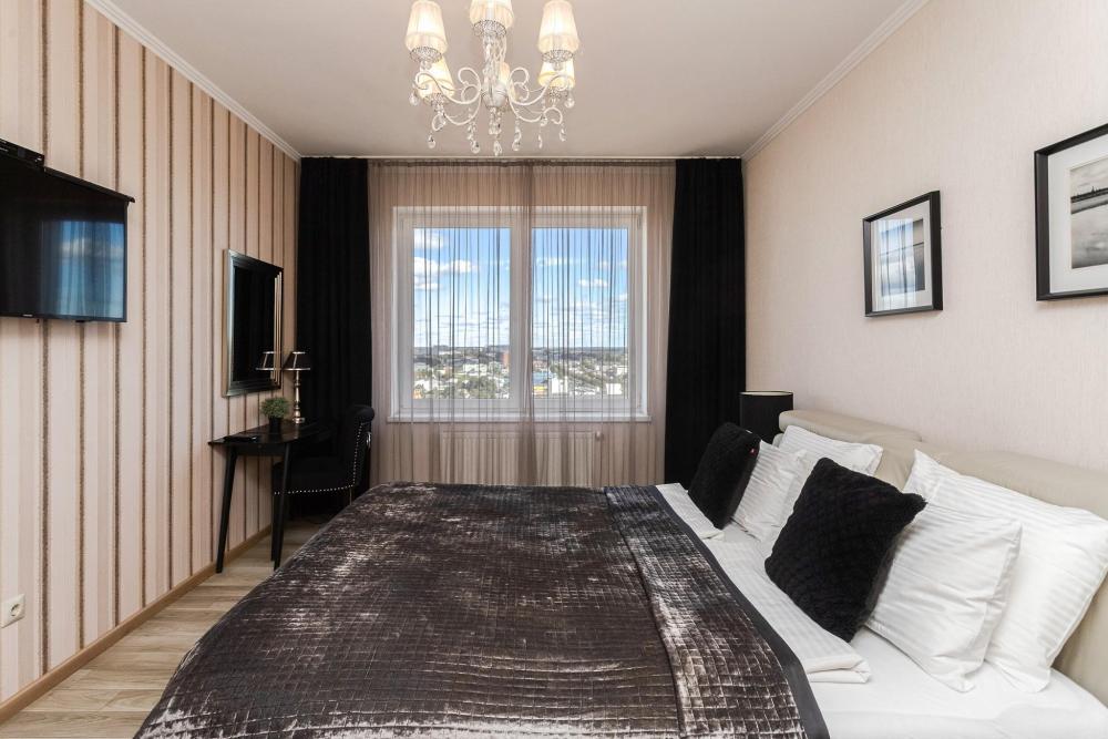 Комфортные однокомнатные апартаменты категории люкс. В распоряжении гостей апартаментов: кондиционер, двуспальная кровать и удобный раскладной диван, расположены в разных комнатах. Особенностью квартиры являются великолепная кровать, стол, ковер немецкой фабрики KARE, светильники и торшер голландской фабрики Eichholtz. Благодаря перепланировке обеденная зона обладает прекрасным полупанорамным видом на город.