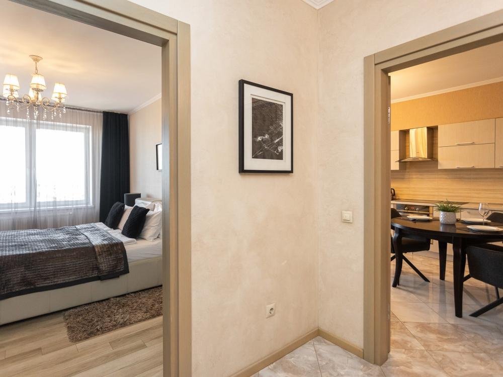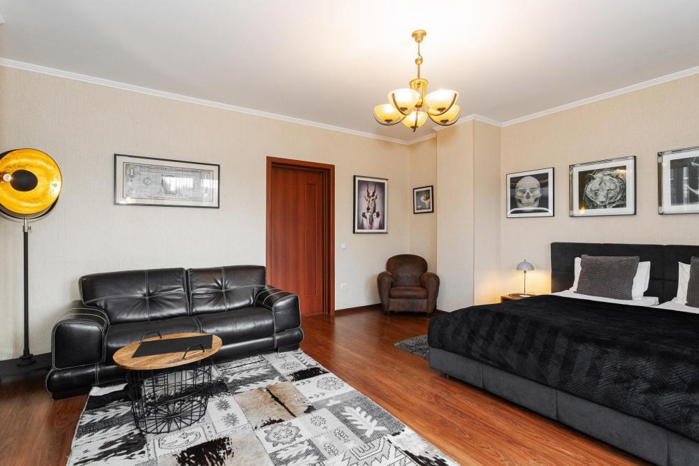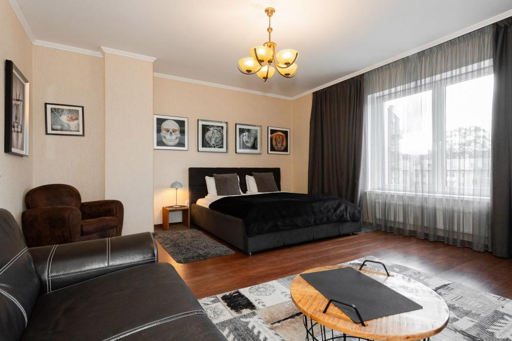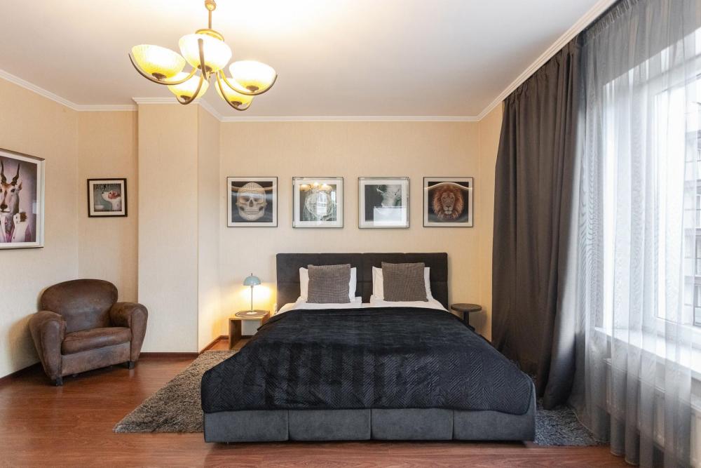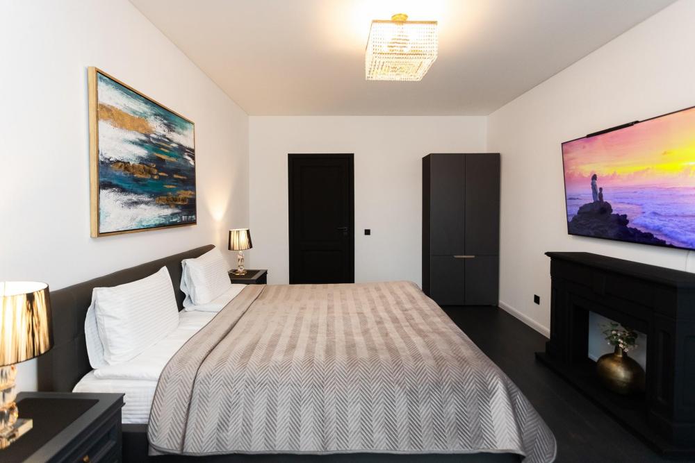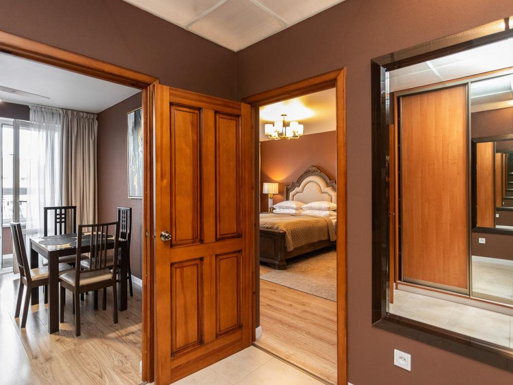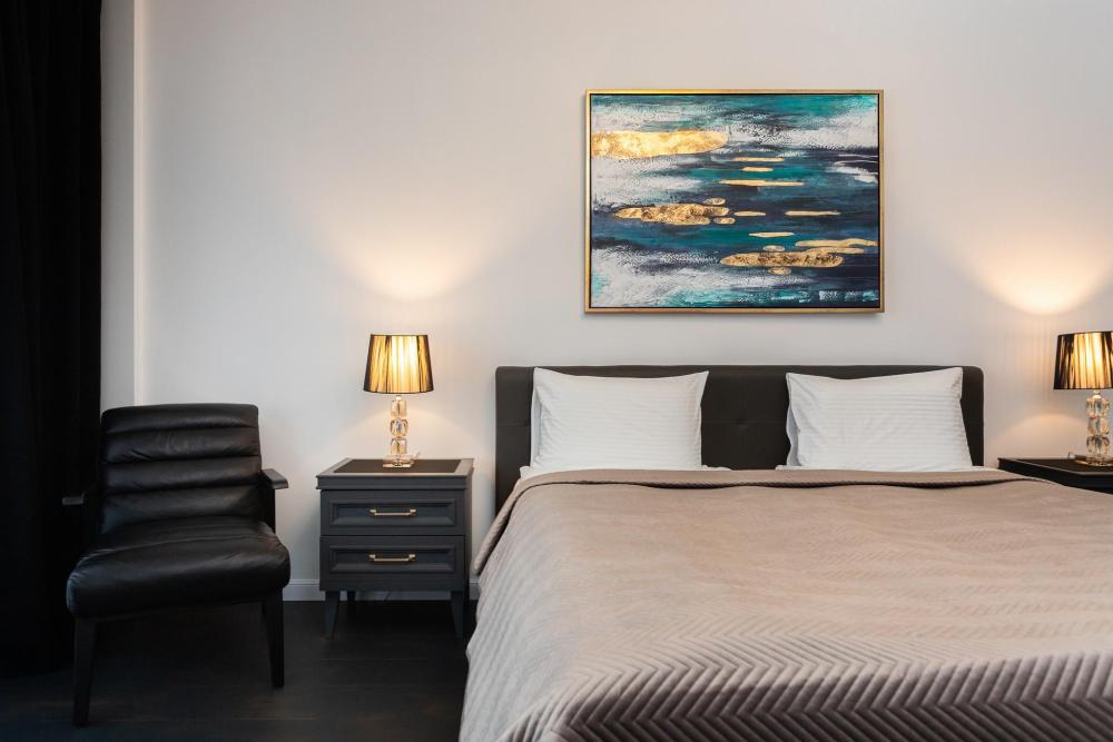 Комфортные однокомнатные апартаменты категории люкс. В распоряжении гостей апартаментов: кондиционер, двуспальная кровать и удобный раскладной диван, расположены в разных комнатах. Особенностью квартиры являются великолепная кровать, стол, ковер немецкой фабрики KARE, светильники и торшер голландской фабрики Eichholtz. Благодаря перепланировке обеденная зона обладает прекрасным полупанорамным видом на город.