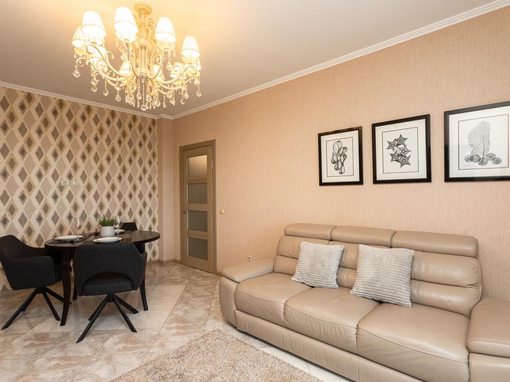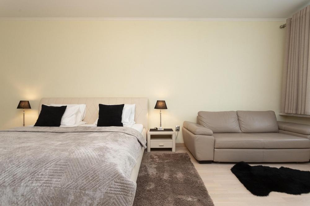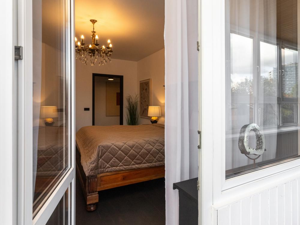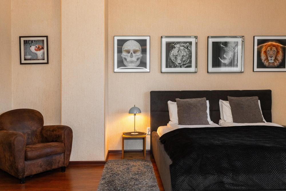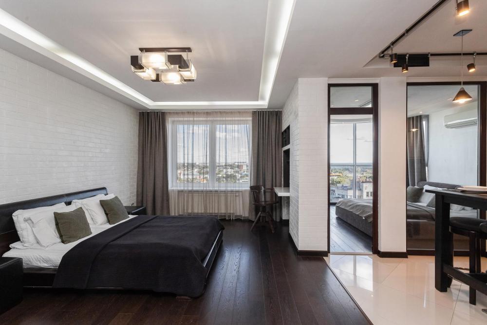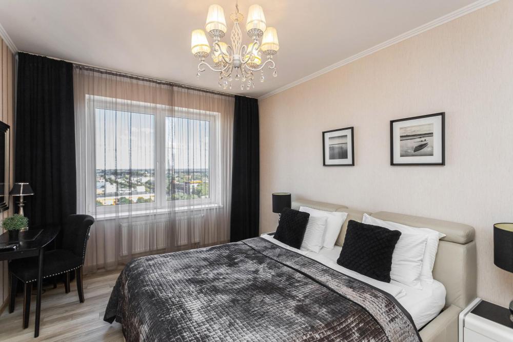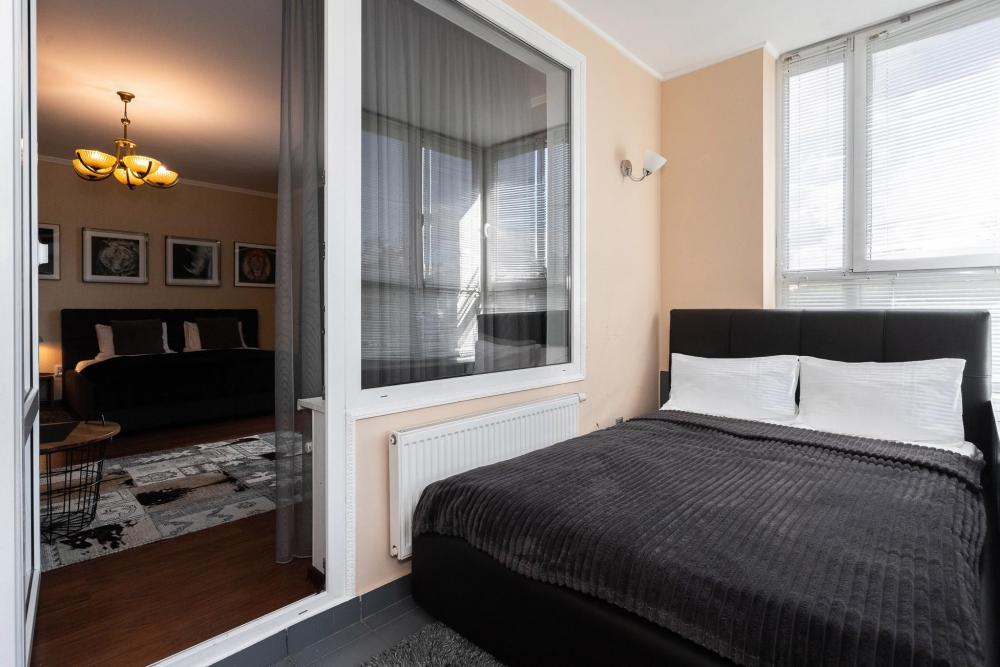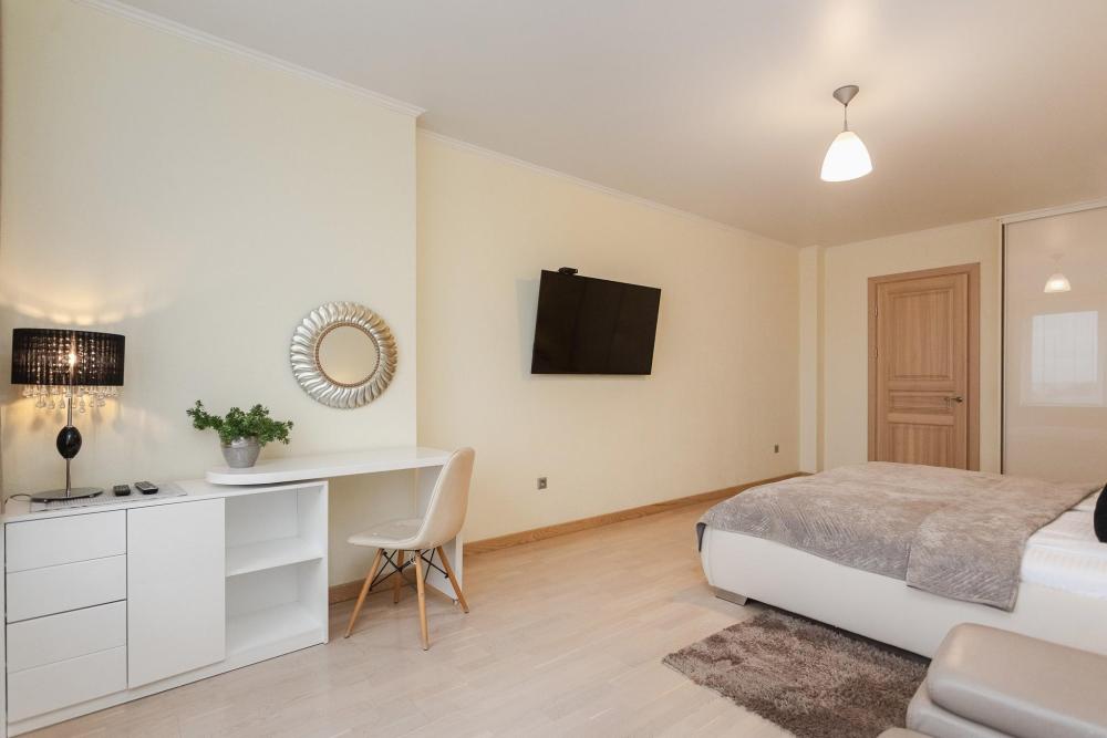 Комфортные однокомнатные апартаменты категории люкс. В распоряжении гостей апартаментов: кондиционер, двуспальная кровать и удобный раскладной диван, расположены в разных комнатах. Особенностью квартиры являются великолепная кровать, стол, ковер немецкой фабрики KARE, светильники и торшер голландской фабрики Eichholtz. Благодаря перепланировке обеденная зона обладает прекрасным полупанорамным видом на город.