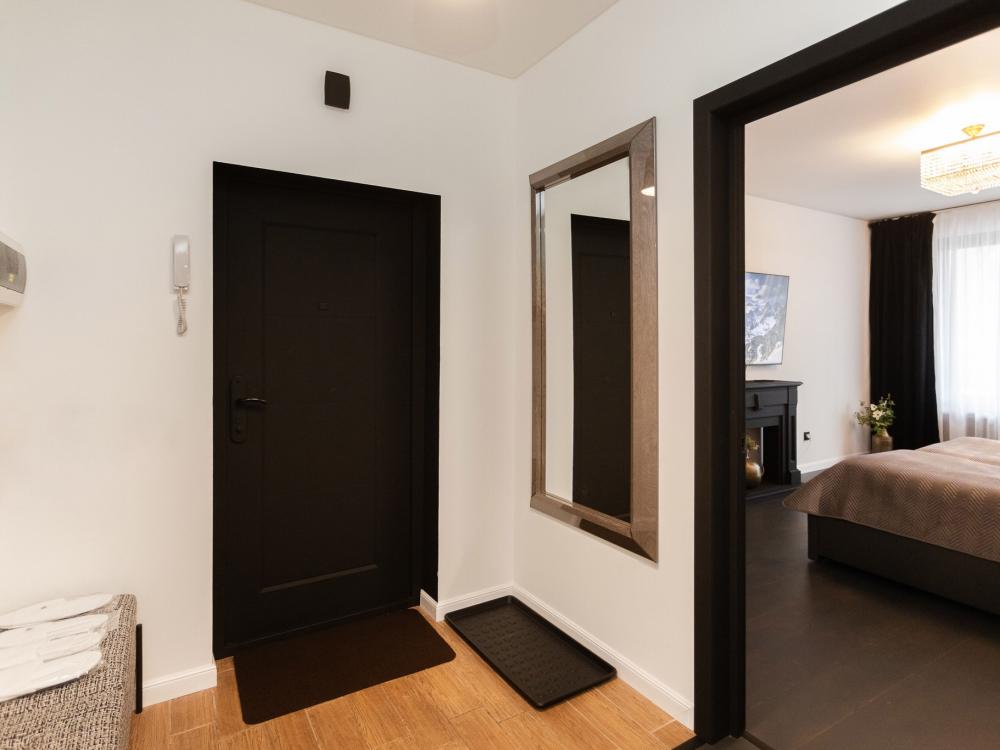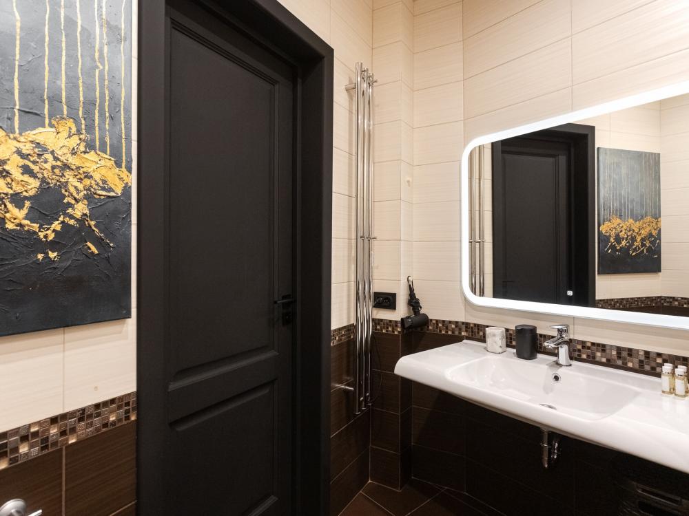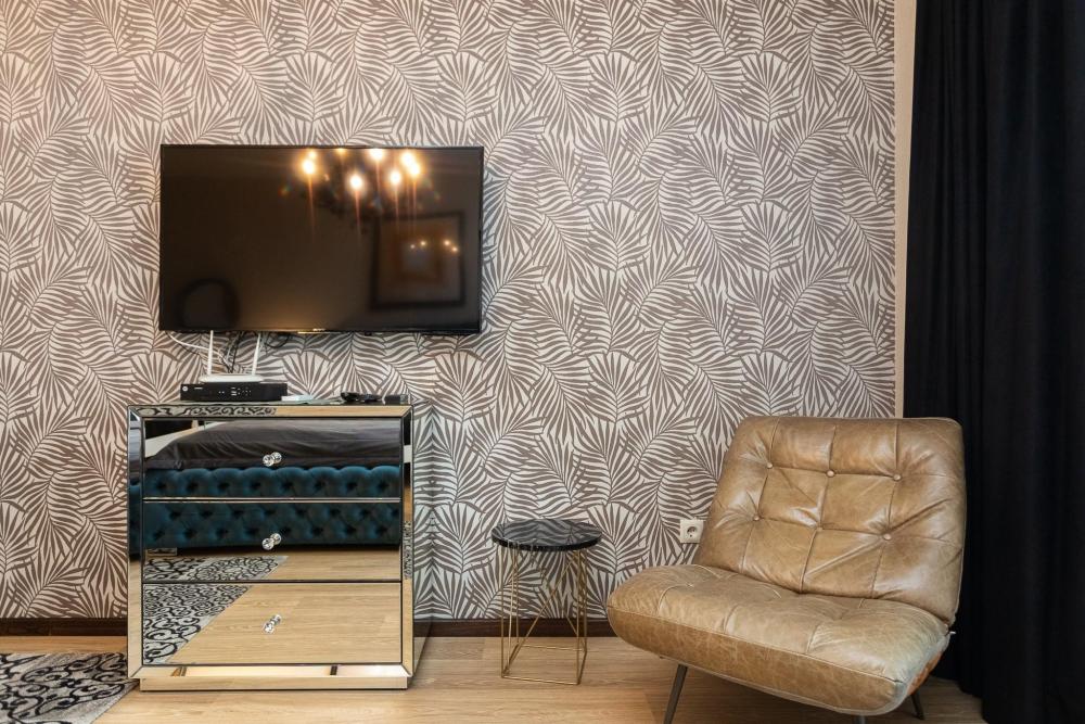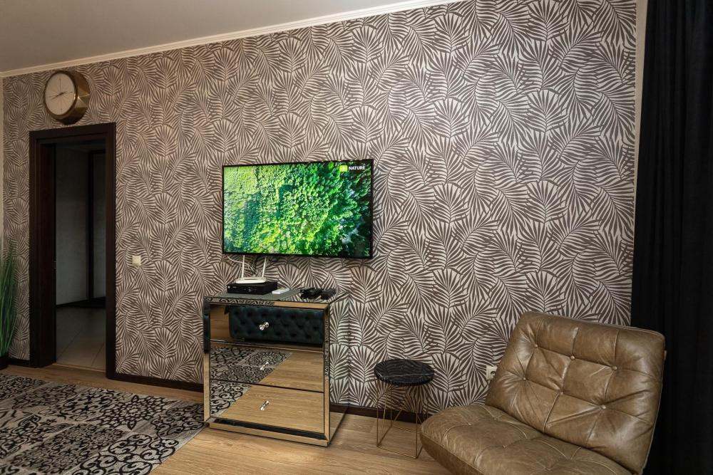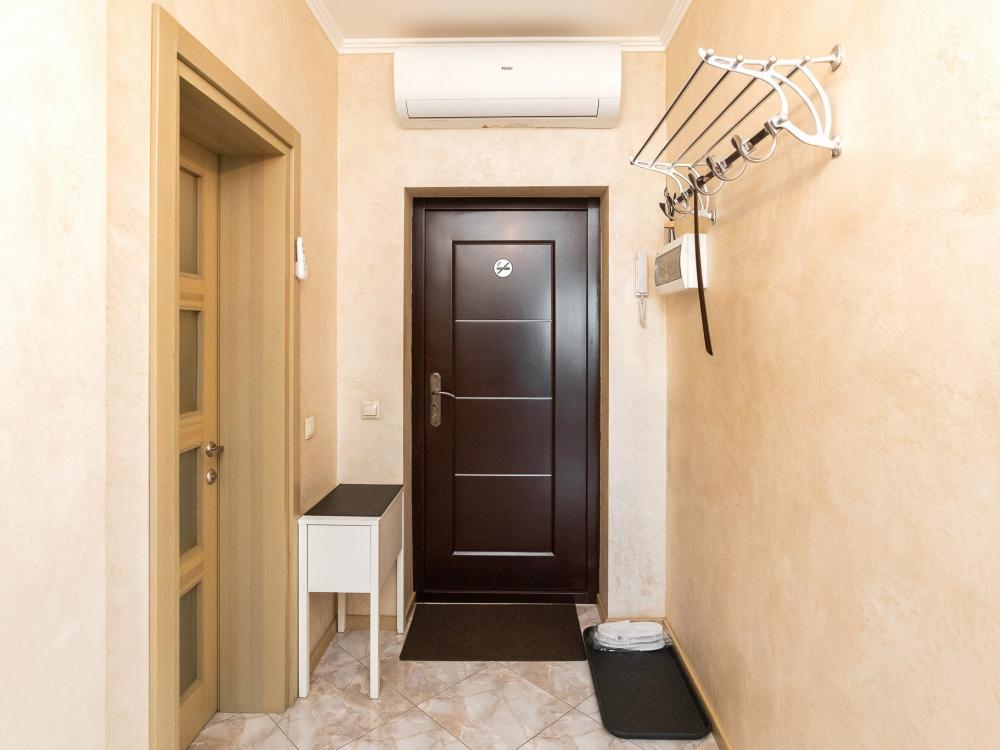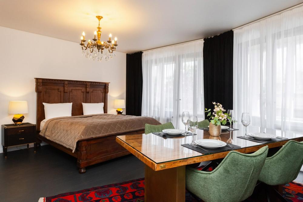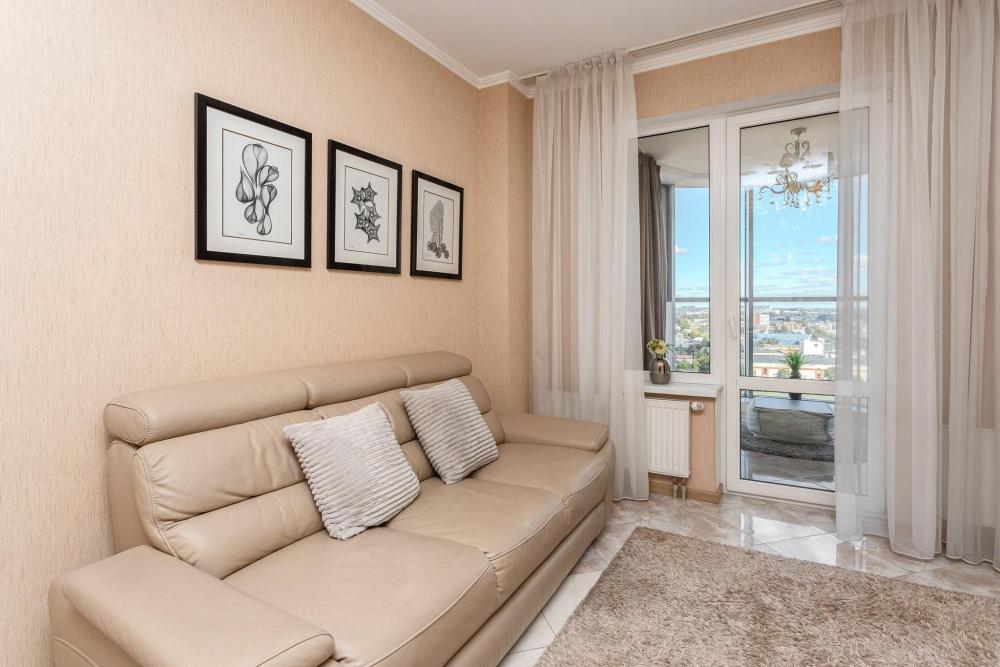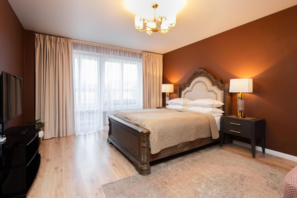 Комфортные однокомнатные апартаменты категории люкс. В распоряжении гостей апартаментов: кондиционер, двуспальная кровать и удобный раскладной диван, расположены в разных комнатах. Особенностью квартиры являются великолепная кровать, стол, ковер немецкой фабрики KARE, светильники и торшер голландской фабрики Eichholtz. Благодаря перепланировке обеденная зона обладает прекрасным полупанорамным видом на город.