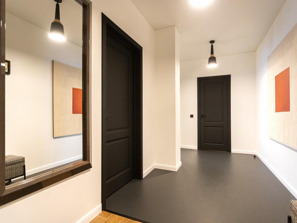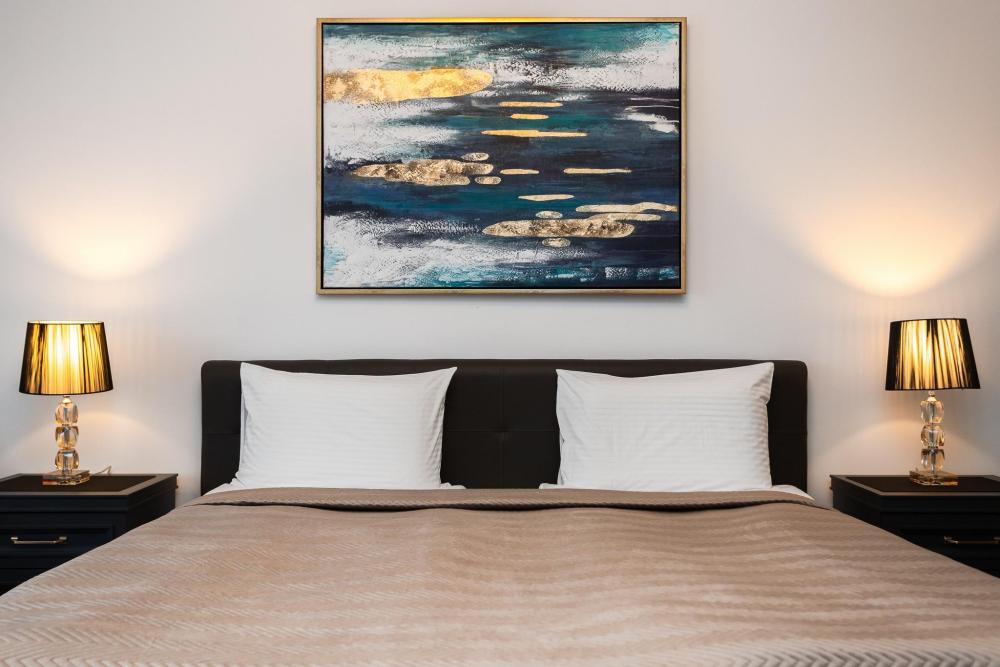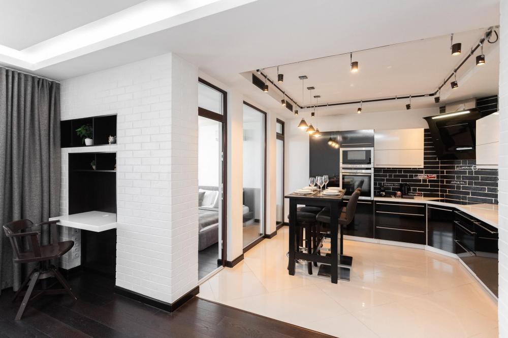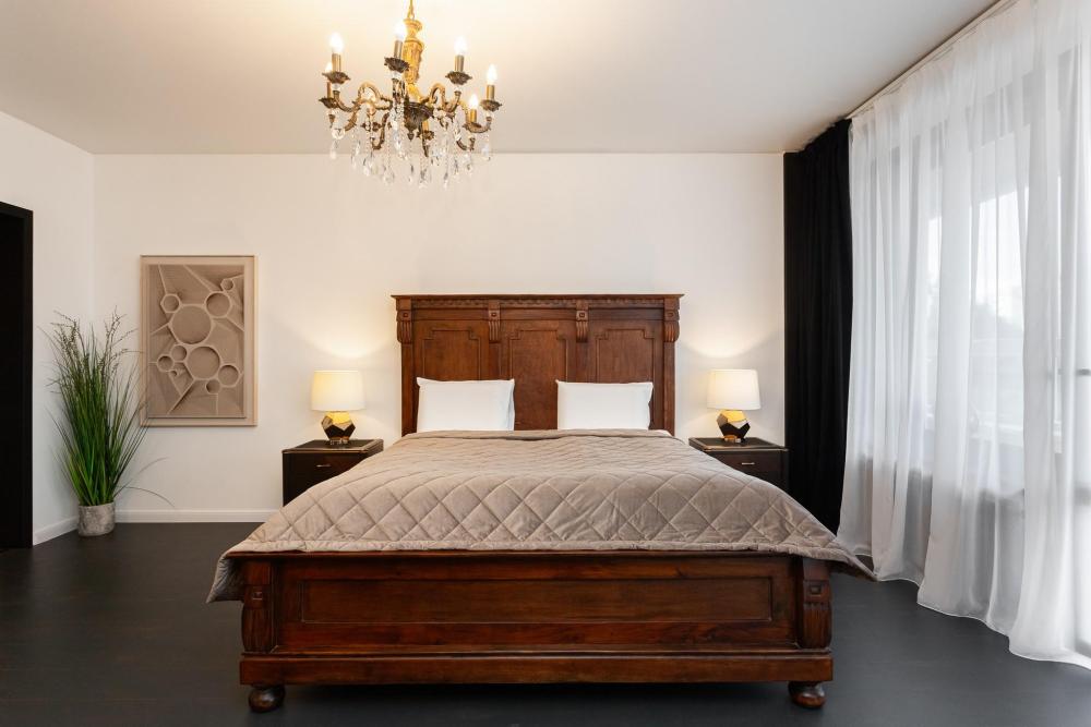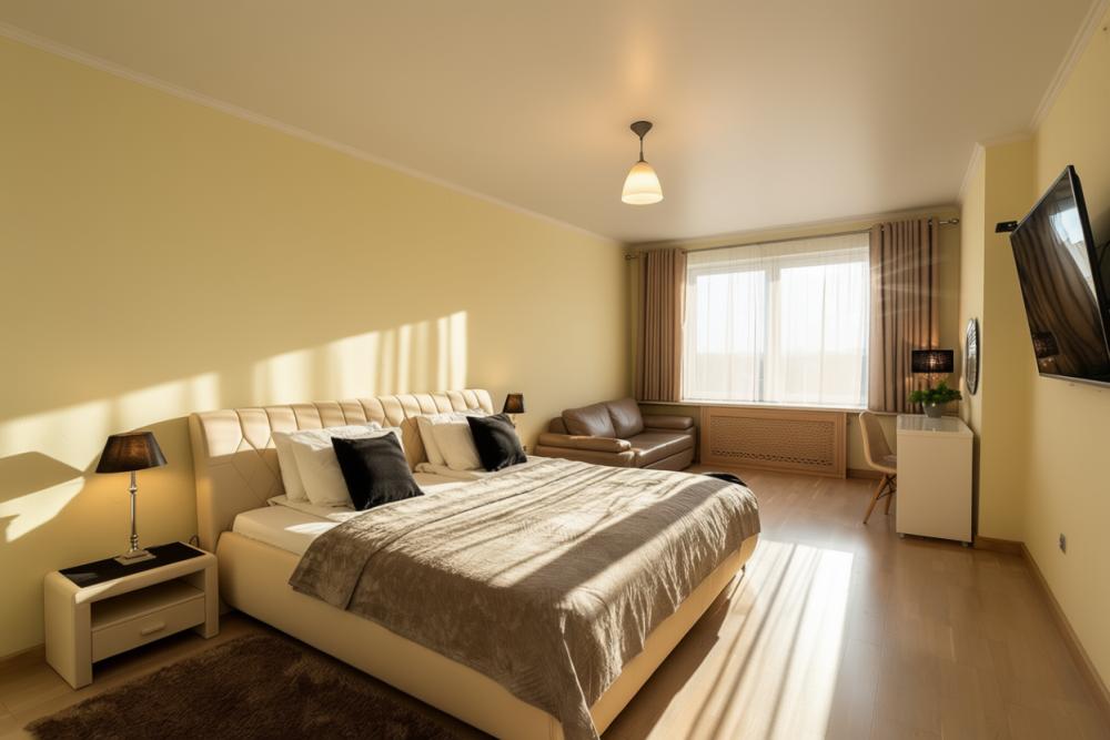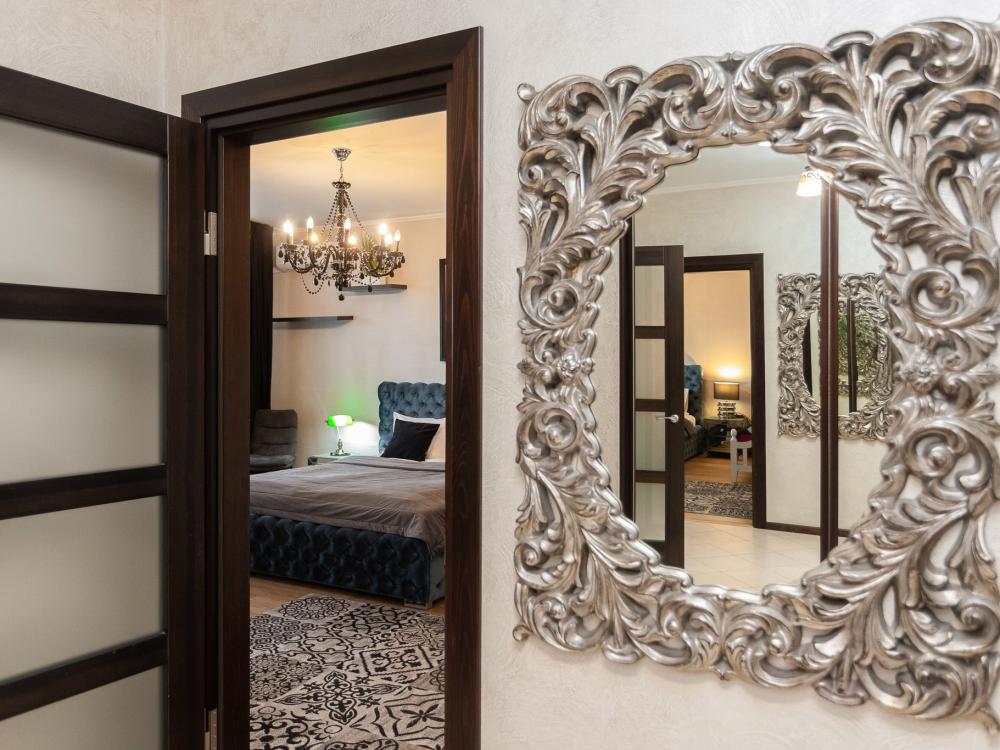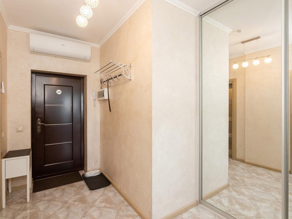 Комфортные однокомнатные апартаменты категории люкс. В распоряжении гостей апартаментов: кондиционер, двуспальная кровать и удобный раскладной диван, расположены в разных комнатах. Особенностью квартиры являются великолепная кровать, стол, ковер немецкой фабрики KARE, светильники и торшер голландской фабрики Eichholtz. Благодаря перепланировке обеденная зона обладает прекрасным полупанорамным видом на город.