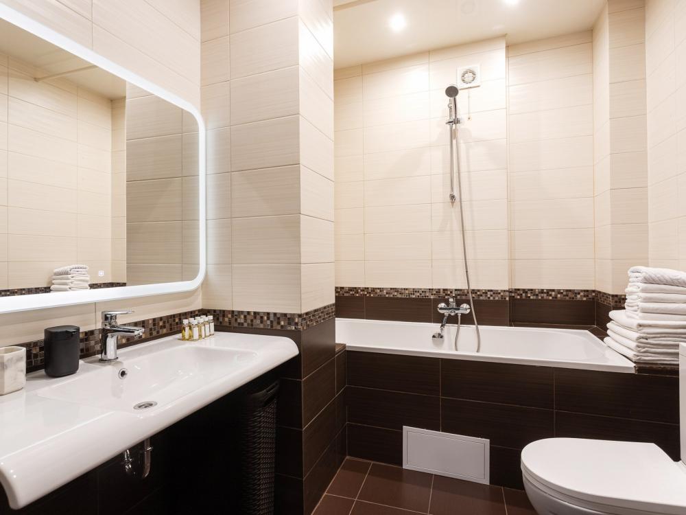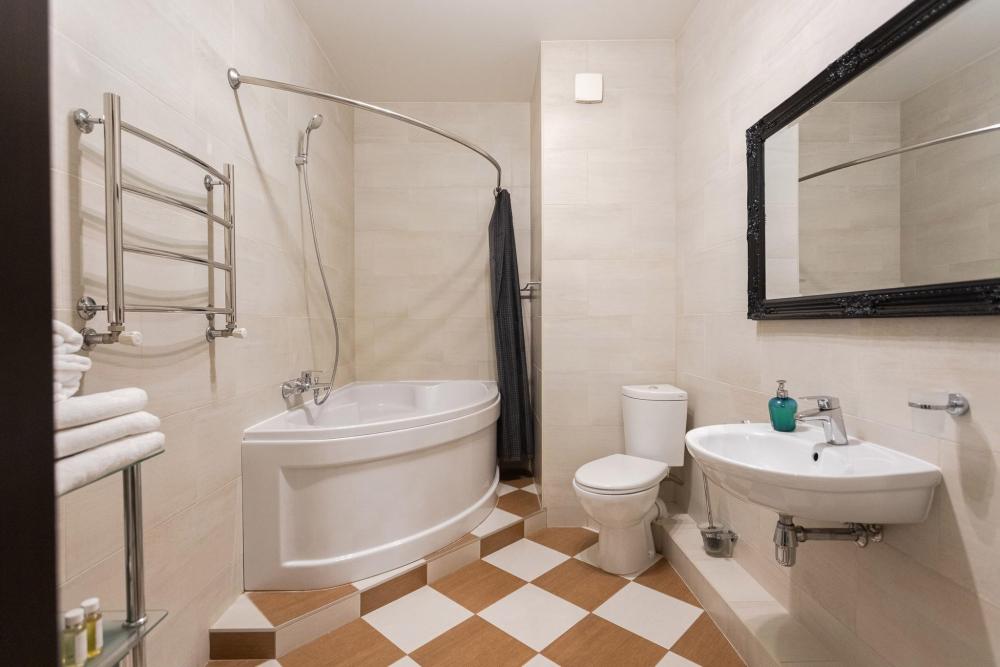 Однокомнатные апартаменты подходят для семьи из 4 человек, так родители могут спать в спальне на двуспальной кровати со спальным местом 180х200, а дети на отапливаемой лоджии на кровати 140х200. Каждому члену семьи предусмотрено отдельное односпальное одеяло. Ванная комната обустроена удобной душевой кабиной, которой при желании можно пользоваться как ванной.