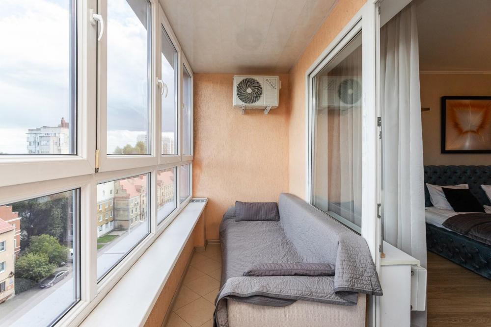 Однокомнатные апартаменты с панорамно остекленным эркером расположены на 10 этаже. На балконе предусмотрена удобная зона для отдыха, кресла из английского текстиля не только красивы, но и удобны. Квартира идеально подходит для 3 человек, т.к. для всех гостей спальное место предусмотрено на кровати. В данных апартаментах 2 удобные кровати со спальными местами 160х200 и 90х200. Кровати расположены в разных помещениях: в спальне и в отапливаемом эркере.
