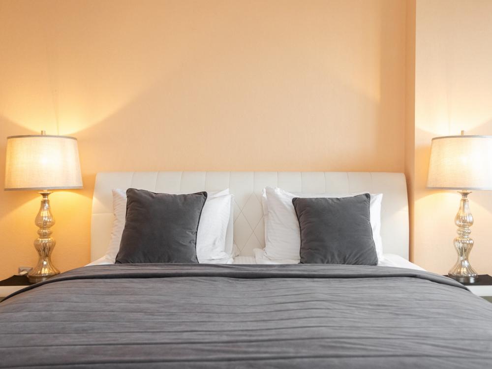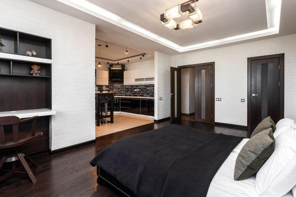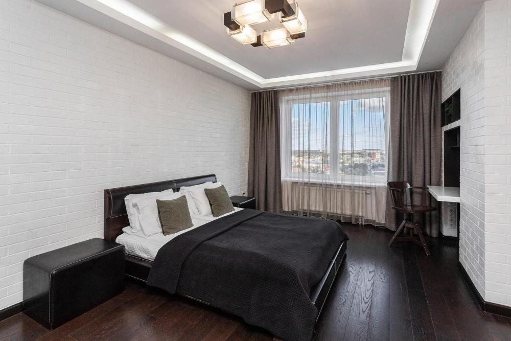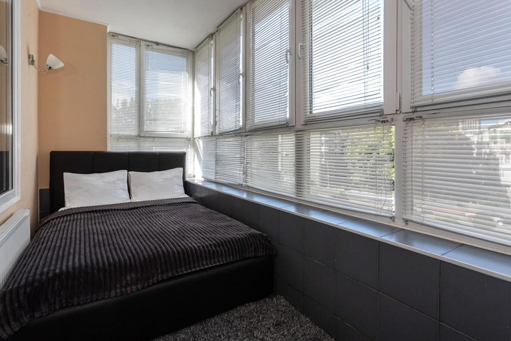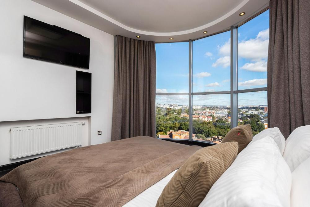 Однокомнатные апартаменты с панорамно остекленным эркером подходят тем, кто хочет вечером насладиться прекрасным видом на город. В квартире есть удобная кожаная кровать со спальным местом 180х200 и встроенным в изголовье столиком, который очень удобен при просмотре TV. Для третьего гостя предусмотрен раскладной кожаный диван.