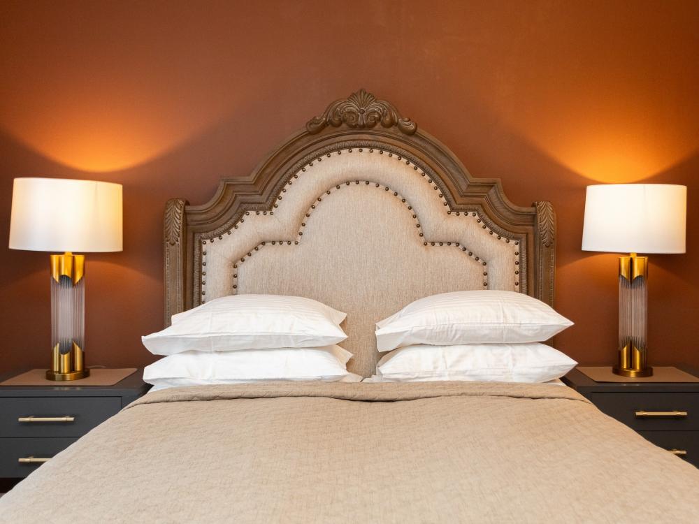 Однокомнатные апартаменты с панорамно остекленным эркером расположена на 11 этаже. Особенностью данных апартаментов является деревянная кровать со спальным местом 200х200. Массивные деревянные тумбочки, кровать и письменный стол украшают спальню и делают комфортным пребывание гостей. В кухне-гостиной главными доминантами интерьера выступают двухдверный холодильник Samsung, деревянная консоль и диван, раскладывающийся до спального места 160х200.