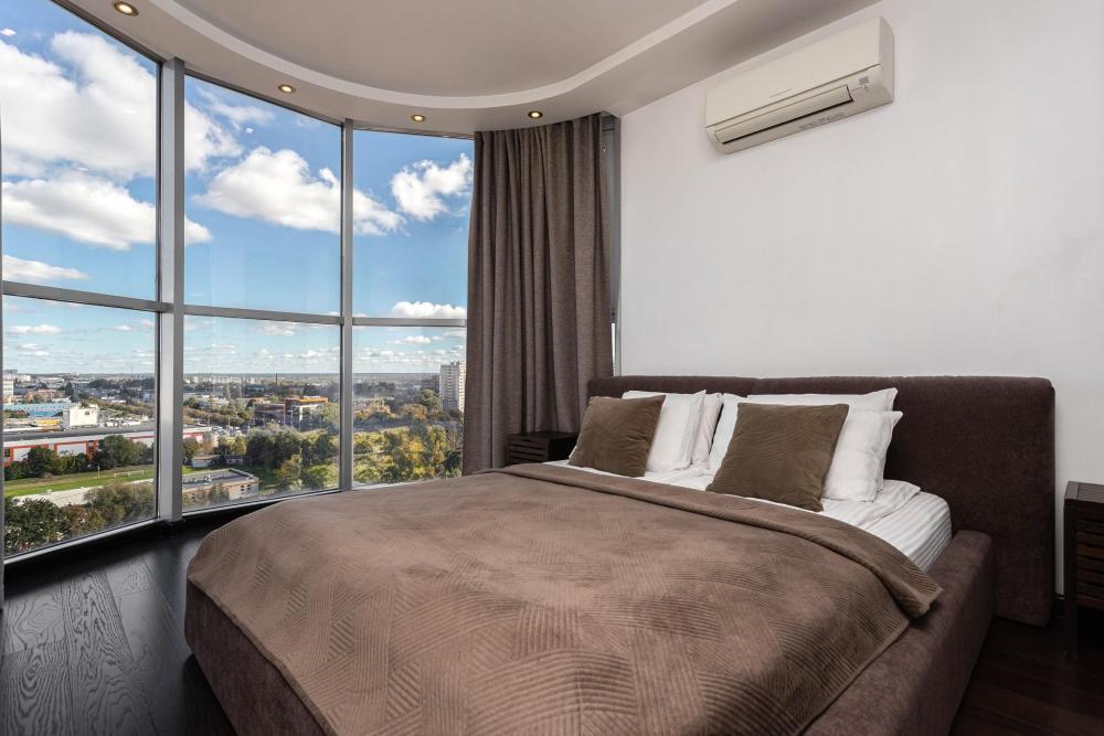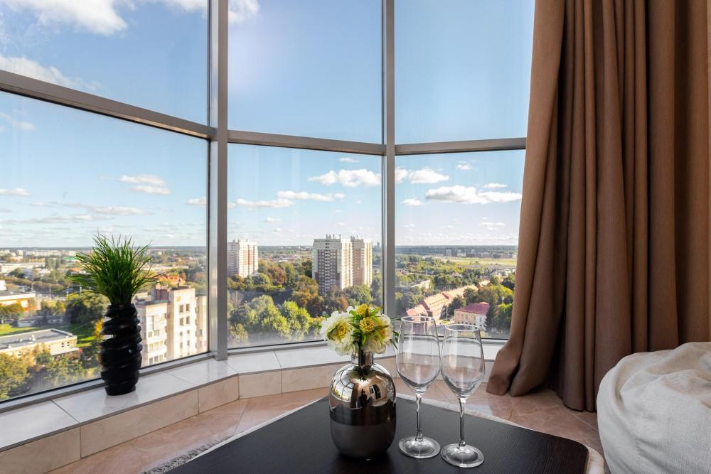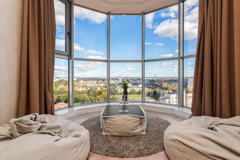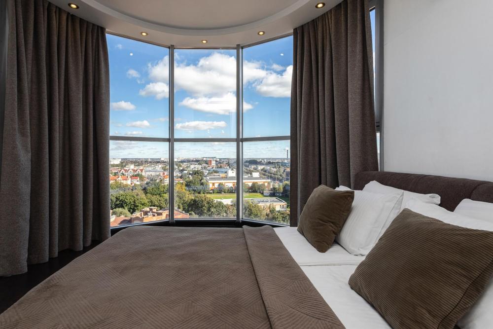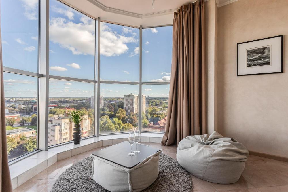 Апартаменты с 2 спальнями и панорамным остеклением расположены на 12 этаже. Потрясающим видом на город можно насладиться из кухни-гостиной площадью 65м2. К одной из спален примыкает просторный гардероб. В квартире 2 санузла, один совмещенный с ванной, второй туалет. В квартире имеются: фен, утюг, гладильная доска, пылесос, полотенца (одно большое, одно среднее на каждого проживающего), шампуни, гель для душа, жидкое мыло, постельное белье, чай, сладкий презент, кухонное полотенце, моющие средства для посуды, средства индивидуальной гигиены, столовые приборы, посуда, электрический чайник, микроволновка, кабельное ТВ, высокоскоростной Wi-fi, стиральная машина, тапочки, холодильник.