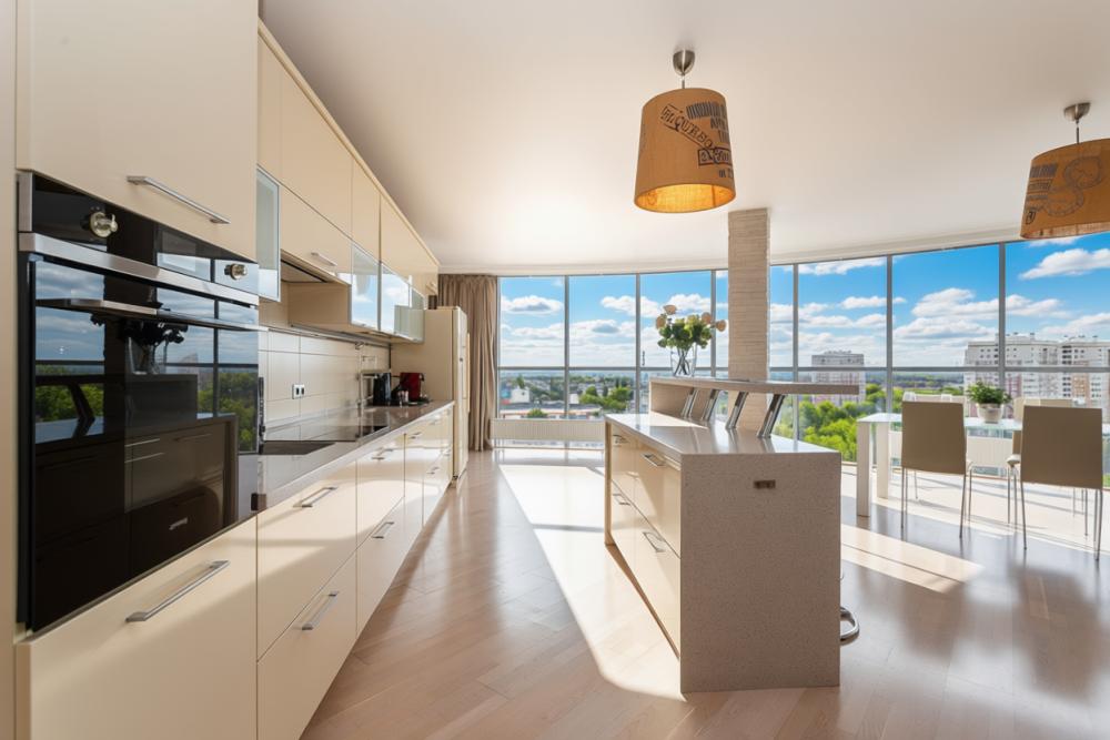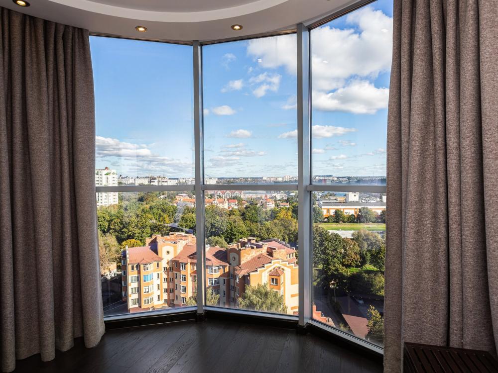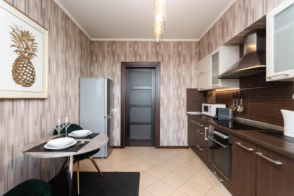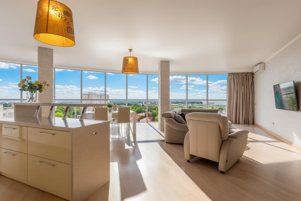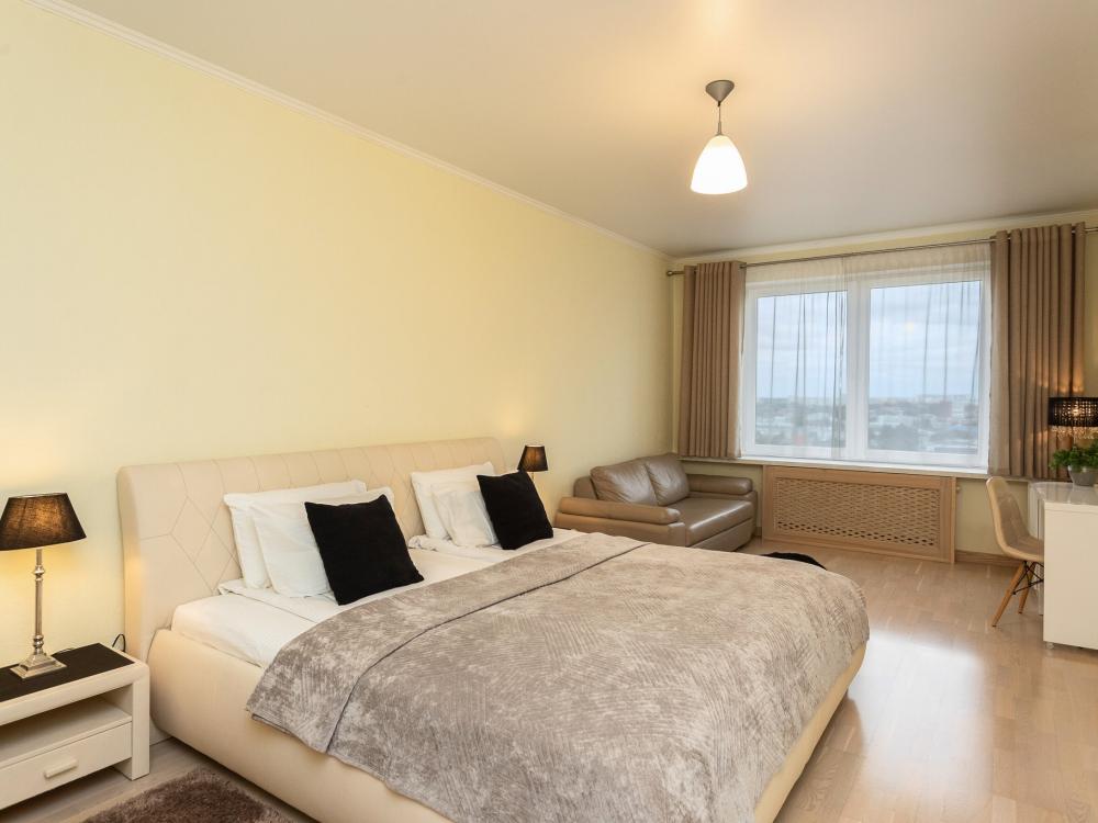 Апартаменты с 2 спальнями и панорамным остеклением расположены на 12 этаже. Потрясающим видом на город можно насладиться из кухни-гостиной площадью 65м2. К одной из спален примыкает просторный гардероб. В квартире 2 санузла, один совмещенный с ванной, второй туалет. В квартире имеются: фен, утюг, гладильная доска, пылесос, полотенца (одно большое, одно среднее на каждого проживающего), шампуни, гель для душа, жидкое мыло, постельное белье, чай, сладкий презент, кухонное полотенце, моющие средства для посуды, средства индивидуальной гигиены, столовые приборы, посуда, электрический чайник, микроволновка, кабельное ТВ, высокоскоростной Wi-fi, стиральная машина, тапочки, холодильник.