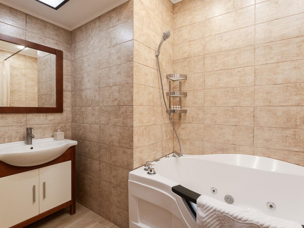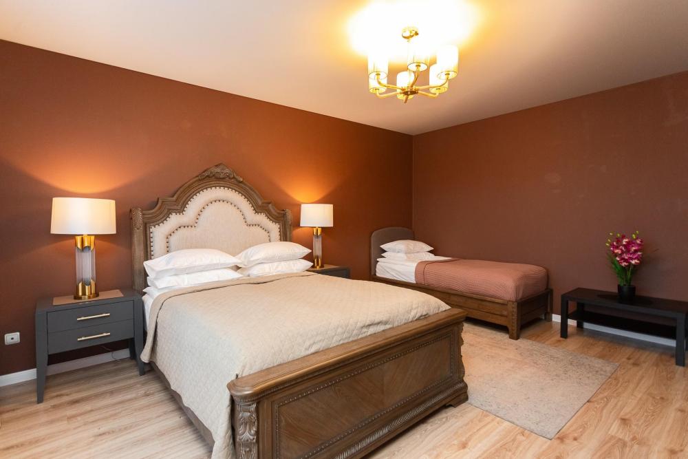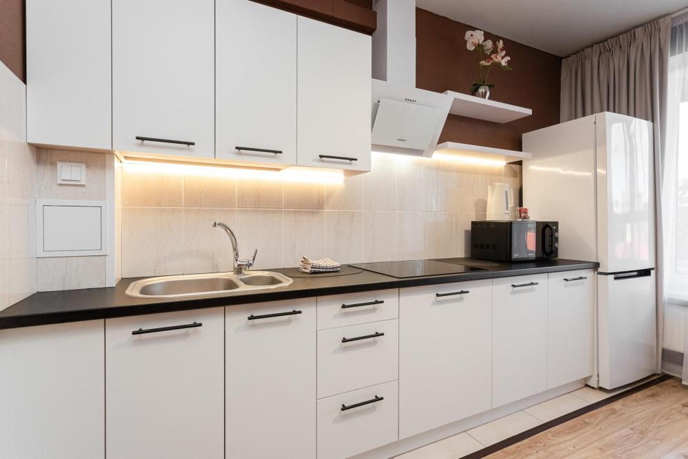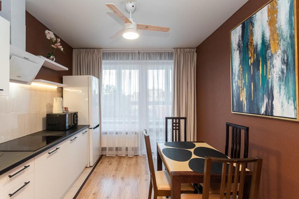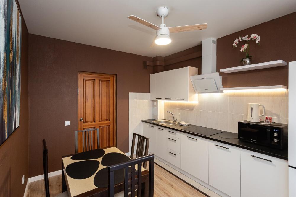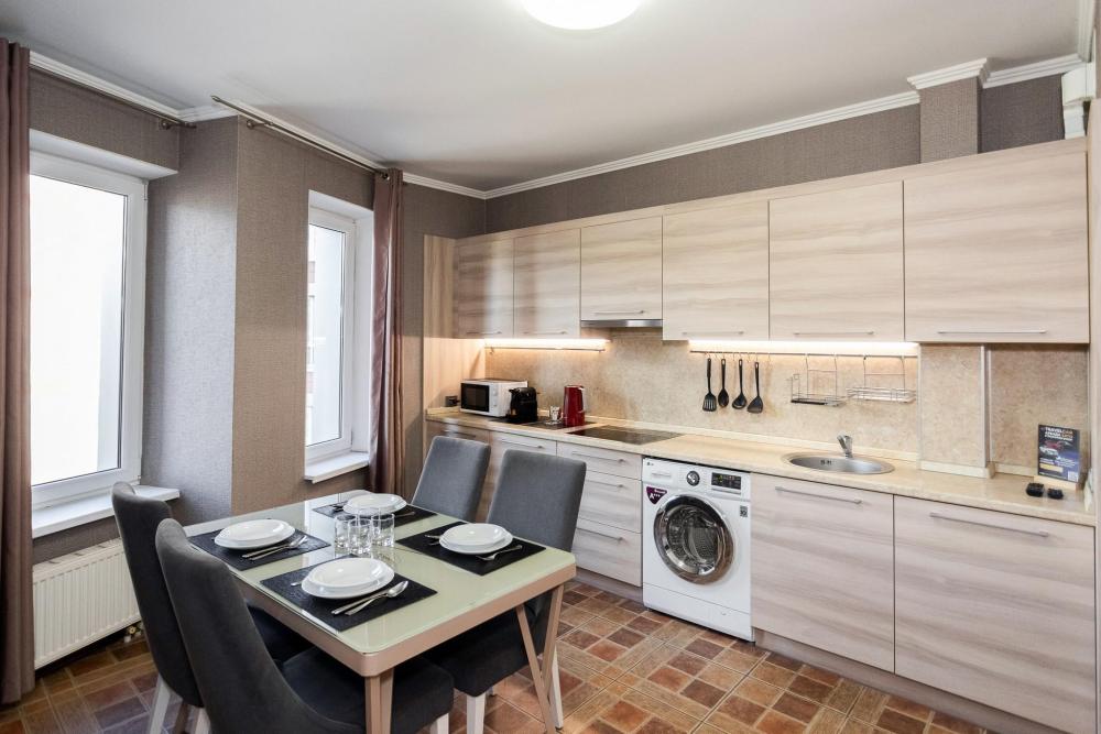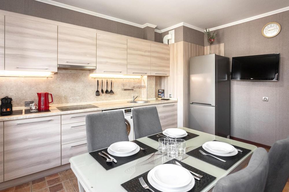 Апартаменты идеальный выбор для большой семьи. Семья из 6 человек с комфортом разместится в данных апартаментах. В квартире 2 кровати со спальными местами 180х200, 160х200 и удобный раскладной диван со спальным местом 160х200. Для каждого человека предусмотрено свое односпальное одеяло. Главное украшение квартиры - мозаичный стол, расположенный в кухне гостиной. В квартире имеются: фен, утюг, гладильная доска, пылесос, полотенца (одно большое, одно среднее на каждого проживающего), шампуни, гель для душа, жидкое мыло, постельное белье, чай, сладкий презент, кухонное полотенце, моющие средства для посуды, средства индивидуальной гигиены, столовые приборы, посуда, электрический чайник, микроволновка, кабельное ТВ, высокоскоростной Wi-fi, стиральная машина, тапочки, холодильник.