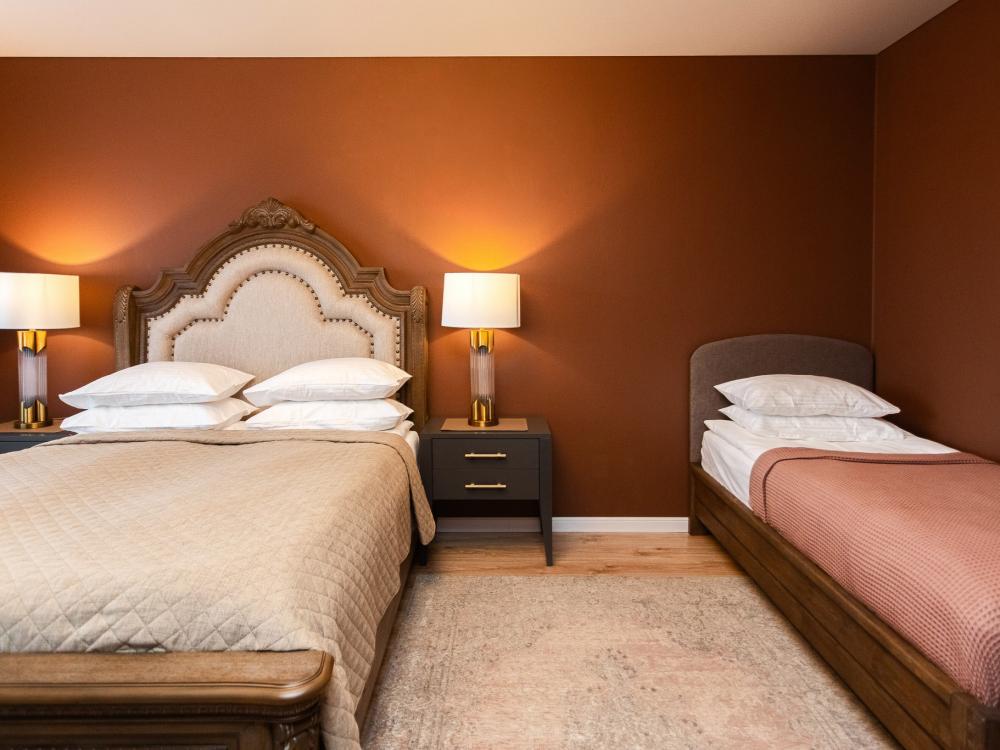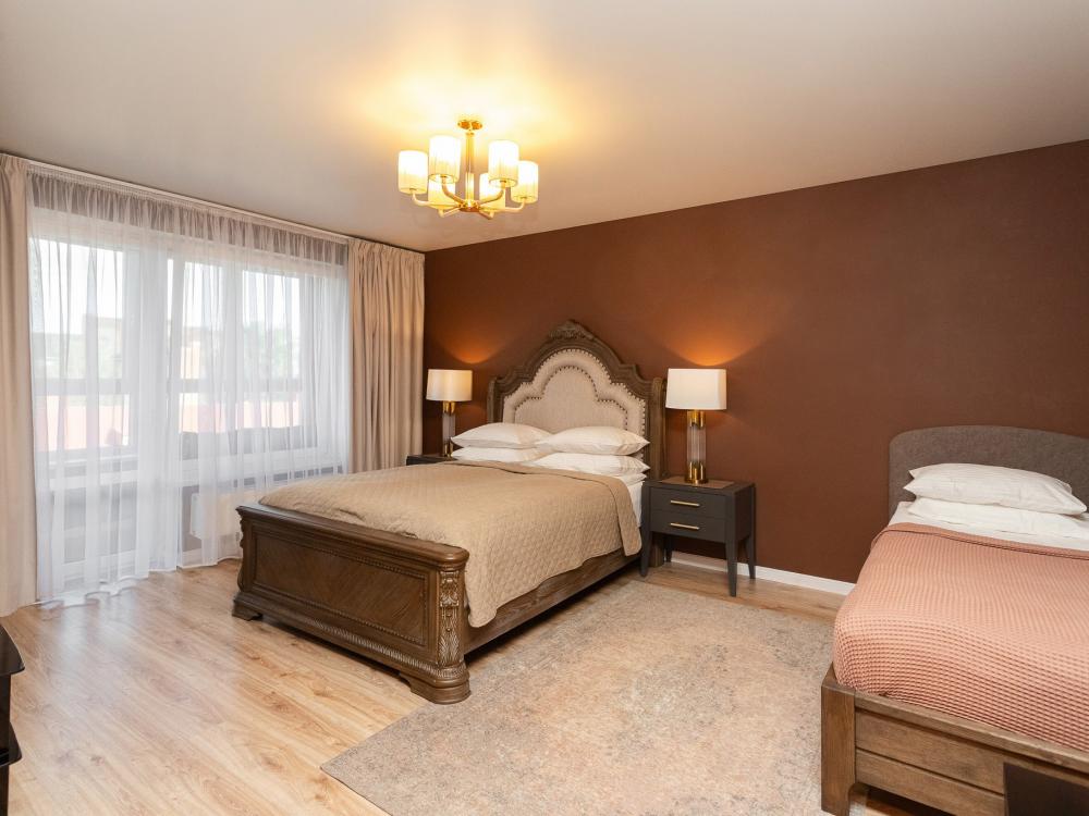 Апартаменты с панорамно остекленным эркером расположены на 11 этаже. Изюминкой данных апартаментов является деревянная кровать со спальным местом 200х200. Массивные деревянные тумбочки, кровать и письменный стол не только украшают спальню, но и делают комфортным пребывание в этих апартаментах. В кухне гостиной главными доминантами интерьера выступают двухдверный холодильник Samsung, деревянная консоль и диван, раскладывающийся до спального места 160х200. В квартире имеются: фен, утюг, гладильная доска, пылесос, полотенца (одно большое, одно среднее на каждого проживающего), шампуни, гель для душа, жидкое мыло, постельное белье, чай, сладкий презент, кухонное полотенце, моющие средства для посуды, средства индивидуальной гигиены, столовые приборы, посуда, электрический чайник, микроволновка, кабельное ТВ, высокоскоростной Wi-fi, стиральная машина, тапочки, холодильник.