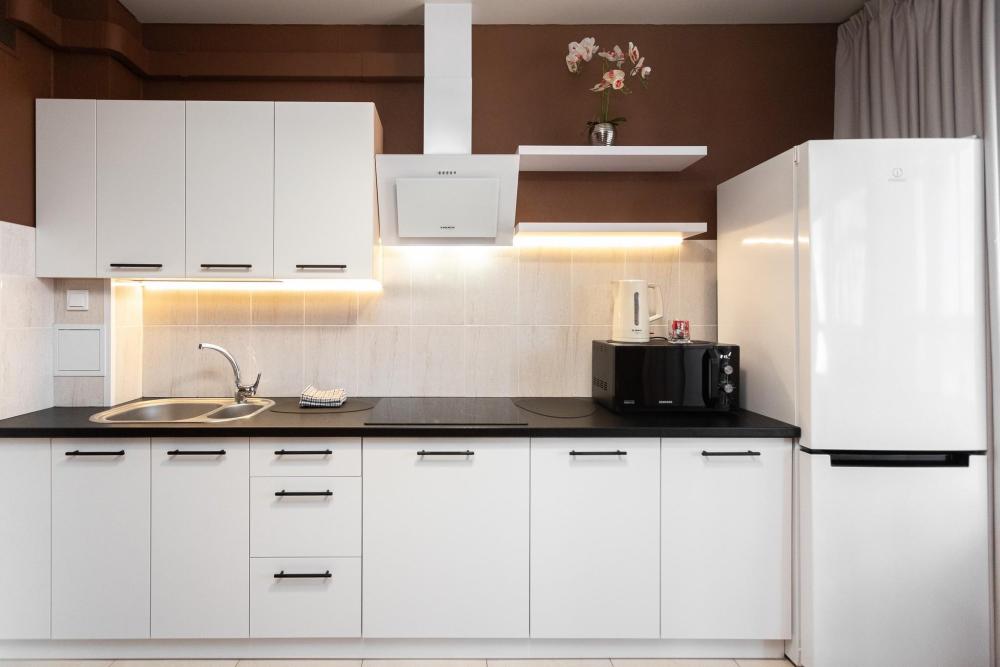 Апартаменты с панорамно остекленным эркером подходят тем, кто хочет вечером насладиться прекрасным видом на город. В квартире удобная кожаная кровать со спальным местом 180х200 и встроенным в изголовье столиком, который очень удобен при просмотре TV. Для третьего гостя предусмотрен раскладной кожаный диван. Установлен кондиционер. В квартире имеются: фен, утюг, гладильная доска, пылесос, полотенца (одно большое, одно среднее на каждого проживающего), шампуни, гель для душа, жидкое мыло, постельное белье, чай, сладкий презент, кухонное полотенце, моющие средства для посуды, средства индивидуальной гигиены, столовые приборы, посуда, электрический чайник, микроволновка, кабельное ТВ, высокоскоростной Wi-fi, стиральная машина, тапочки, холодильник.