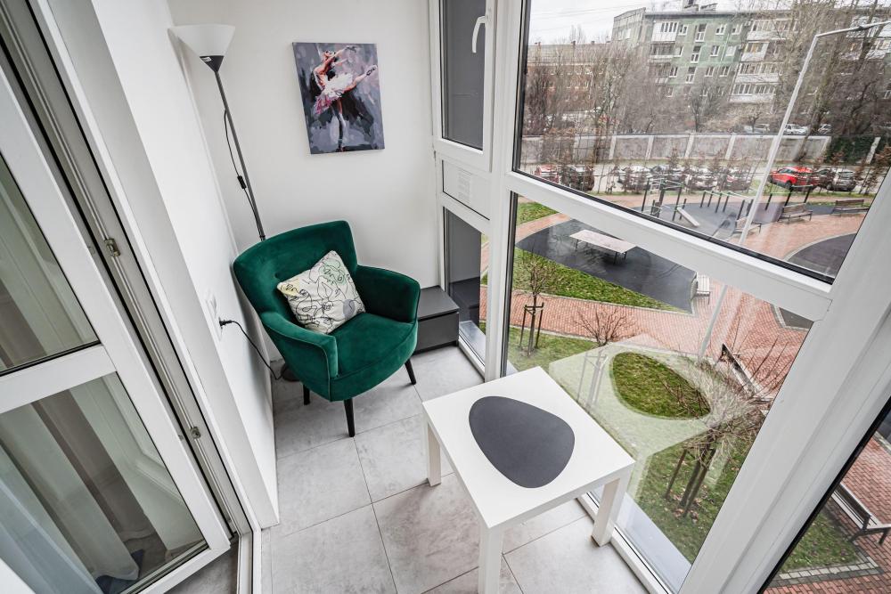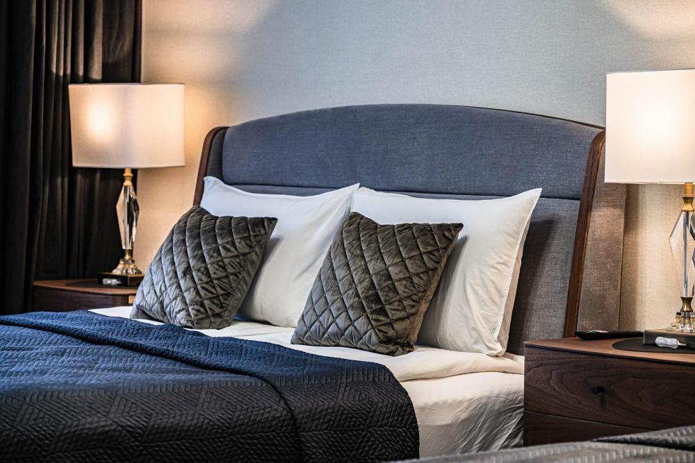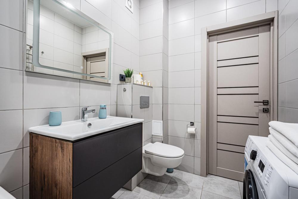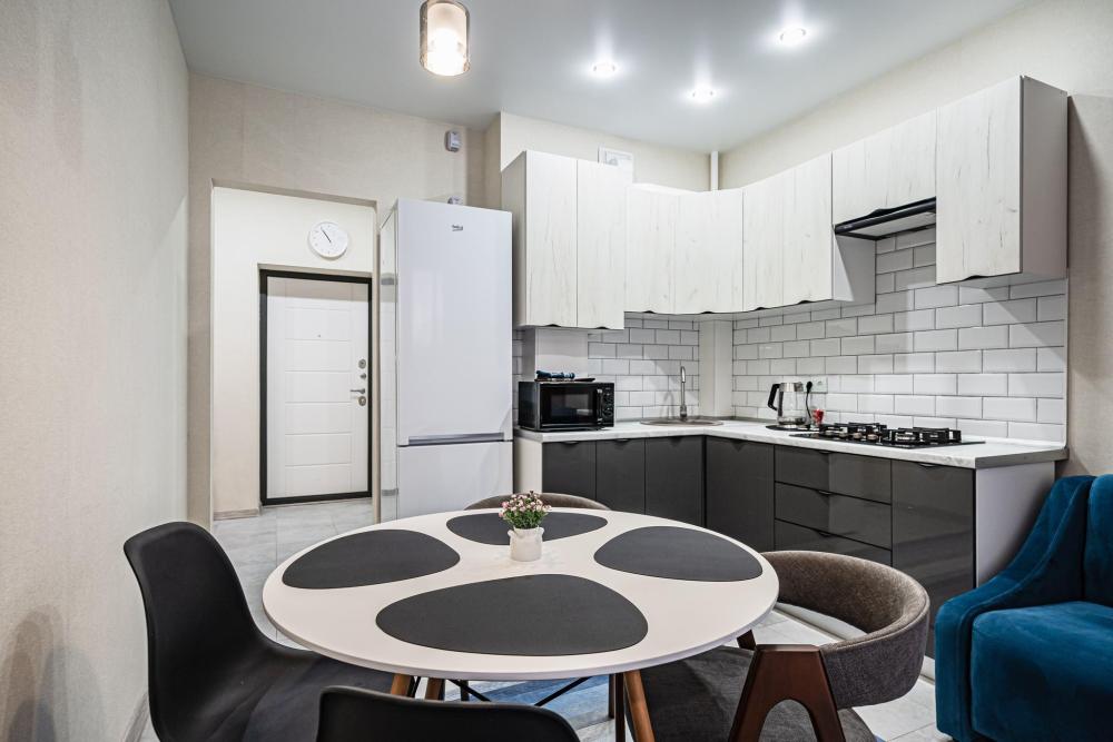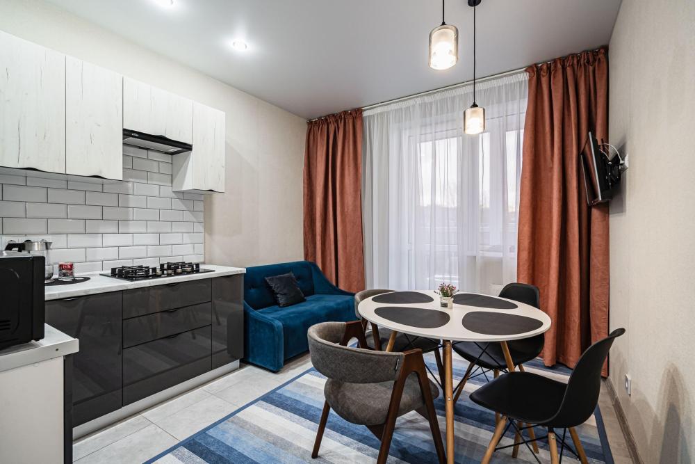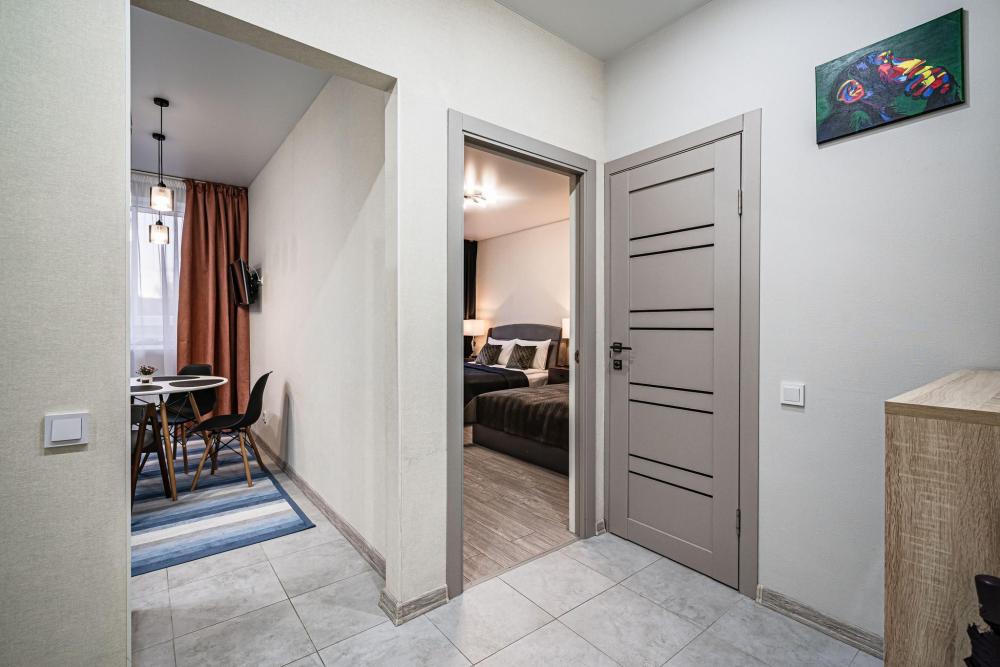 Апартаменты выполнены в светлых тонах. Освещение в апартаментах сочетает в себе точечные светильники и элегантные люстры, создавая уютную и расслабляющую атмосферу. Золотистые акценты в интерьере придают ему благородство, а качественная мебель и декор создают атмосферу роскоши. Кухня оборудована современной техникой, включая посудомойку. Двуспальная кровать размером 160х200см обеспечивает комфорт во время сна. Лоджия превращена в уютную зону отдыха с качелями, где можно расслабиться после долгого дня и насладиться спокойствием. В квартире имеются: фен, утюг, гладильная доска, пылесос, полотенца (одно большое, одно среднее на каждого проживающего), шампуни, гель для душа, жидкое мыло, постельное белье, чай, сладкий презент, кухонное полотенце, моющие средства для посуды, средства индивидуальной гигиены, столовые приборы, посуда, электрический чайник, микроволновка, кабельное ТВ, высокоскоростной Wi-fi, стиральная машина, тапочки, холодильник.