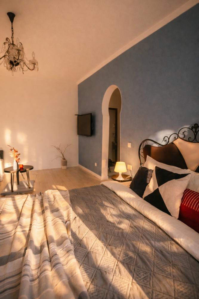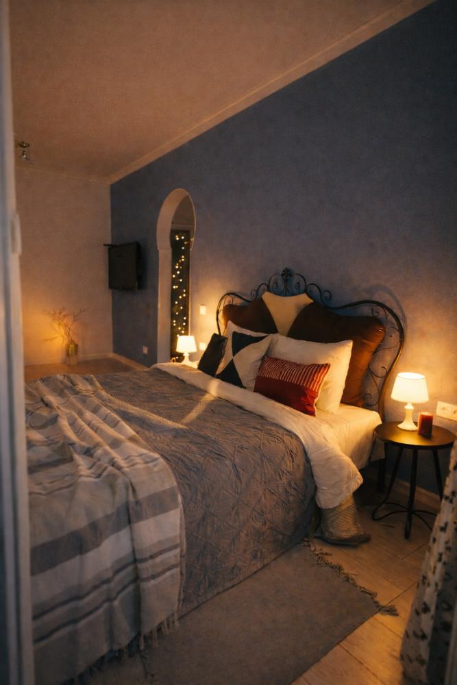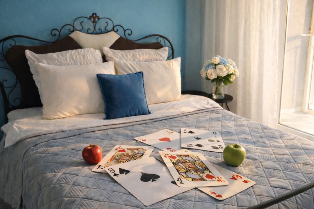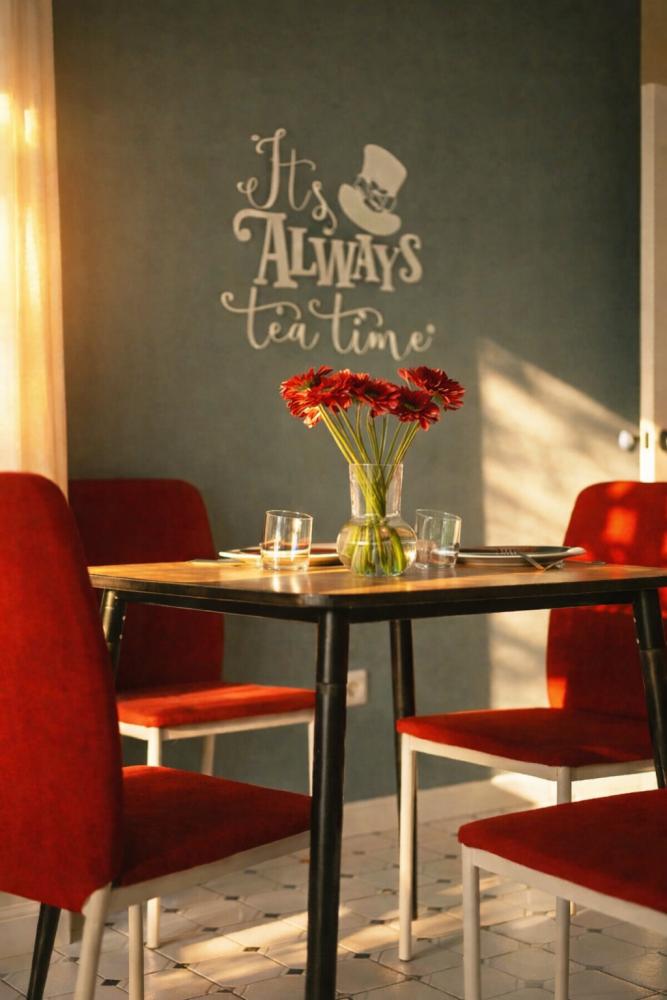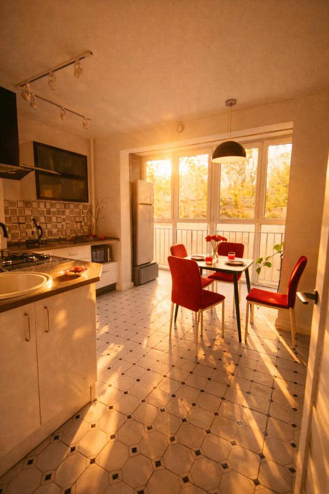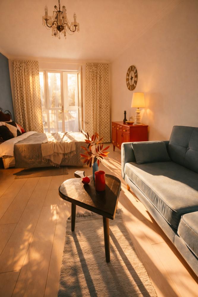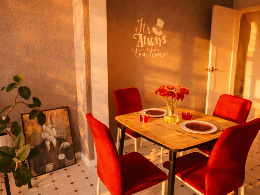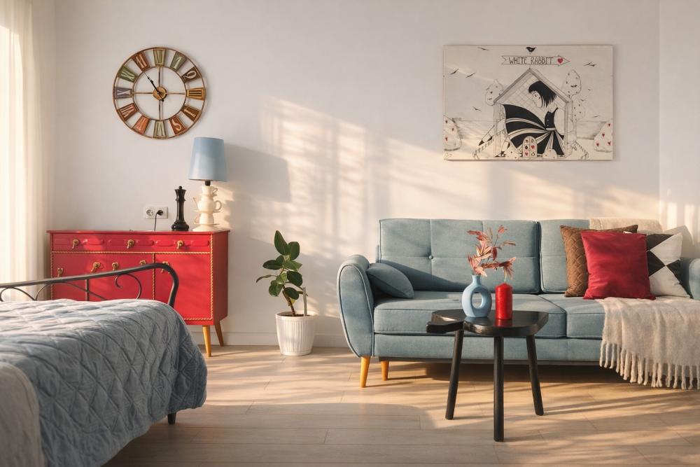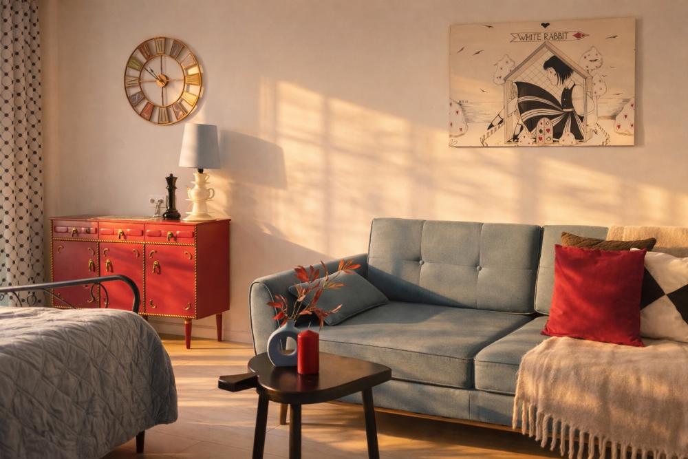 Однокомнатные апартаменты «Алиса в стране чудес». Для удобства гостей комфортабельная двуспальная кровать и большой раскладной диван. На просторной кухне, есть вся необходимая бытовая техника. К услугам гостей постельное белье, полотенца, посуда, необходимая техника, гигиенические принадлежности, телевизор и высокоскоростной Wi-Fi, стиральная машина, сушилка, фен, утюг, гладильная доска. Также по запросу предоставляются кроватка-манеж, горшок, подставка для ног в ванную и разнообразные игрушки.