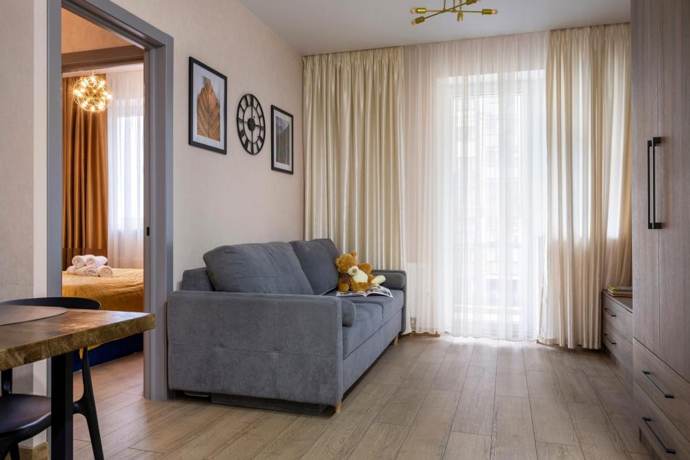 Blue apart - стильная современная двухкомнатная квартира в новом ЖК. Находится в 5 минутах ходьбы от РАНХиГС, рядом улицы Артиллерийская, Аэропортная, Гагарина. Расстояние до железнодорожного вокзала Калининград Южный составляет 5км, Калининград Северный 3км, а до международного аэропорта Храброво 15км. Расстояние до Верхнего озера 1,5 км, до Музея Янтаря 2 км. Расстояние до курортных городов Балтийского моря до Зеленоградска составляет 23км, до Светлогорска 35км. В квартире с комфортом могут разместиться четыре человека. В квартире есть: фен, телевизор с кабельными каналами. Кухня оснащена: холодильником, плитой, электрическим чайником, микроволновой печью Вблизи от дома: магазины (Евроспар, минимаркет на 1 этаже дома) банкомат, аптеки, хозмагазин. Прогулка от здания квартиры до различных кафе и ресторанов занимает не более 2 минут. Кафе есть на 1 этаже дома. Напротив дома остановка общественного транспорта.