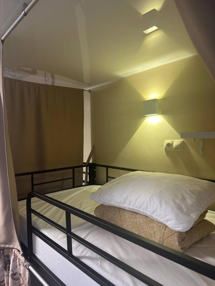 Нижнее спальное место на двухъярусной кровати. Все кровати оборудованы постельными принадлежностями, полотенцем 50/90 см, индивидуальным освещением, полочками, шторками, розетками. В каждой комнате есть письменный стол, зеркало, фен, стулья. Санузел раздельный, в душевой установлены диспансеры с мылом для рук, гелем для тела.