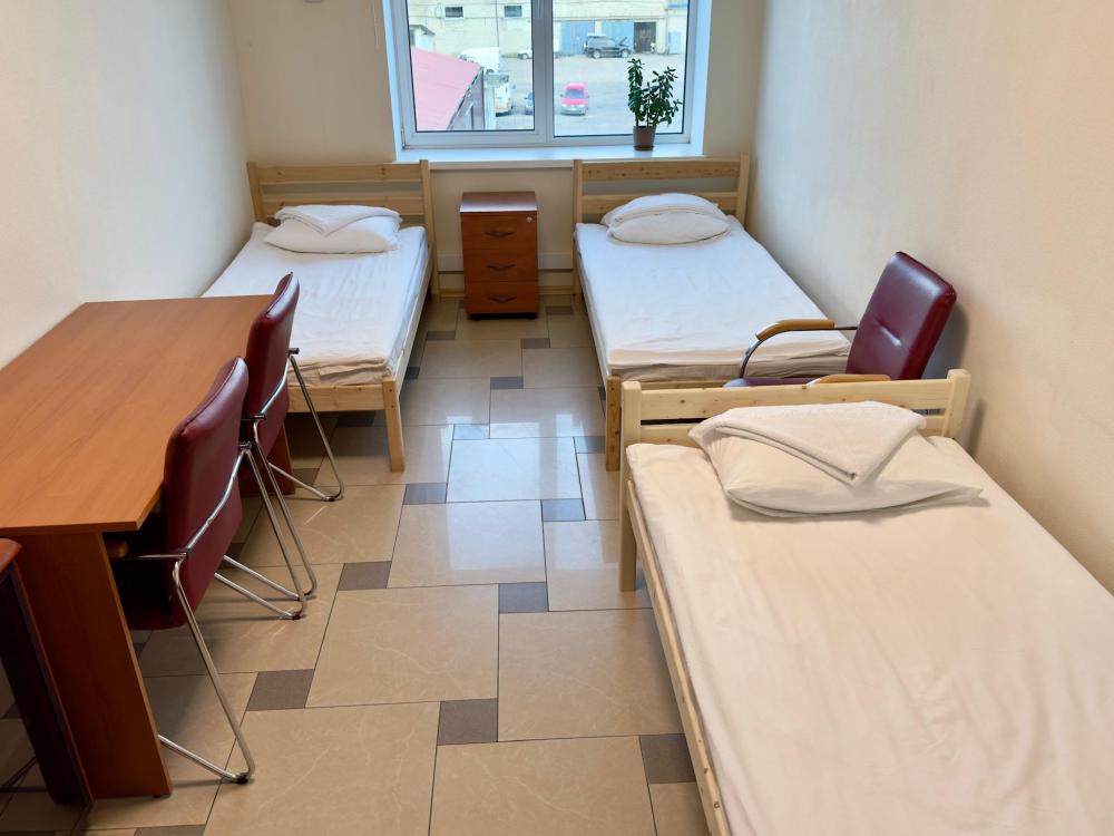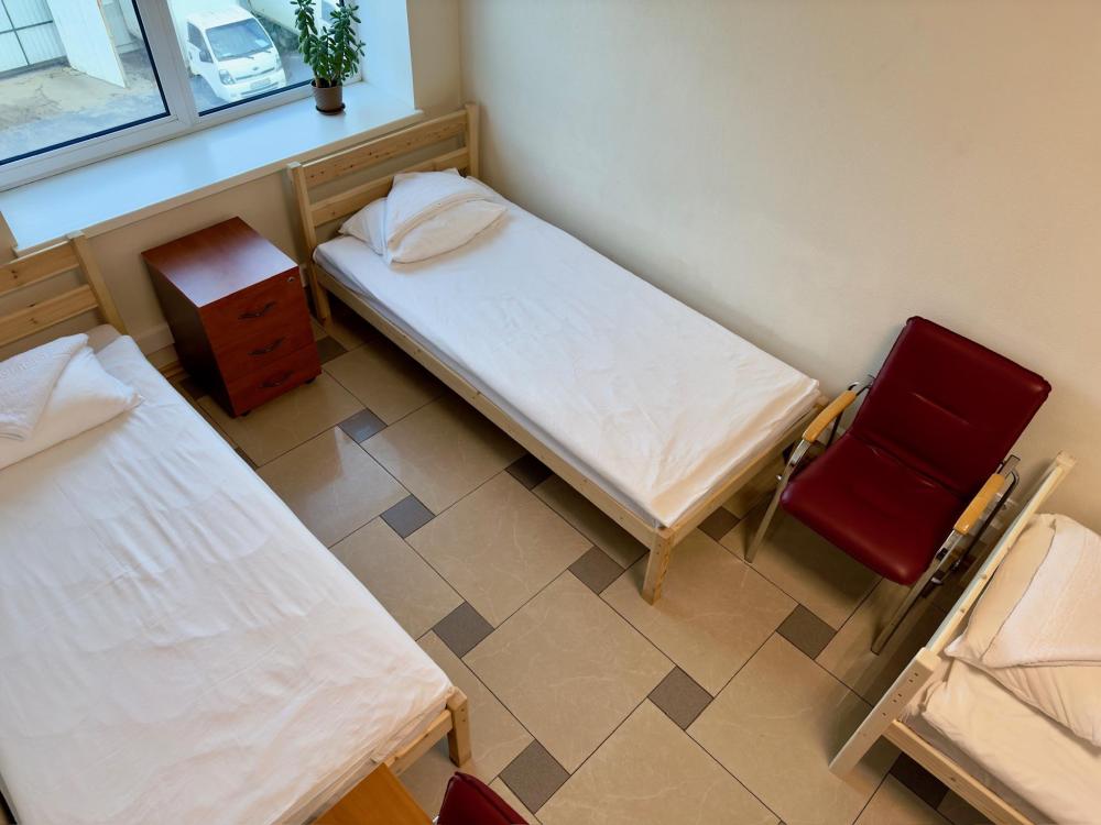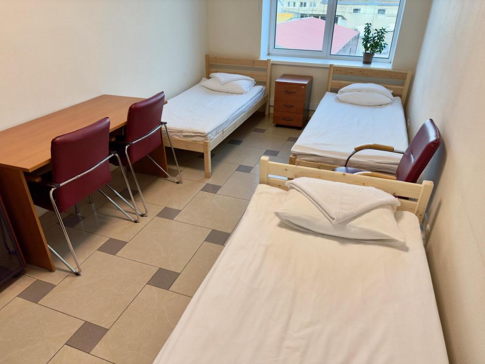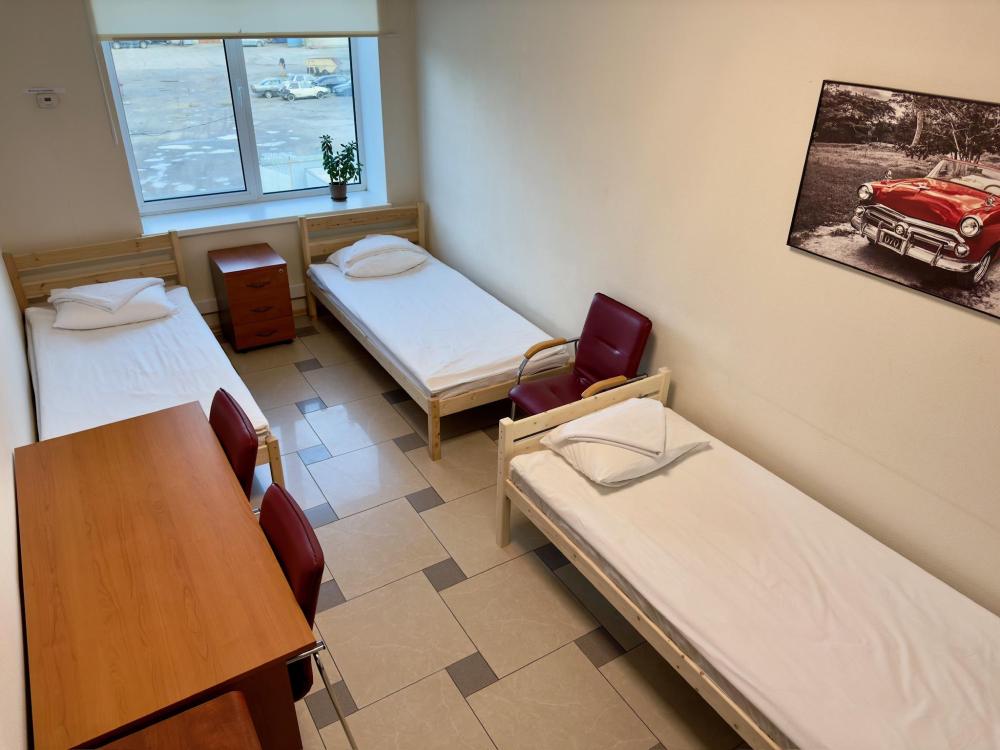 Номер эконом с 3 односпальными кроватями и электронным замком. В номере: стол, стул, сейф, чайник. Гостям предоставляется постельное белье и полотенца. Удобства общие, на этаже.