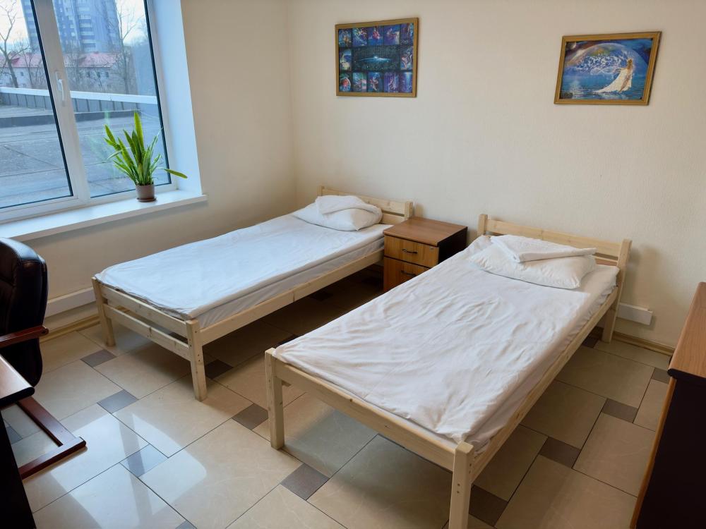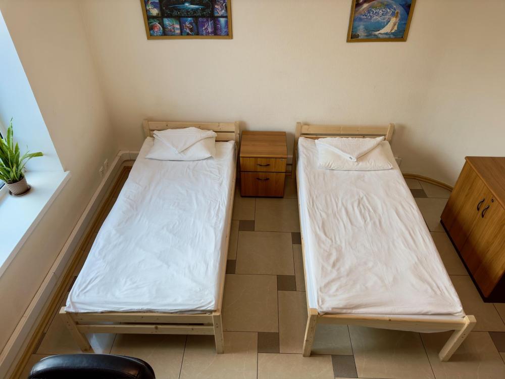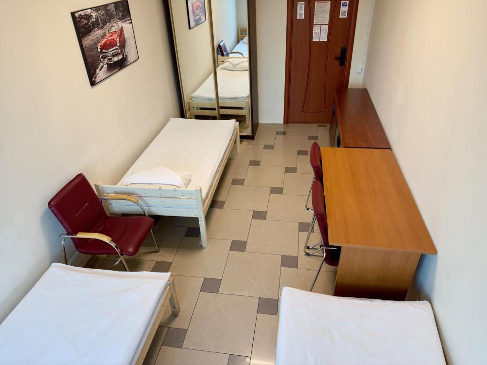 Номер эконом с 2 односпальными кроватями и электронным замком. В номере: стол, стул, сейф, чайник. Гостям предоставляется постельное белье и полотенца. Удобства общие, на этаже.