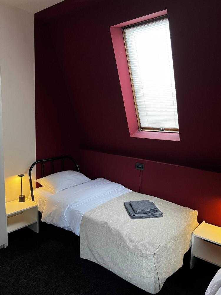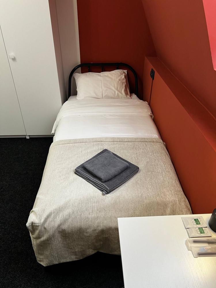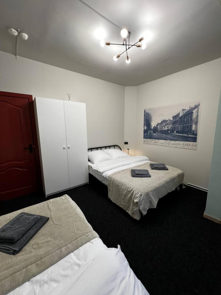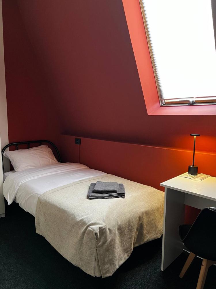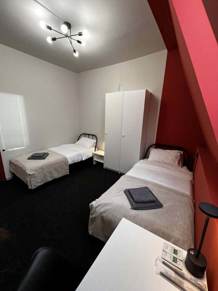 В номере: две односпальные кровати, стильная картина с панорамой города, тёплое освещение и уютная атмосфера, рабочее место с креслом, 2 шкафа для одежды, полотенца и постельное белье. Удобства общие за пределами номера.