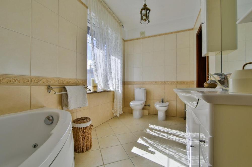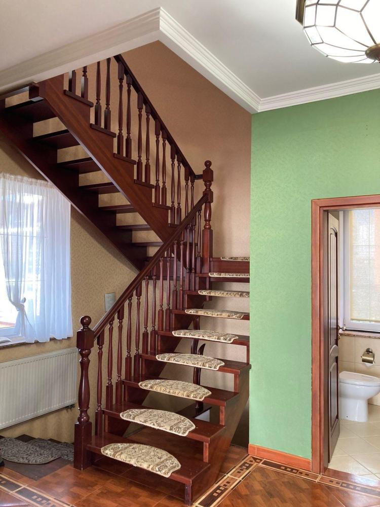 Комфортный дом со всеми удобствами и возможностями только для вас! Три спальни: мастер-спальня с большой кроватью, две спальни с 4-мя односпальными кроватями; большой санузел с большой ванной, биде, окном в сад, теплый пол - все это верхний этаж. На первом этаже - огромная светлая гостиная с эркером, ТВ, камином, диванами, столовой группой; кухня - деревянный гарнитур, обеденная зона, посудомойка, холодильник, духовка, варочная поверхность, вытяжка, электрический чайник, фильтр питьевой воды. На кухне качественная посуда для сервировки и приготовления пищи. Также здесь гостевой санузел и теплый плиточный пол! Внизу главное место - сауна: небольшая, с хорошей печкой; просторный предбанник, душевая, санузел, хозблок со стиральной машинкой и местами хранения крупных вещей; выход в гараж.