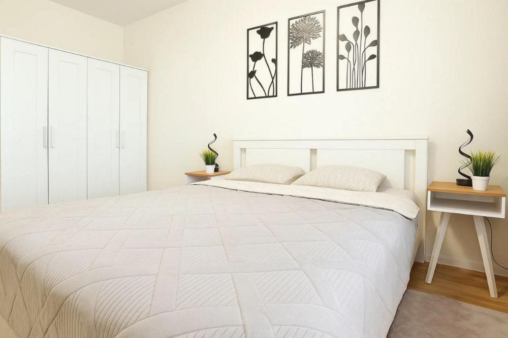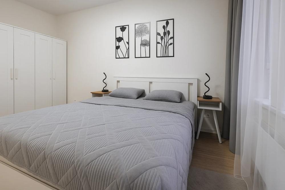 Доступно размещение до четырёх человек (одна двуспальная кровать и один раскладной диван). Чистое постельное бельё (по одному двуспальному комплекту на кровать) входит в стоимость проживания.