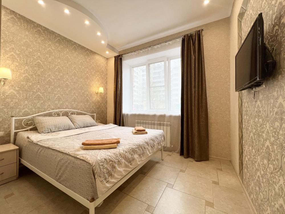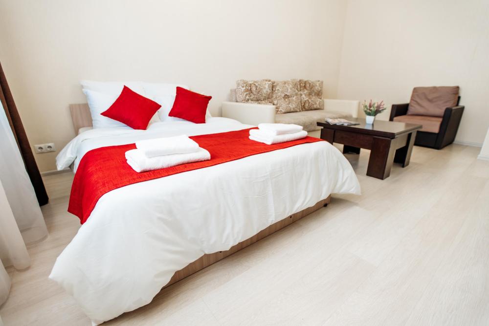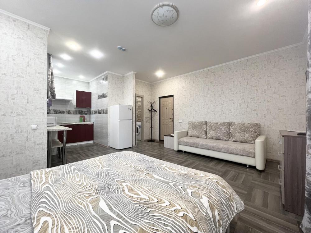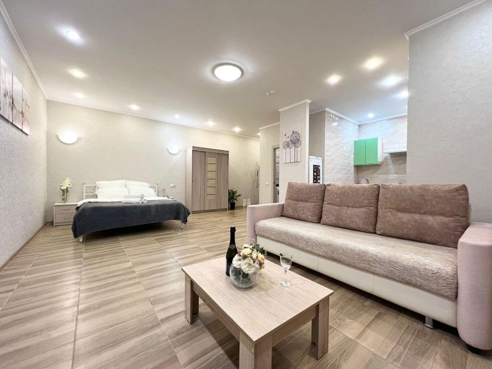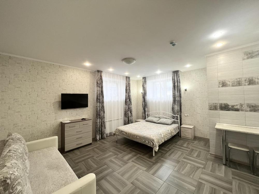 Квартира в центре города. Апартаменты состоят из одной большой комнаты и кухни, полностью оснащённой всей техникой и мебелью. Предусмотрено размещение до 3-х человек, двуспальный угловой диван и кровать с ортопедическим матрасом. В каждой сделан качественный ремонт.Цифровое TV , высокоскоростной безлимитный интернет, утюг, гладильная доска, сушка для белья. Предоставляем комплекты постельного белья (сатин), махровые полотенца, одноразовые тапочки, набор гостиничной парфюмерии: шампунь, гель и мыло.