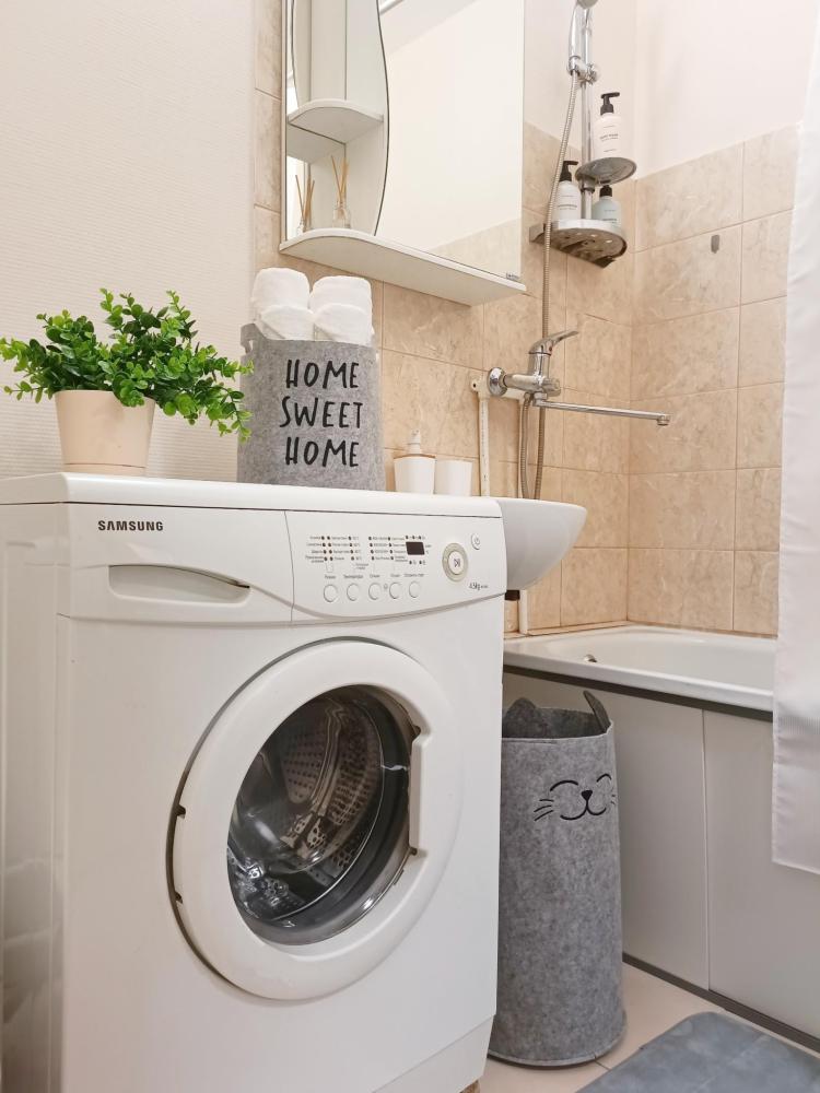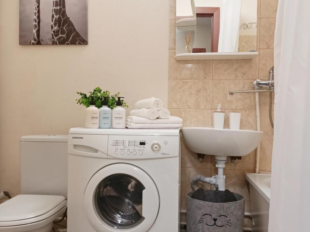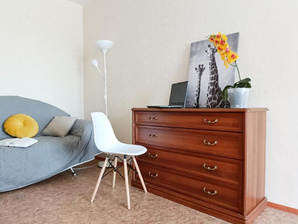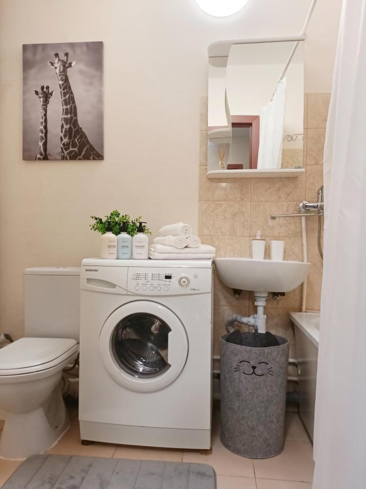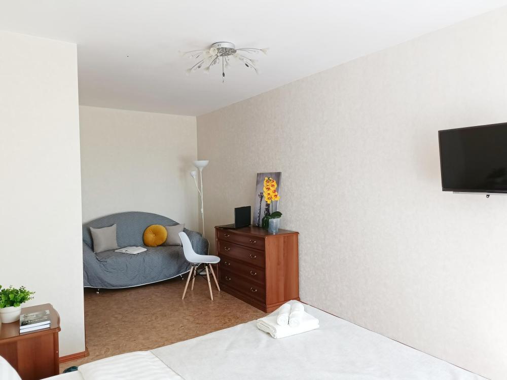 Однокомнатные апартаменты подойдут для размещения 2 человек на основных местах. Спальные места: двуспальная кровать с ортопедическим матрасом, одноместный диван-кровать в качестве дополнительного места. Имеется все необходимое для проживания: Wi-Fi, Smаrt ТV, гладильная доска, утюг, сушилка, стиральная машина, фен, шкаф-купе. На кухне: электрическая плита с духовым шкафом, микроволновка, чайник, холодильник, посуда и кухонные принадлежности. Санузел с ванной. Постельное белье, полотенца, средства гигиены: шампунь, гель для душа и мыло предоставляются.