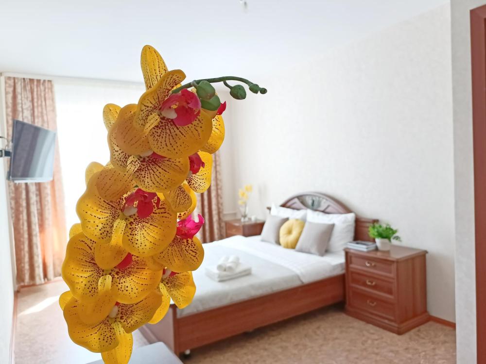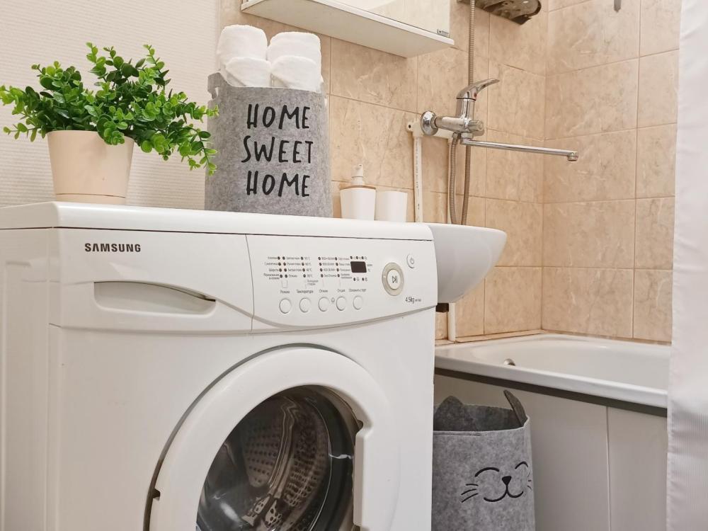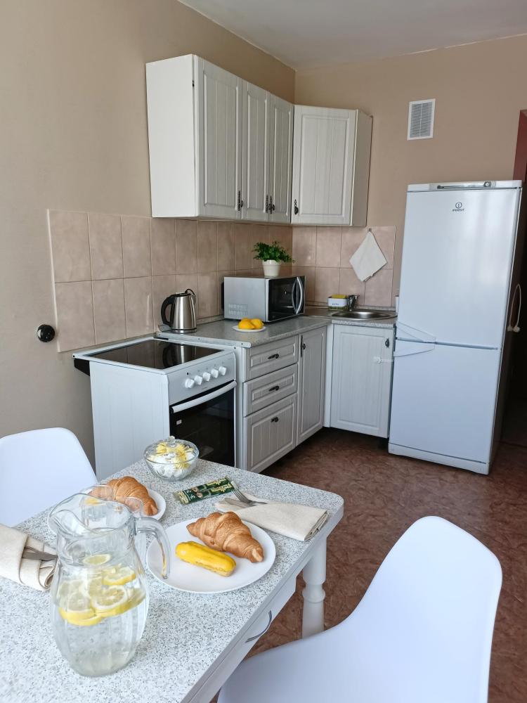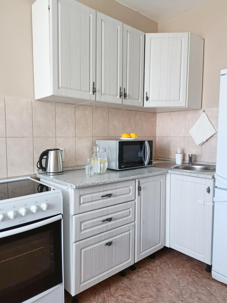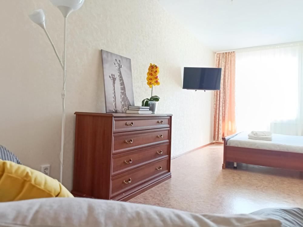 Однокомнатные апартаменты подойдут для размещения 2 человек на основных местах. Спальные места: двуспальная кровать с ортопедическим матрасом, одноместный диван-кровать в качестве дополнительного места. Имеется все необходимое для проживания: Wi-Fi, Smаrt ТV, гладильная доска, утюг, сушилка, стиральная машина, фен, шкаф-купе. На кухне: электрическая плита с духовым шкафом, микроволновка, чайник, холодильник, посуда и кухонные принадлежности. Санузел с ванной. Постельное белье, полотенца, средства гигиены: шампунь, гель для душа и мыло предоставляются.