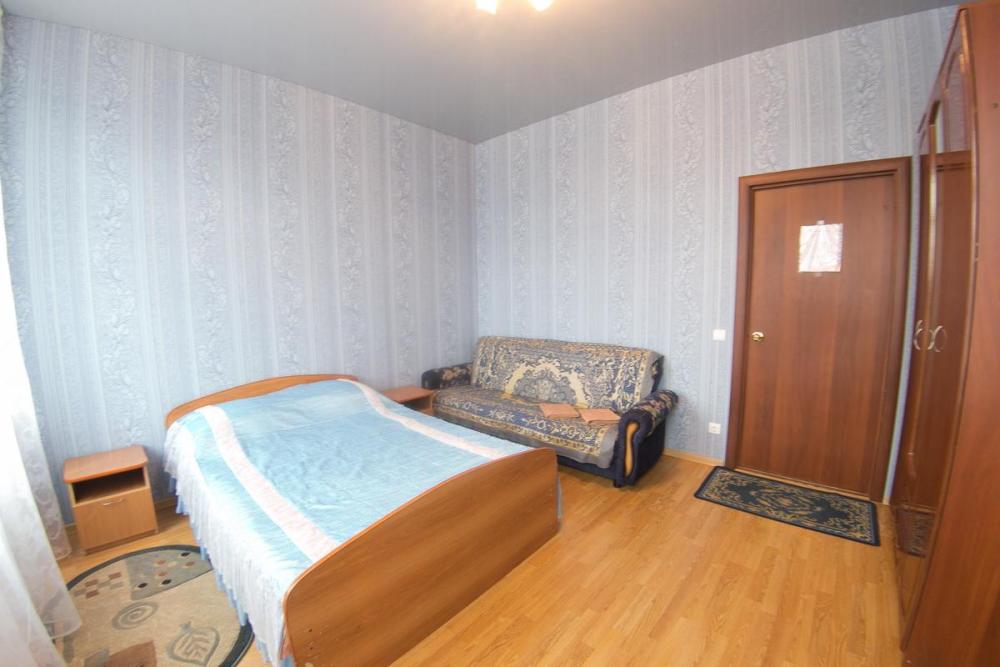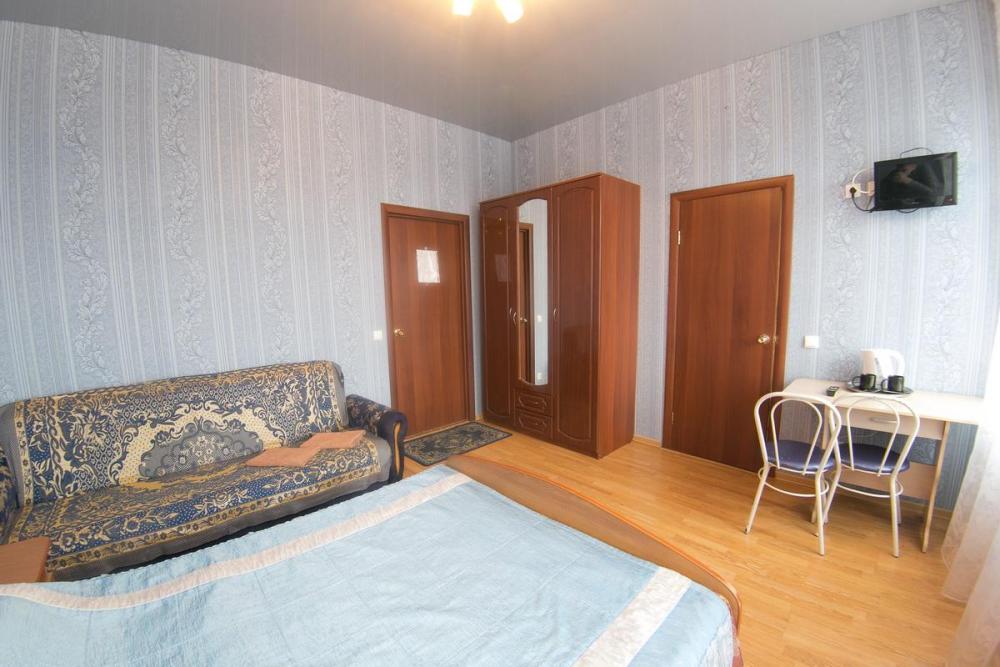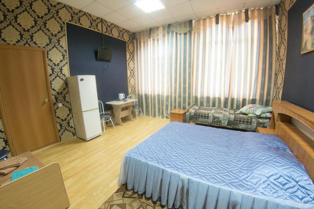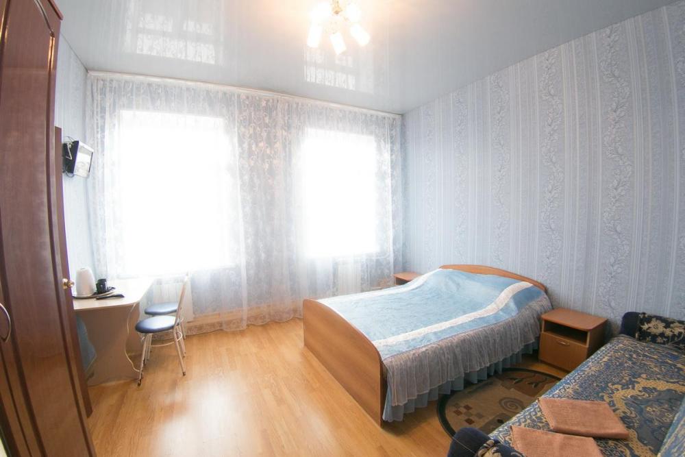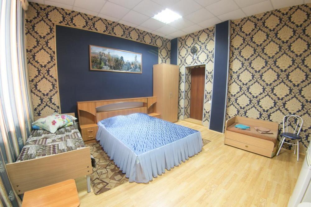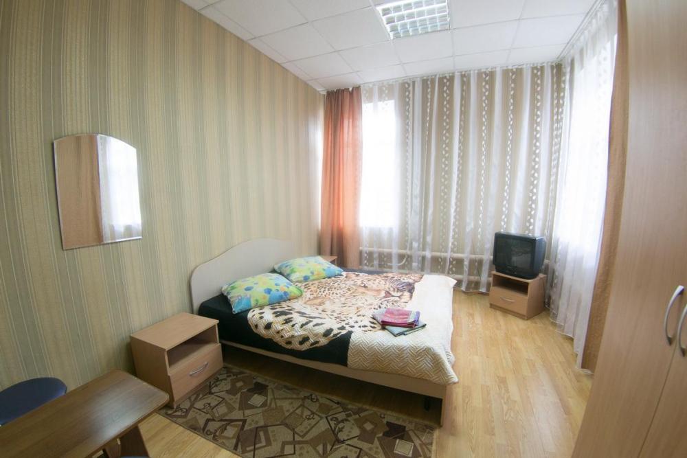 В номере: 3 односпальные или двуспальная и односпальная кровати, шкаф, телевизор. Удобства общие на этаже.
