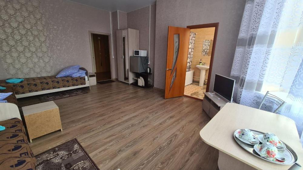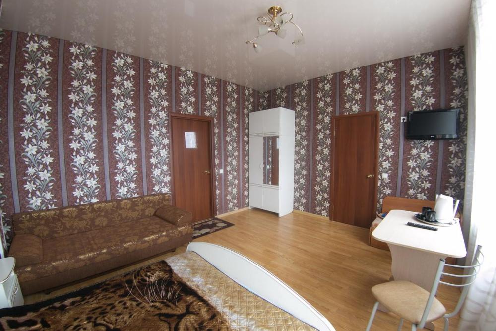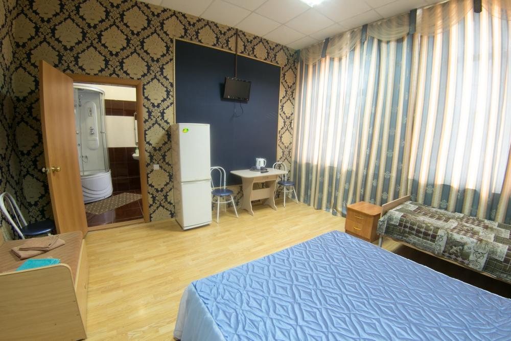 Просторный номер, оборудованный всем необходимым для комфортного проживания. В номере: двуспальная и односпальная кровати, комплект мебели, телевизор, холодильник, электрический чайник, санузел с душем.