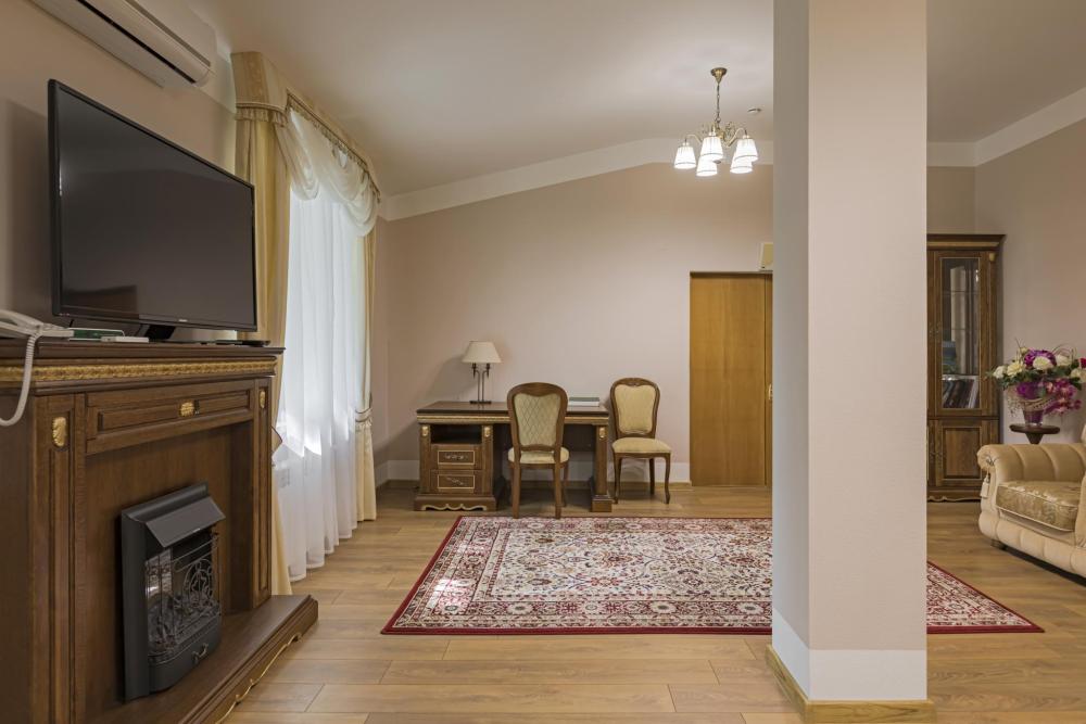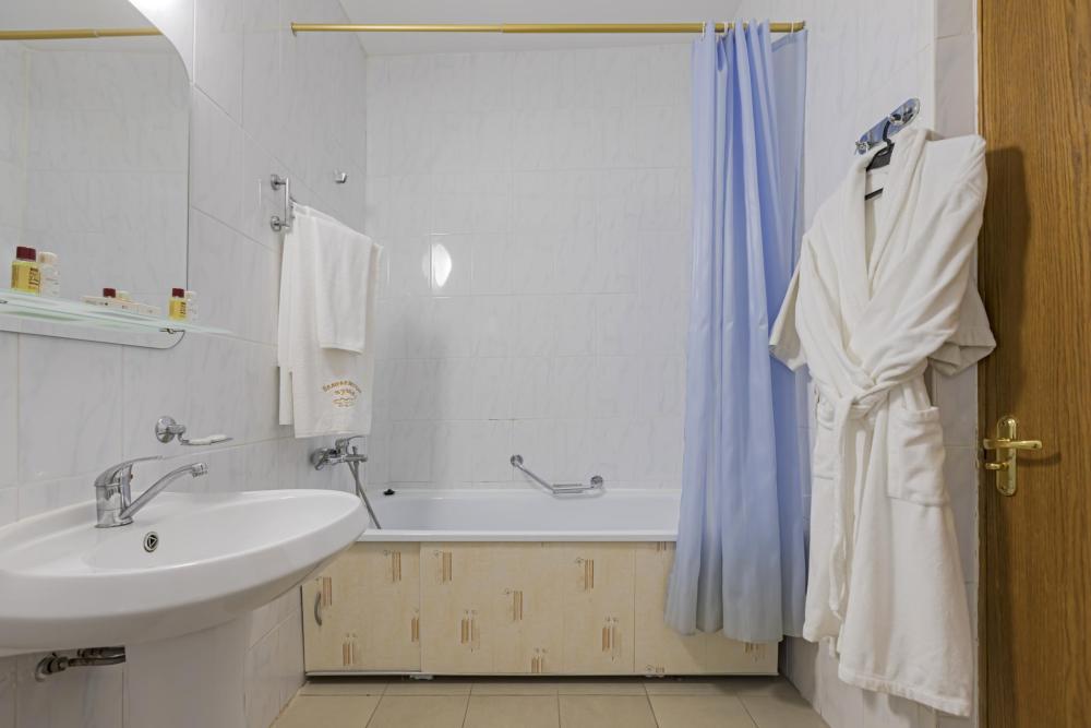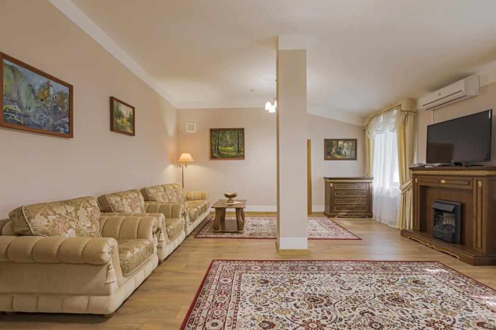 Это комфортабельный двухкомнатный номер, состоящий из спальни и гостиной с раскладывающимся диваном в корпусах № 1,3. Площадь номера 30 кв.м. Вместительность номера - 2 взрослых на основных местах. Возможно размещение до 2 детей от 4 до 18 лет на диване за дополнительную плату - 45,00 белорусских рубля (в стоимость входит предоставление постельного белья и завтрака). В номере: Wi-Fi, телевизор, фен, холодильник, вешалки, зеркало, мебельный гарнитур, электрический чайник, питьевая вода, чай. В ванной комнате: душевая кабина, банные полотенца, косметические средства (шампунь, мыло, бритвенный набор, зубная щетка и паста), халаты и тапочки на две персоны.