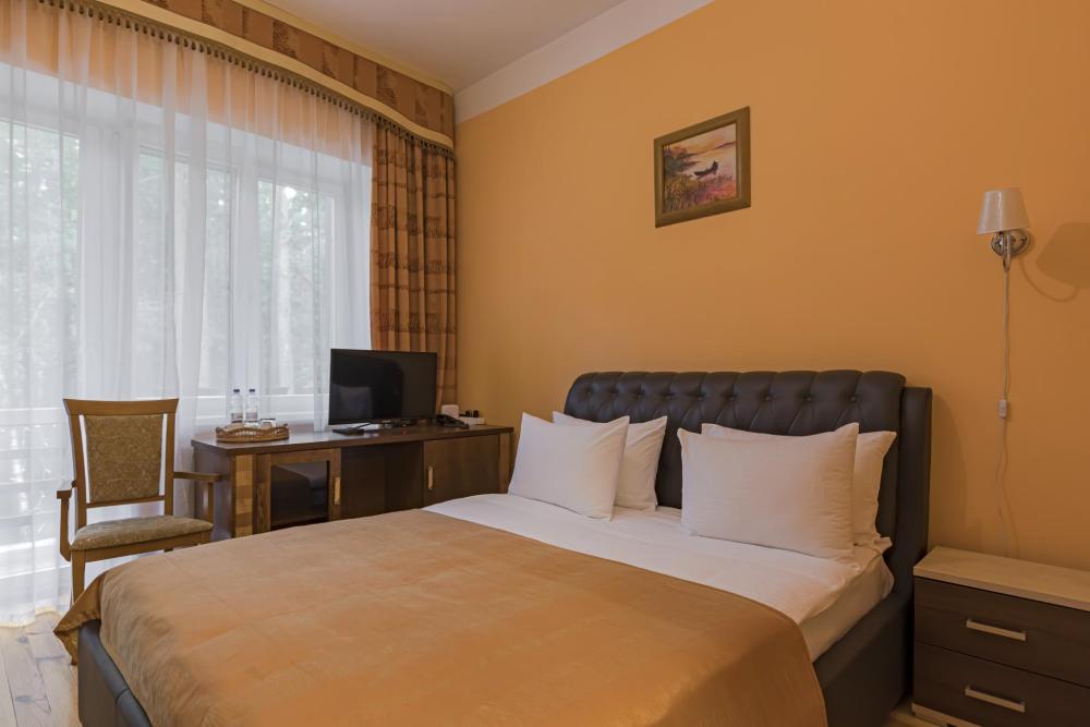 Классический и аккуратный, сдержанный и лаконичный, комфортный однокомнатный номер с двуспальной или же с двумя раздельными кроватями и раскладывающимся диваном (корпусе №4). Площадь номера 18 кв.м.. Вместительность номера - 2 взрослых на основных местах. Возможно размещение до 2 детей от 4 до 18 лет на диване за дополнительную плату - 45,00 белорусских рубля (в стоимость входит предоставление постельного белья и завтрака). В номере: Wi-Fi, телевизор, холодильник, вешалки, зеркало, мебельный гарнитур, электрический чайник, питьевая вода, чай. В ванной комнате: душевая кабина, банные полотенца, косметические средства (шампунь, мыло).