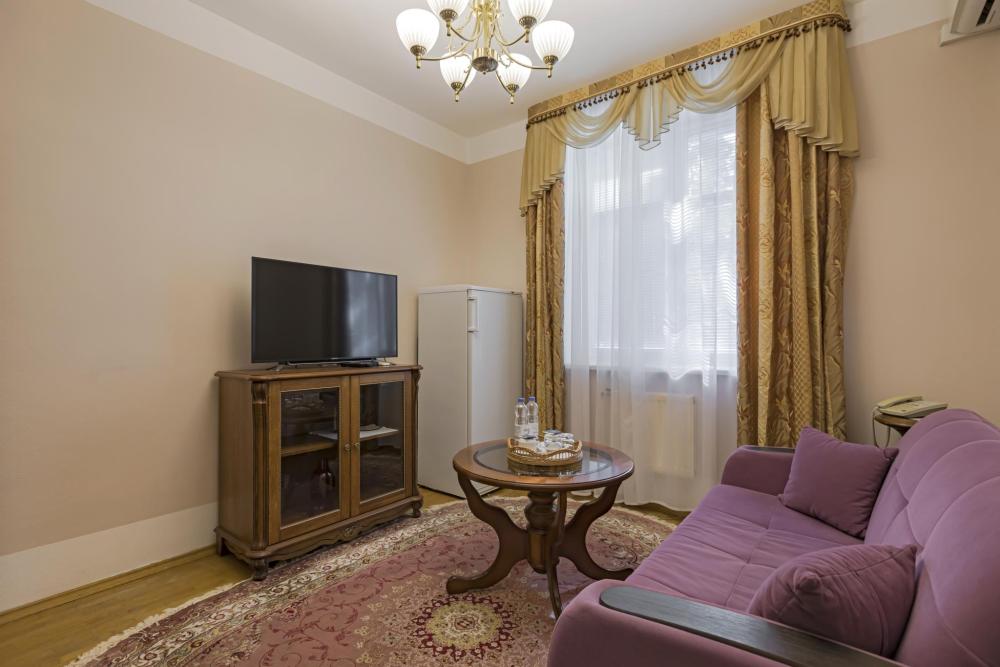 Это комфортабельный двухкомнатный номер, состоящий из спальни и гостиной с раскладывающимся диваном в корпусах № 1. Площадь номера 30 кв.м. Вместительность номера - 2 взрослых на основных местах. Возможно размещение до 2 детей до 18 лет на диване за дополнительную плату - 80,00 белорусских рубля (в стоимость входит предоставление постельного белья и завтрака). В номере: Wi-Fi, телевизор, фен, холодильник, вешалки, зеркало, мебельный гарнитур, электрический чайник, питьевая вода, чай, швейный набор, щетка для одежды, щетка для обуви. В ванной комнате: душевая кабина, банные полотенца, косметические средства (шампунь, мыло, гель для душа, зубной набор, шапочка для душа ), халаты и тапочки на две персоны.