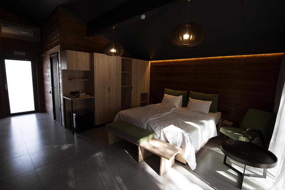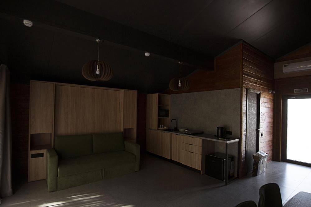Отдельно стоящее однокомнатное бунгало с видом на реку Дон. Собственная терраса с мангалом. Одна двуспальная кровать, диван-кровать, прикроватная тумба, журнальный столик, 2 кресла, шкаф, холодильник, телевизор, туалет, душевая кабина. Размещение 2+2.