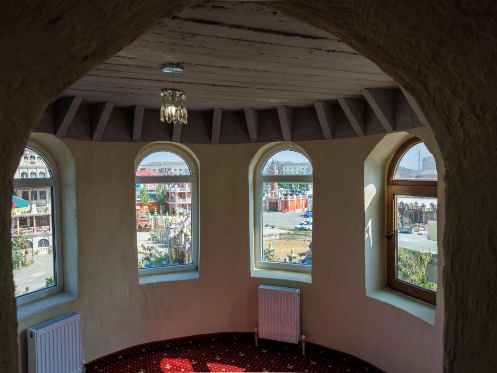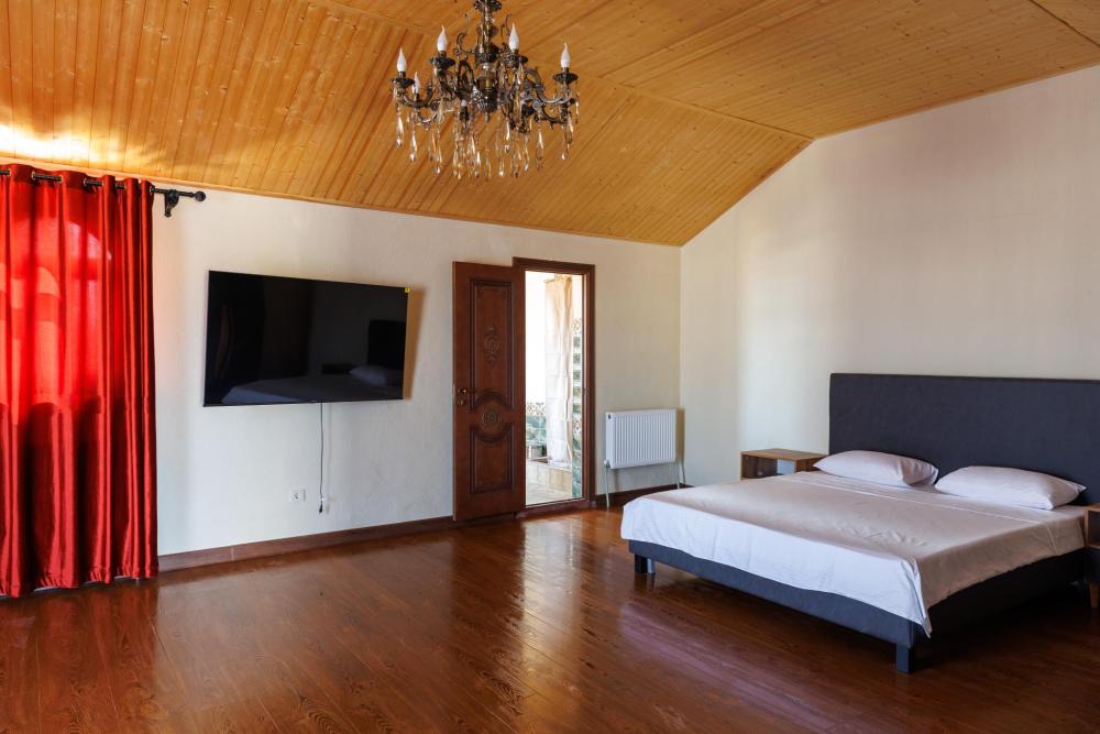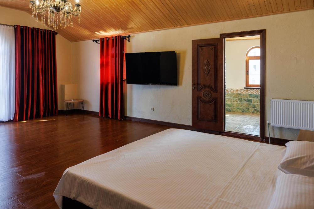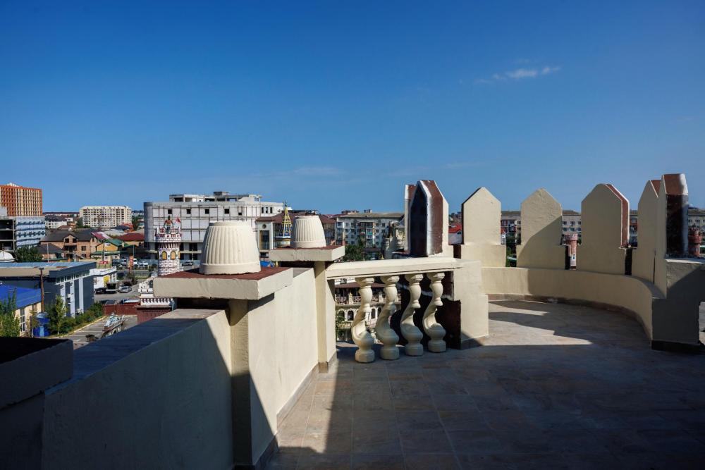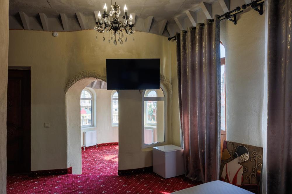 Номере “Делюкс с балконом” в корпусе "Старый замок. Номер оборудован всем необходимым для комфортного проживания: двуспальная кровать, комплект мебели, телевизор, кондиционер, холодильник, чайная станция, балкон, санузел с душем. Гостям предоставляются полотенца, постельное белье, гигиенические принадлежности.