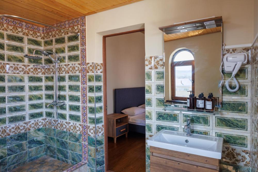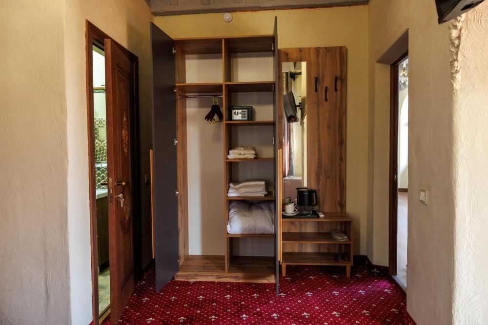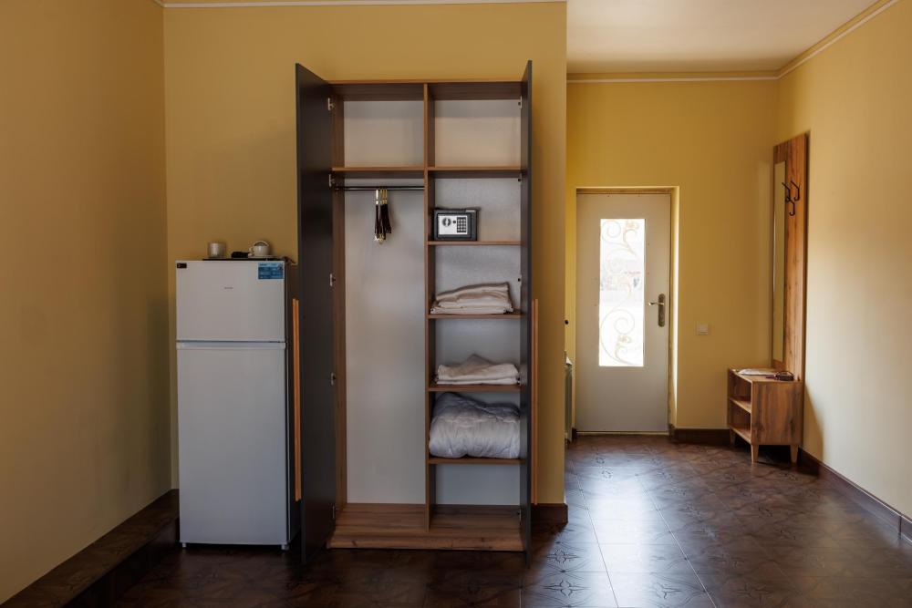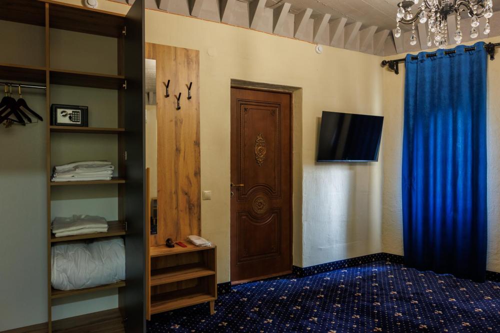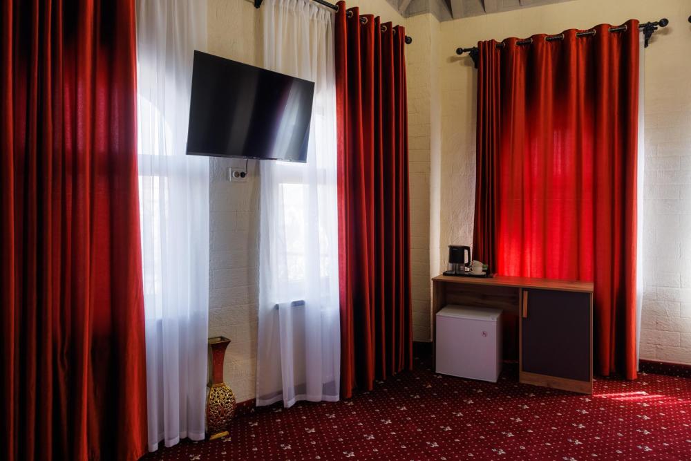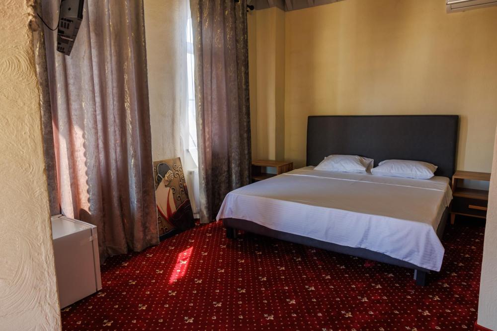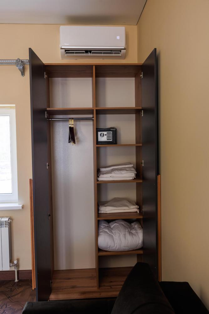 Номере “Комфорт” в корпусе "Старый замок". Номер оборудован всем необходимым для комфортного проживания: двуспальная кровать, комплект мебели, телевизор, кондиционер, холодильник, чайная станция, санузел с душем. Гостям предоставляются полотенца, постельное белье, гигиенические принадлежности.