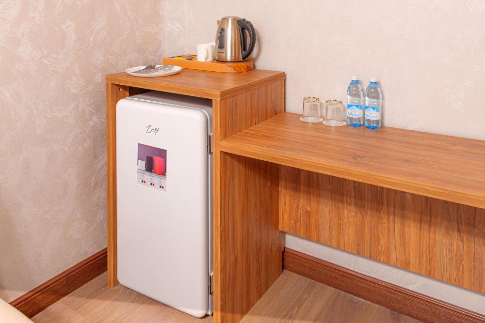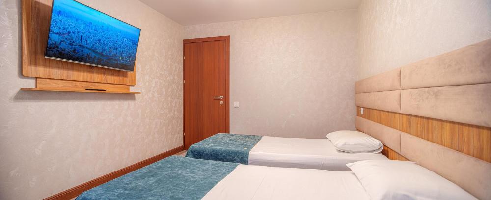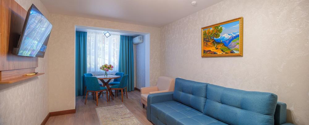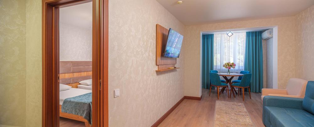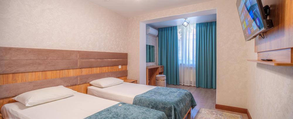Просторные, полностью реновированные в 2025 году номера площадью 24 м² оформлены в светлых природных тонах и подходят для размещения с семьей или друзьями. Из окон некоторых номеров открывается частичный вид на Каспийское море. Функциональный дизайн создает комфортные условия для отдыха и работы.