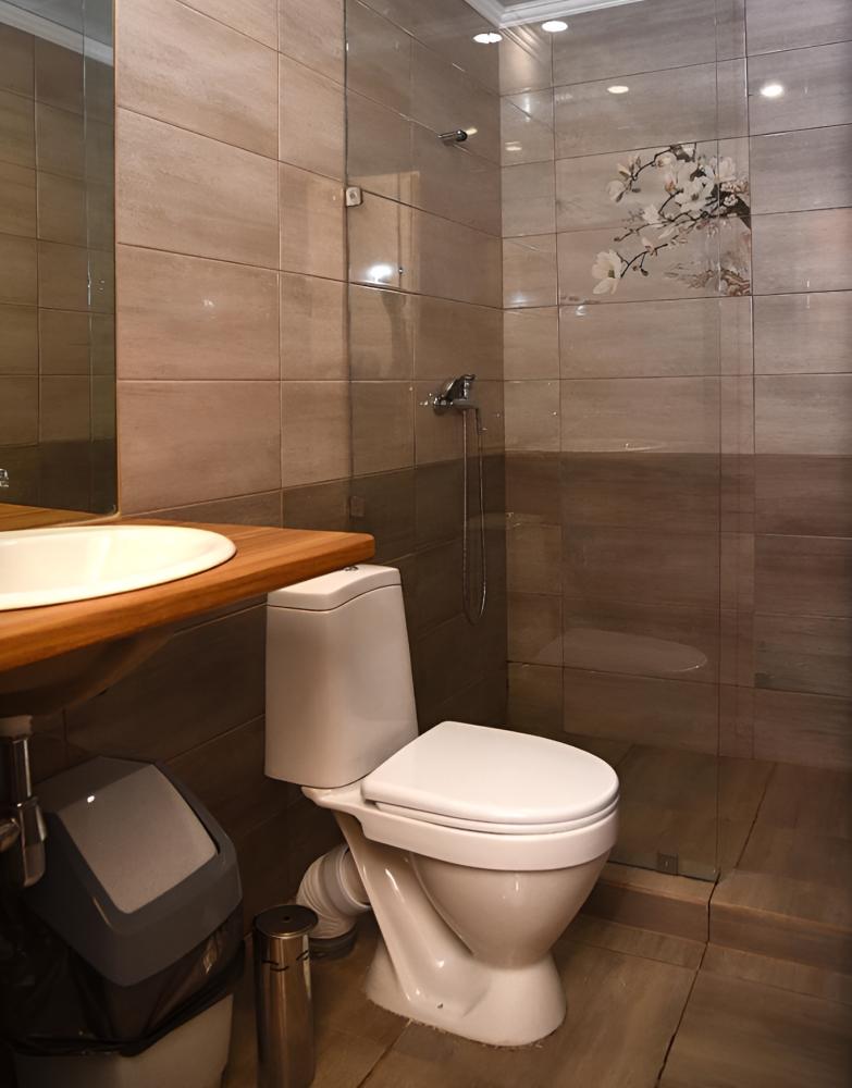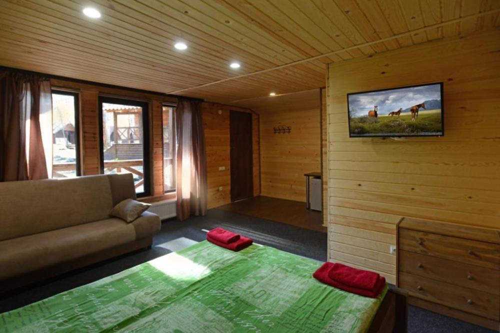 Номер в благоустроенном каменном или деревянном коттедже на 2-4 номера с отдельными входами. В номере: прихожая, стулья, комод, стол, телевизор, холодильник. Санузел: туалет, умывальник, душ, пол с подогревом.