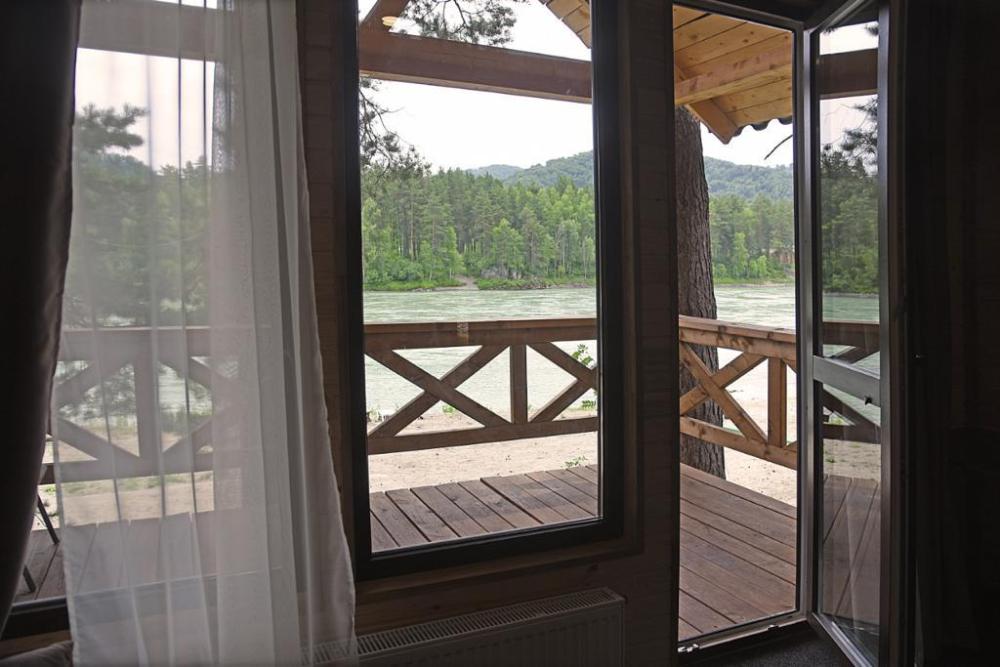 В номере: веранда с видом на Катунь, прихожая, шкаф, холодильник, телевизор (номера могут отличаться друг от друга своей комплектацией) Санузел: туалет, умывальник, душ Вид корпусов: дом с панорамными окнами, отдельно стоящий или на 2 номера с видом на берег и реку.