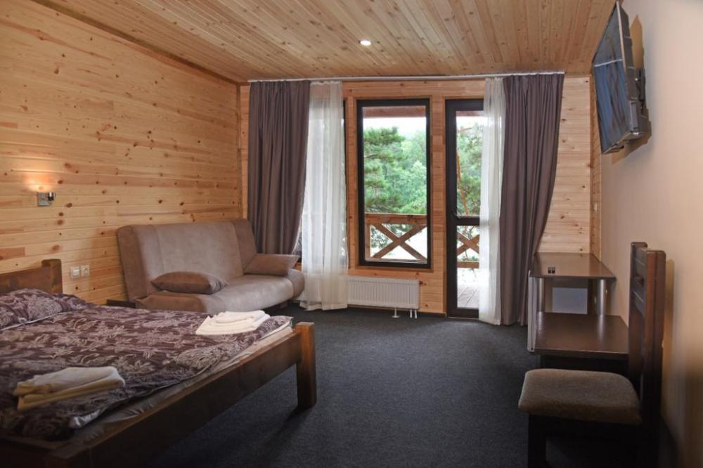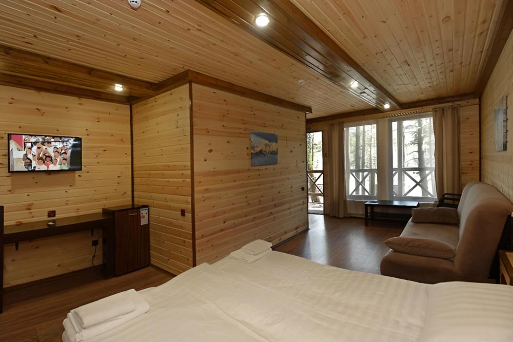 В номере: балкон, телевизор, чайник, холодильник (номера могут отличаться друг от друга своей комплектацией) Санузел: туалет, умывальник, душ Вид корпусов: гостиничный корпус из кедрового бруса.