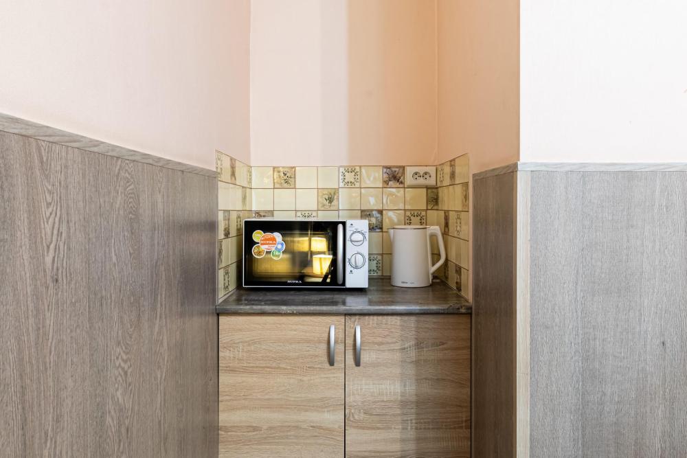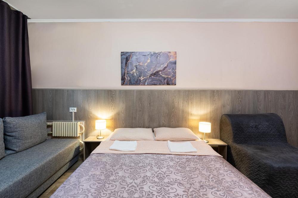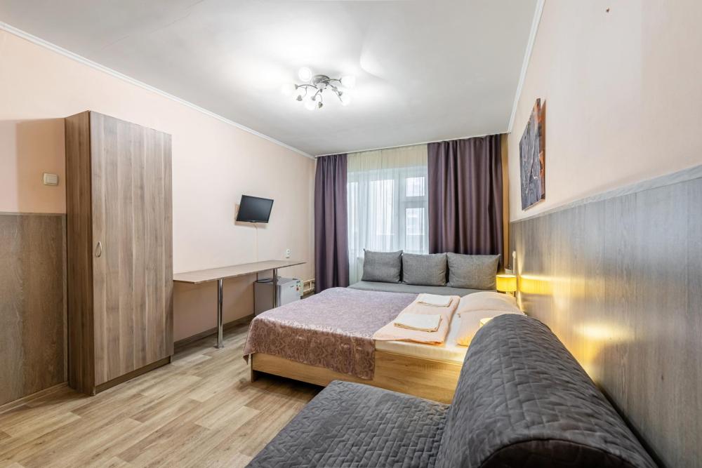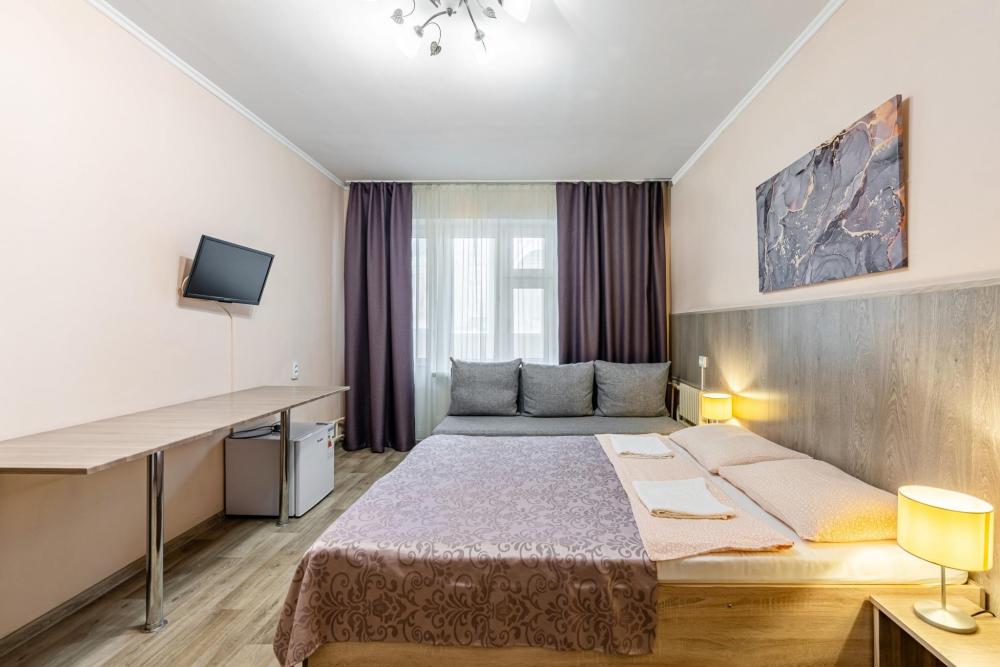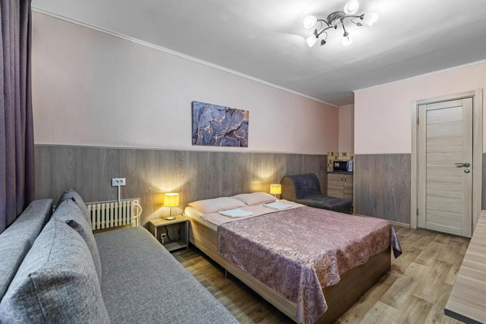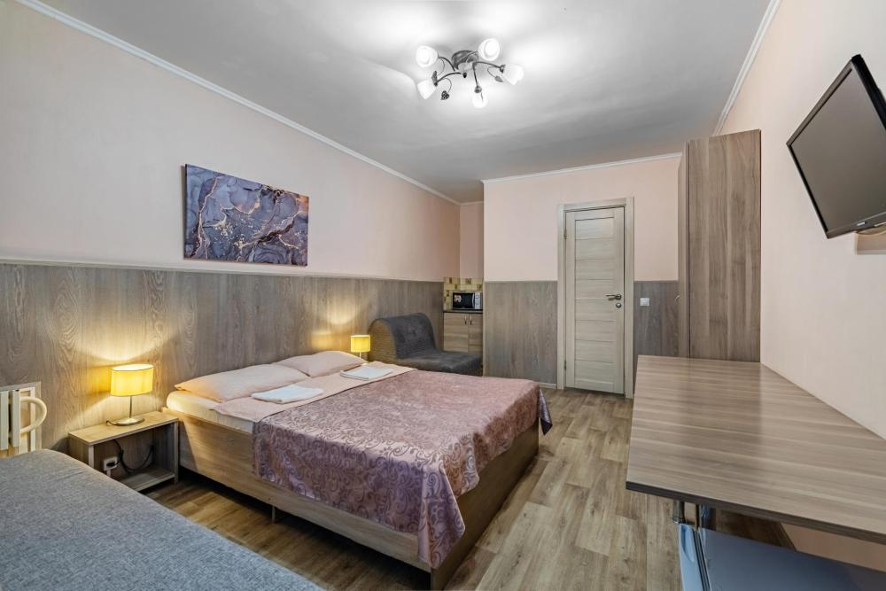 В комнате имеется: двуспальная кровать или две раздельные, двуспальный диван-кровать, кресло-кровать, свой сан.узел (душ, туалет, раковина), письменный стол, постельное белье и полотенца, чайник, холодильник, микроволновая печь, зеркало, шкаф для одежды, телевизор, wifi