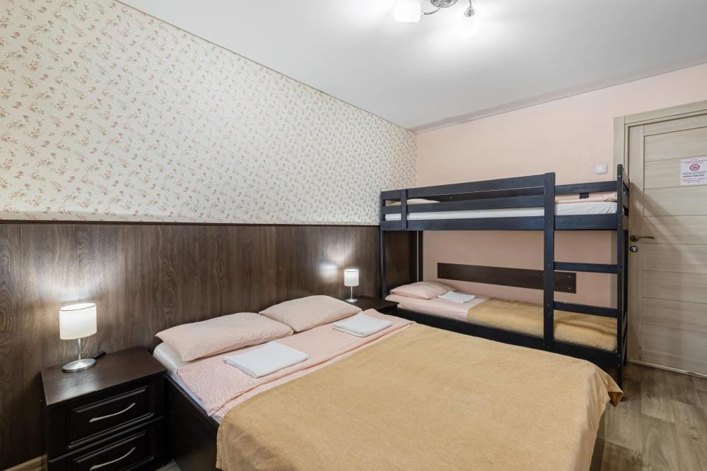 В комнате имеется: двуспальная кровать, двухъярусная кровать, небольшой столик, постельное белье и полотенца, зеркало, вешалки, телевизор, прикроватная тумбочка, wifi. Душ и туалет общие на два номера