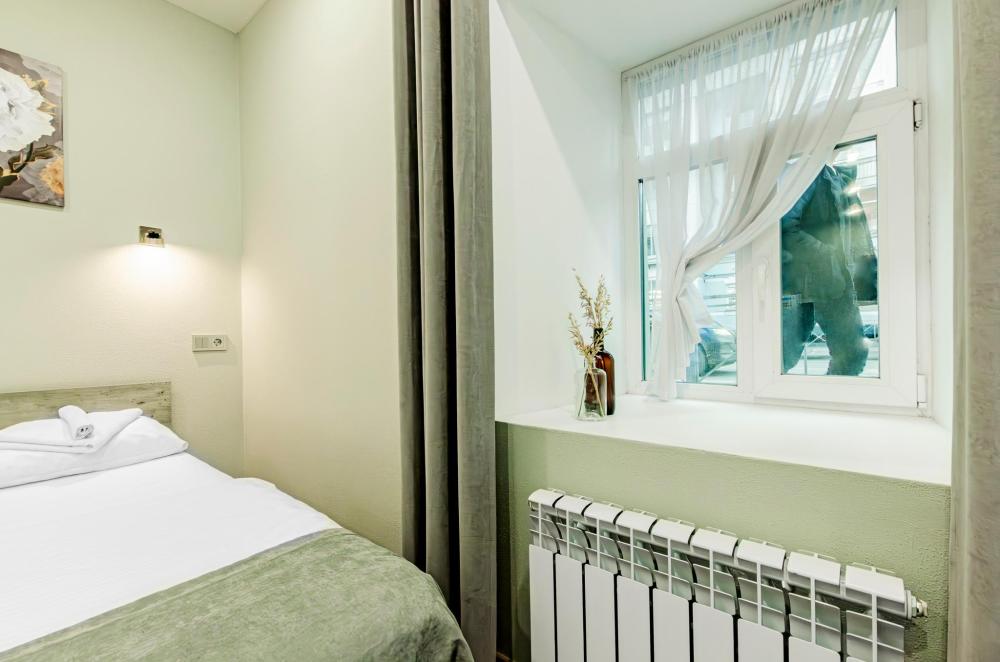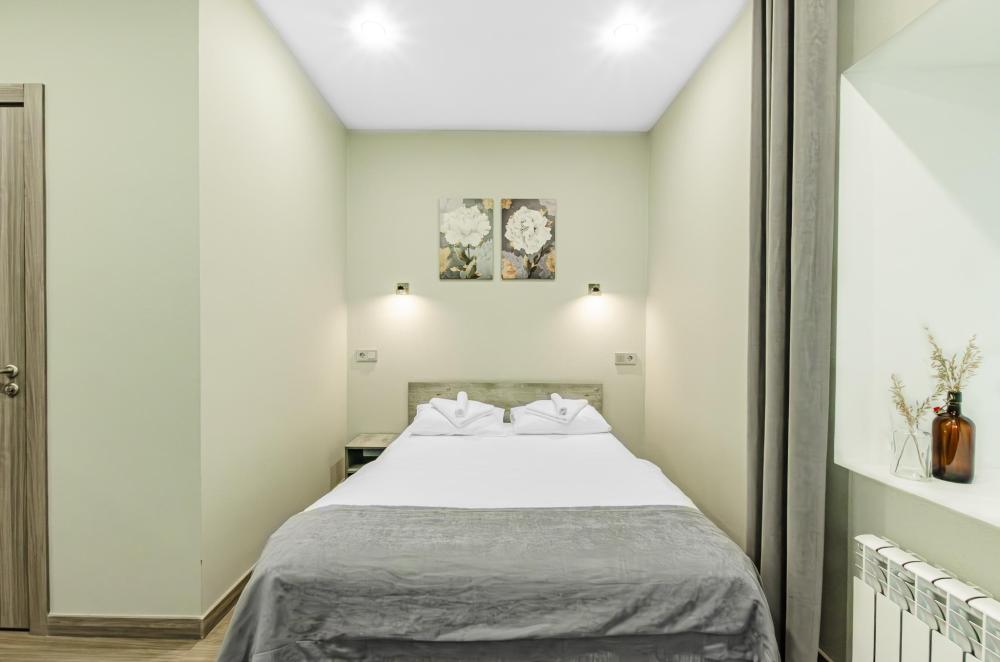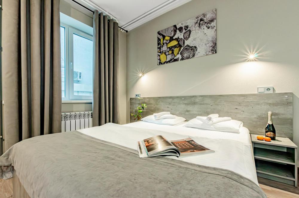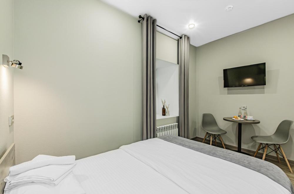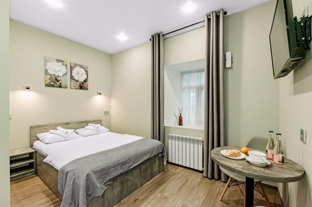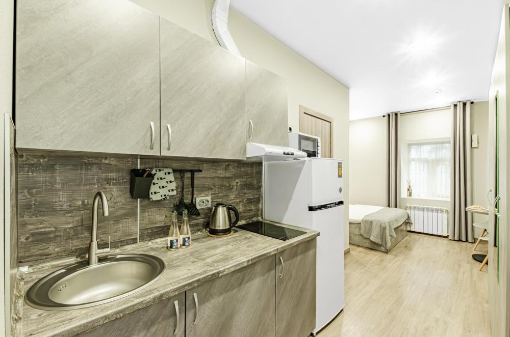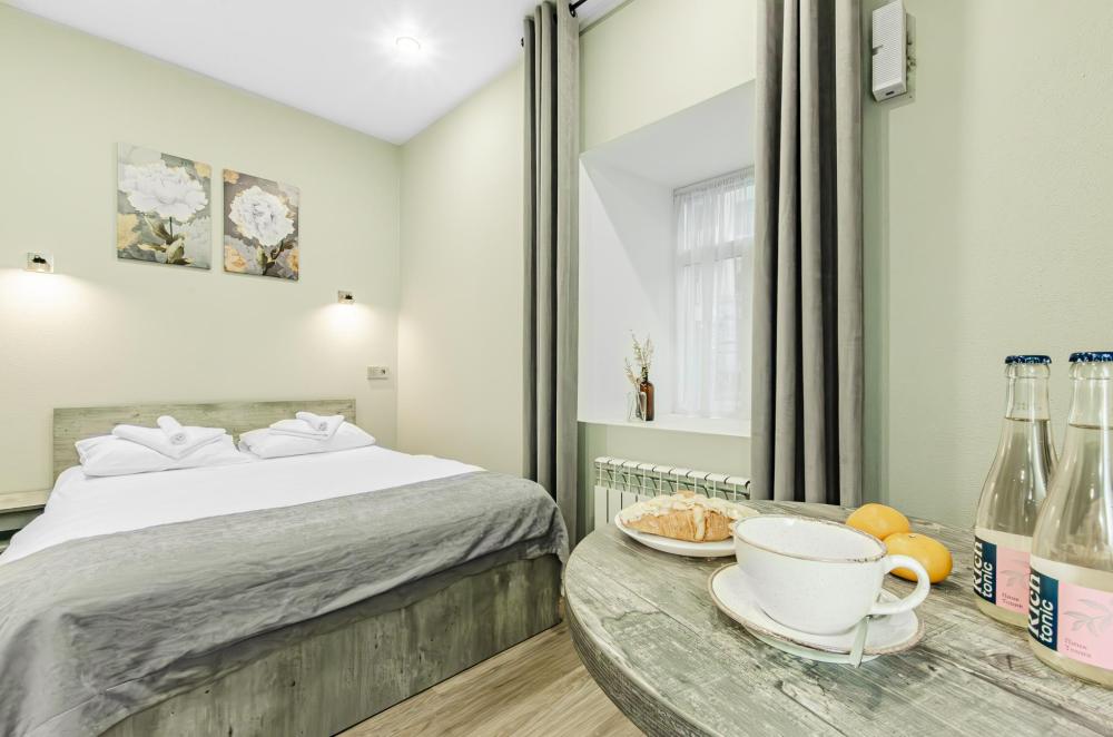 Апартаменты с двуспальной кроватью. Номер расположен на первом этаже отеля, окна ниже уровня улицы. В комфорте номеров предусмотрено: - двуспальная кровать 160*200; - телевизор и Wi-Fi; - обеденная зона с барной стойкой; - кухня с мини-холодильником, микроволновкой и индукционной плитой; - наборы посуды и столовых приборов на две персоны (чашки, тарелки, вилки, ложки, кастрюля и сотейник); - белоснежное постельное белье (уборка и смена белья происходит на третий день проживания); - из гигиенических средств предусмотрено средство 2в1 шампунь-гель для душа, мыло, тапочки, зубной набор; - махровые полотенца; - душ и санузел в ванной комнате.