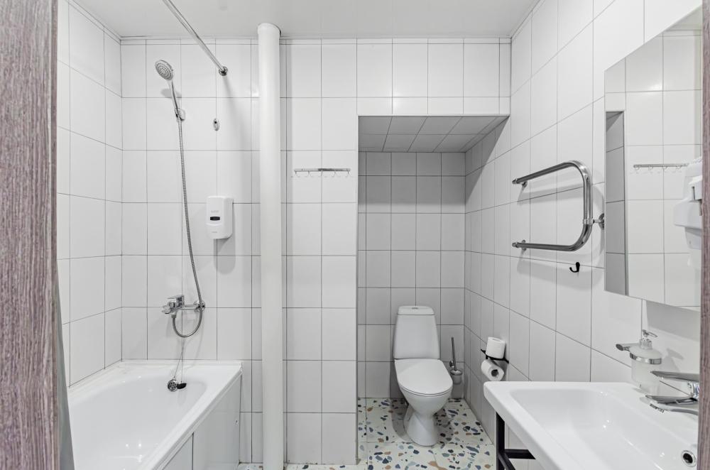 Просторная зонированная студия. Номер вмещает до 4 гостей. В одной из зон две односпальные кровати, в другой гостиная зона с раскладным диваном. В этом номере: - две односпальные 90*180; - диван кровать на два спальных места; - телевизор и Wi-Fi; - обеденная зона со столом и стульями; - кухня с холодильником, микроволновкой и индукционной плитой; - наборы посуды и столовых приборов на 4 персоны (чашки, тарелки, вилки, ложки, кастрюля и сотейник); - белоснежное постельное белье (уборка и смена белья происходит на третий день проживания); - махровые полотенца; - душ и санузел в ванной комнате; - фен. В общих зонах отеля: - кафе; - спорт-зал; - детская комната; - прачечная самообслуживания; - внутренний дворик с открытой террасой; - паркинг (платно, требуется предварительный заказ). *расположение мебели в каждом номере индивидуально и может отличаться от представленного фото на сайте.