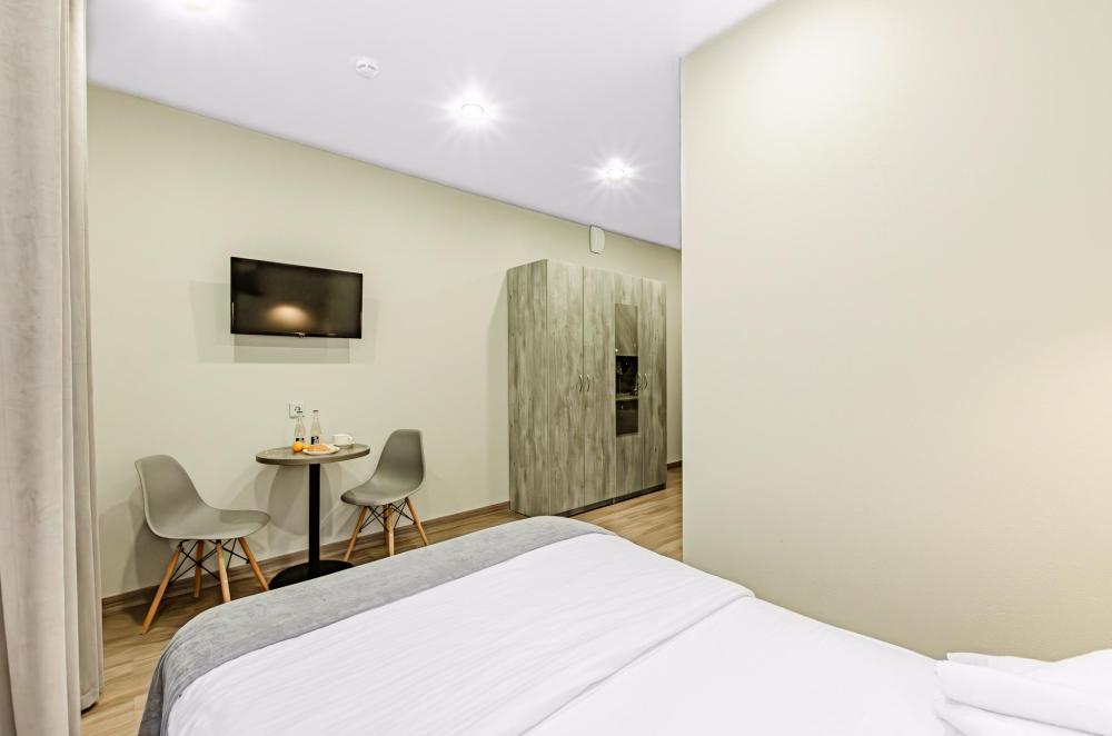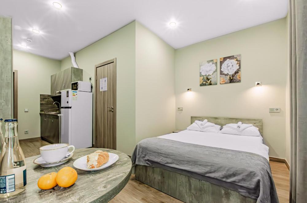 Уютные апартаменты с двуспальной кроватью. В комфорте номеров предусмотрено: - двуспальная кровать 160*180; - телевизор и Wi-Fi; - обеденная зона с барной стойкой; - кухня с мини-холодильником, микроволновкой и индукционной плитой; - наборы посуды и столовых приборов на две персоны (чашки, тарелки, вилки, ложки, кастрюля и сотейник); - белоснежное постельное белье (уборка и смена белья происходит на третий день проживания); - махровые полотенца; - душ и санузел в ванной комнате. В общих зонах отеля: - кафе; - спорт-зал; - детская комната; - прачечная самообслуживания; - внутренний дворик с открытой террасой; - паркинг (платно, требуется предварительный заказ). *расположение мебели в каждом номере индивидуально и может отличаться от представленного фото на сайте.