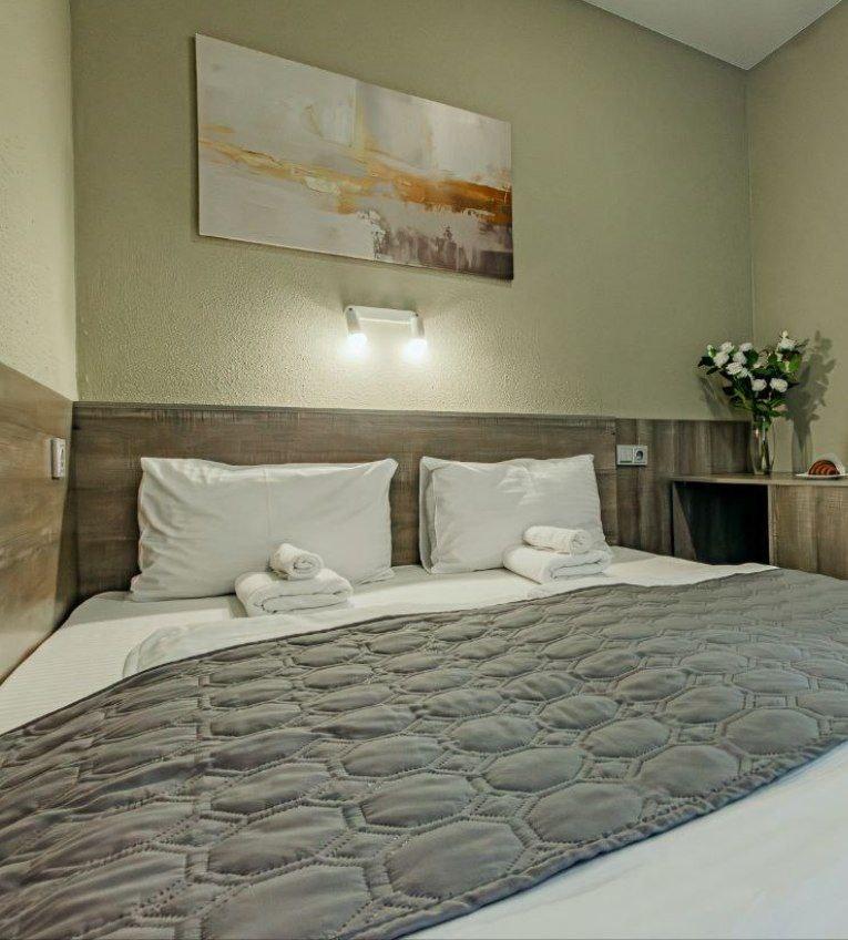 Уютный двухместный номер с одной двухспальной кроватью 2 категории на 5 этаже ( в отеле отсутствует лифт), оборудованный всем необходимым для комфортного проживания - кондиционер, собственная ванная комната, телевизор с плоским экраном и бесплатный Wi-Fi. В номере в период всего проживания ежедневно выносят мусор, дополняют диспенсер с гель-шампунем, заносят туалетную бумагу. После 3-х дней проживания предусмотрена полноценная уборка со сменой постельного белья. К услугам гостей отеля — *На ресепшен можно бесплатно взять на временное пользование фен, вазу, штопор, зонт. *На цокольном этаже общая кухонная зона - холодильник, чайник, СВЧ печь, тостер, раковина, одноразовая посуда, чай (зеленый, черный) , сахар, кофейный автомат. Там же проводятся континентальные завтраки с 8.00 до 10.30 утра. *На этажах — гладильные зоны, кулеры с горячей и холодной водой. *Гости отеля могут отдохнуть на террасе либо в зоне ожидания * В отеле есть багажная комната. Вы платите только за то, что вам нужно, остальное можно докупить по необходимости. За дополнительную плату можно приобрести: *Парковочное место (предварительная бронь) *Завтрак *Гигиенические принадлежности, тапки *Заказ экскурсий