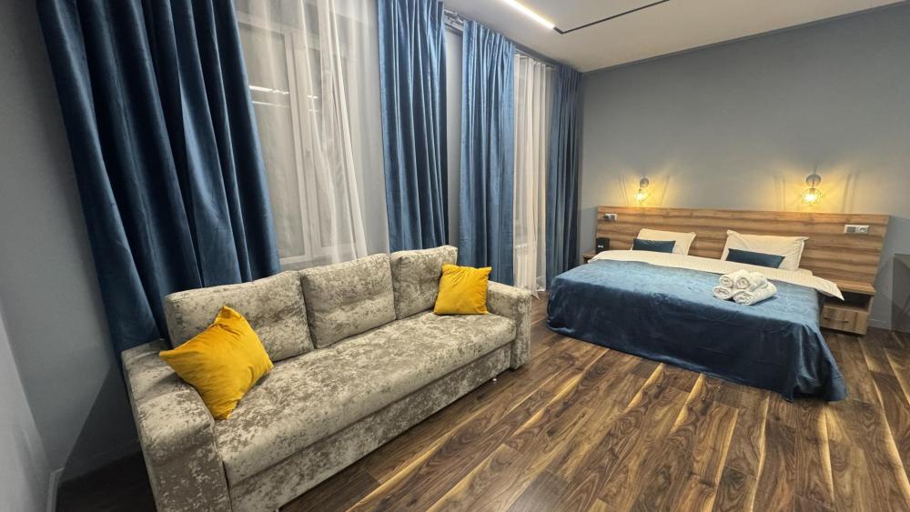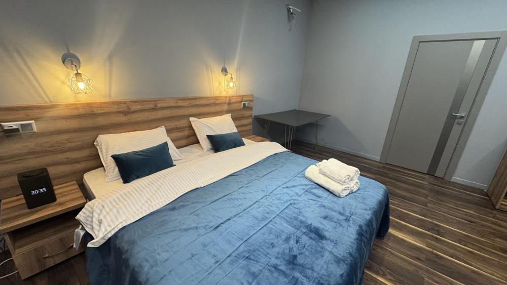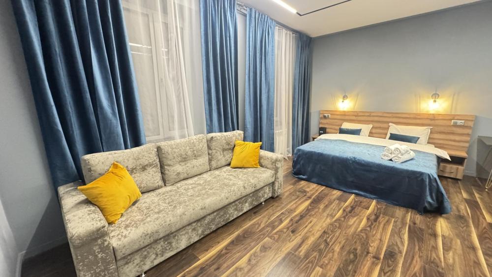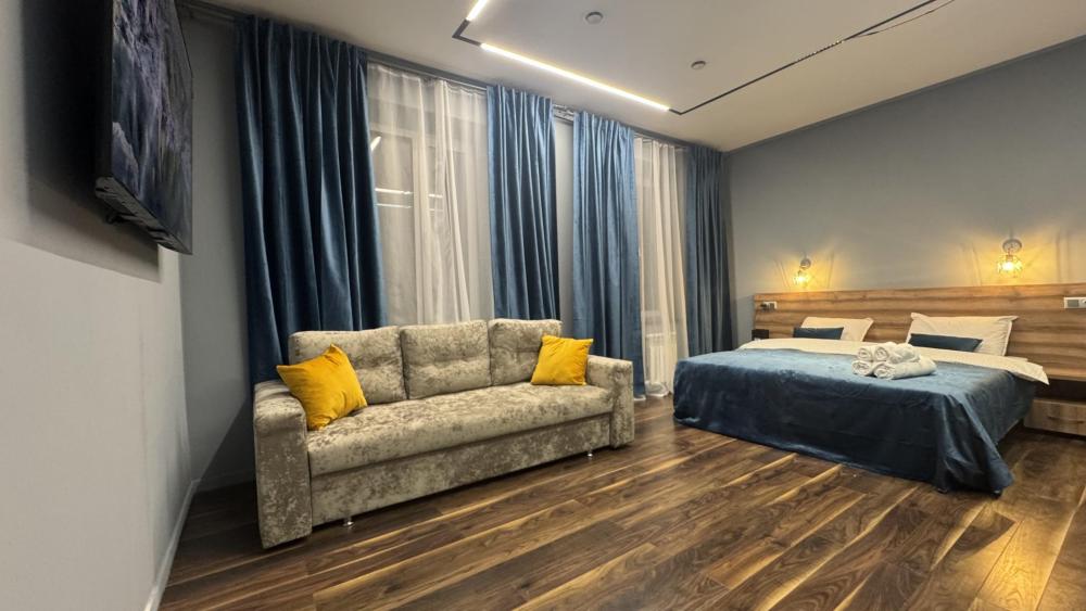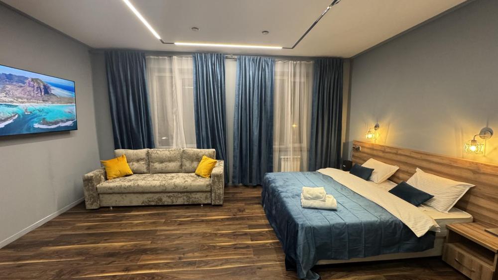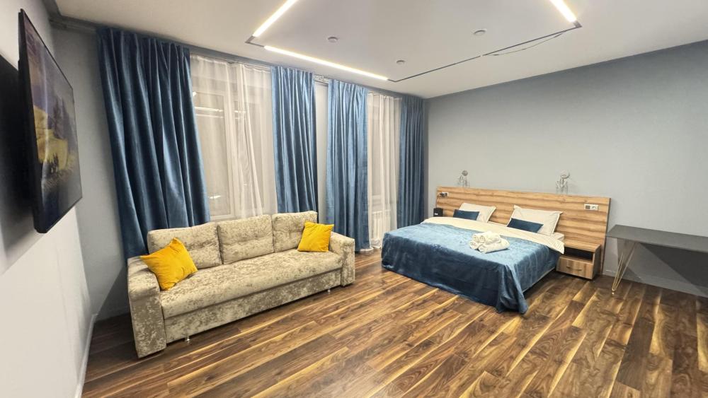 Описание номера «Серый Лофт» для компании до 6 человек в гостинице на ул. Волкова, 52, Казань Расположение: Казань, ул. Волкова, 52 (исторический центр) Идеальное решение для дружеской встречи или семейного отдыха — просторный номер «Серый Лофт», рассчитанный на комфортное размещение компании до 6 человек. Планировка и спальные места: Пространство организовано с умом для максимального удобства: · Два полноразмерных раскладных дивана, обеспечивающие комфортные спальные места. · Просторная двуспальная кровать с ортопедическим матрасом. · Четкое зонирование позволяет с комфортом разместить всех гостей. Дизайн и атмосфера: В оформлении доминирует современная дымчато-серая палитра, создающая стильную, спокойную и нейтральную среду. Ярким контрастным акцентом выступают глубокие синие шторы, добавляющие интерьеру динамики и глубины. Стиль — городской лофт с элементами минимализма. Технологическое оснащение: Номер оснащен всем необходимым для работы и развлечений: · Большой телевизор с диагональю от 65" для кинопросмотров. · Высокоскоростной Wi-Fi по всей территории. · Станция «Алиса» (Яндекс).