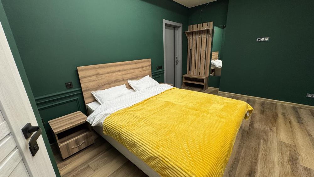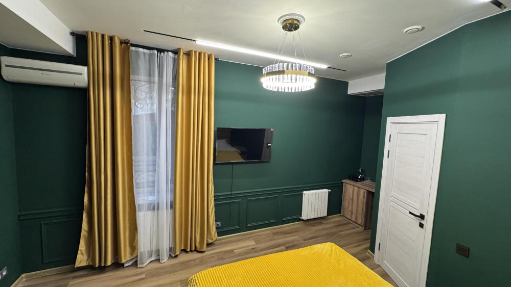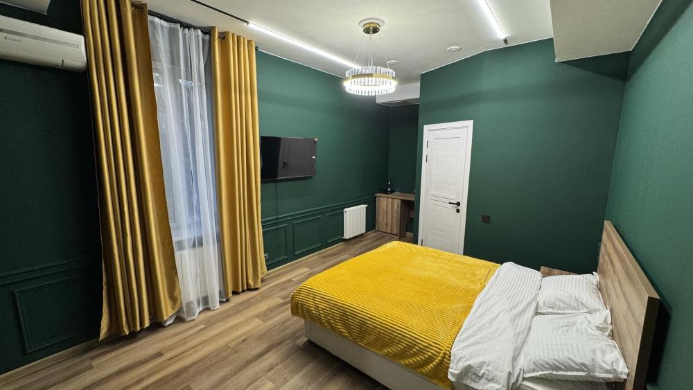Описание номера «Оливковая Роща» в гостинице на ул. Волкова, 52, Казань Расположение: Казань, ул. Волкова, 52 (исторический центр) Пятый номер, «Оливковая Роща», предлагает гостям погрузиться в атмосферу свежести и гармонии. Светлый зеленовато-оливковый оттенок стен напоминает о летней прохладе южных садов, создавая спокойную и элегантную обстановку. Атмосфера и дизайн: Теплый, сложный оливковый тон прекрасно сочетается с мебелью из светлого дерева и текстилем натуральных оттенков. Изысканным завершающим штрихом интерьера служит мягкий зеленый плед, который идеально перекликается со стенами, усиливая ощущение цельности и уюта. Этот интерьер не кричит, а шепчет — о природе, балансе и умиротворении. Комфорт и технологии: Номер оснащен всем необходимым для современного путешественника: · Высокоскоростной Wi-Fi. · Плоский телевизор с большой диагональю. · Домашний электрический чайник для чайной церемонии в любое время.