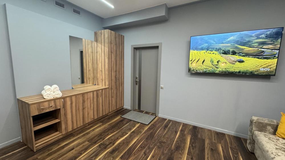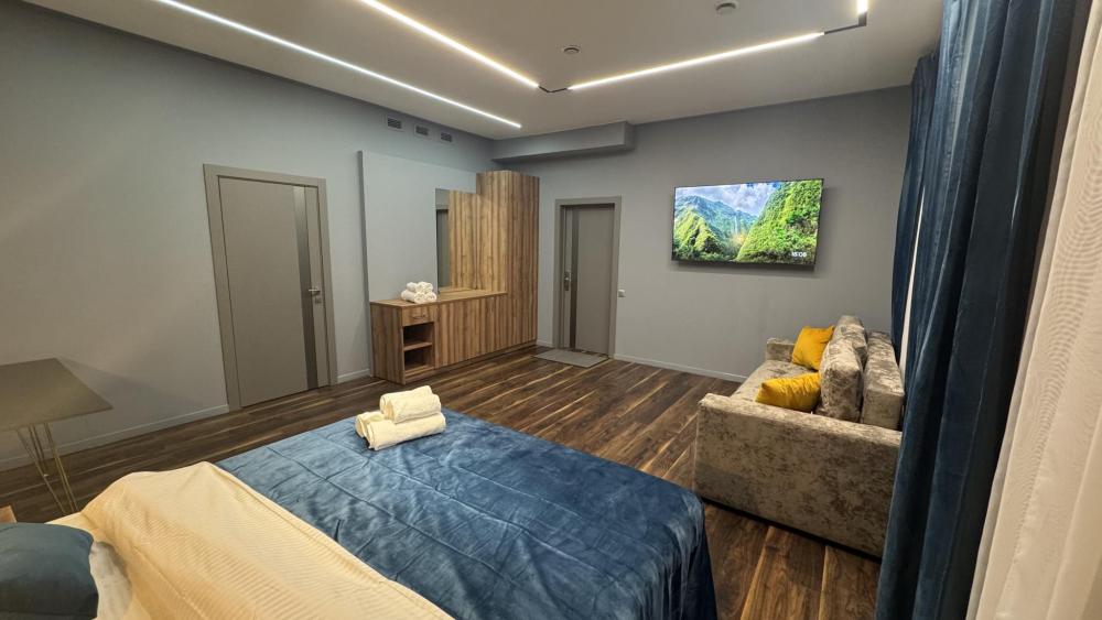 Комфорт и технологии: Для вашего удобства в номере есть: · Современный телевизор с большой диагональю. · Стабильный высокоскоростной Wi-Fi по всей территории. Особенности номера: Прямой выход на первый этаж делает заселение и перемещение максимально простым и комфортным.