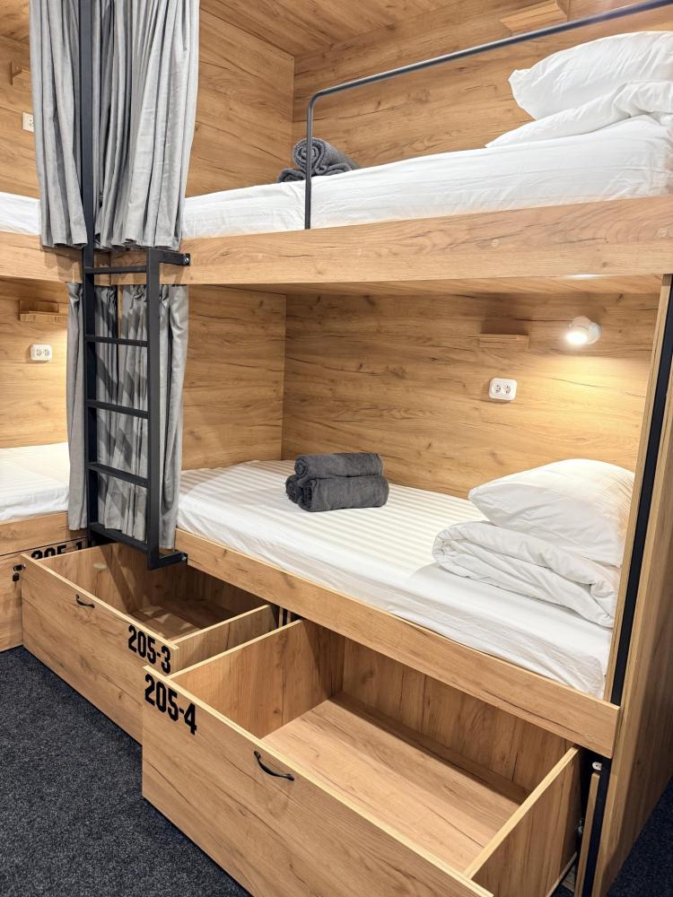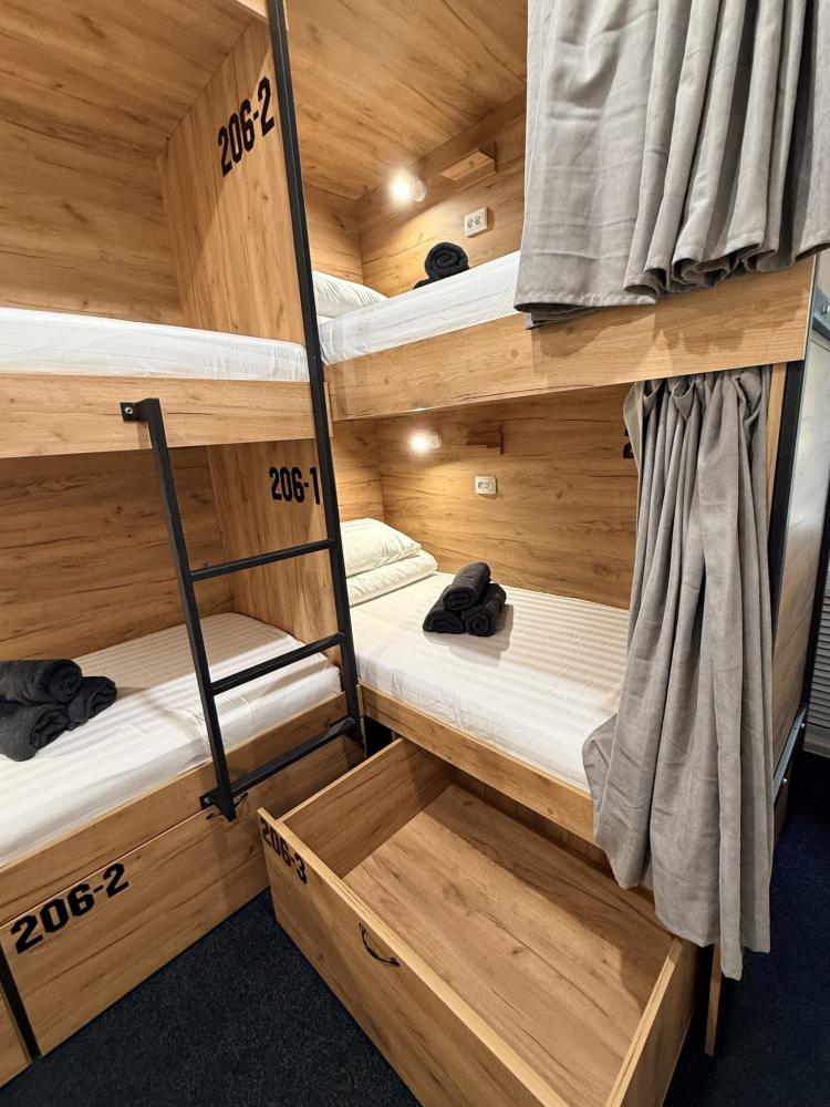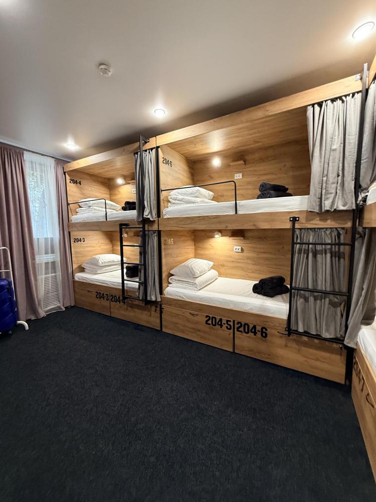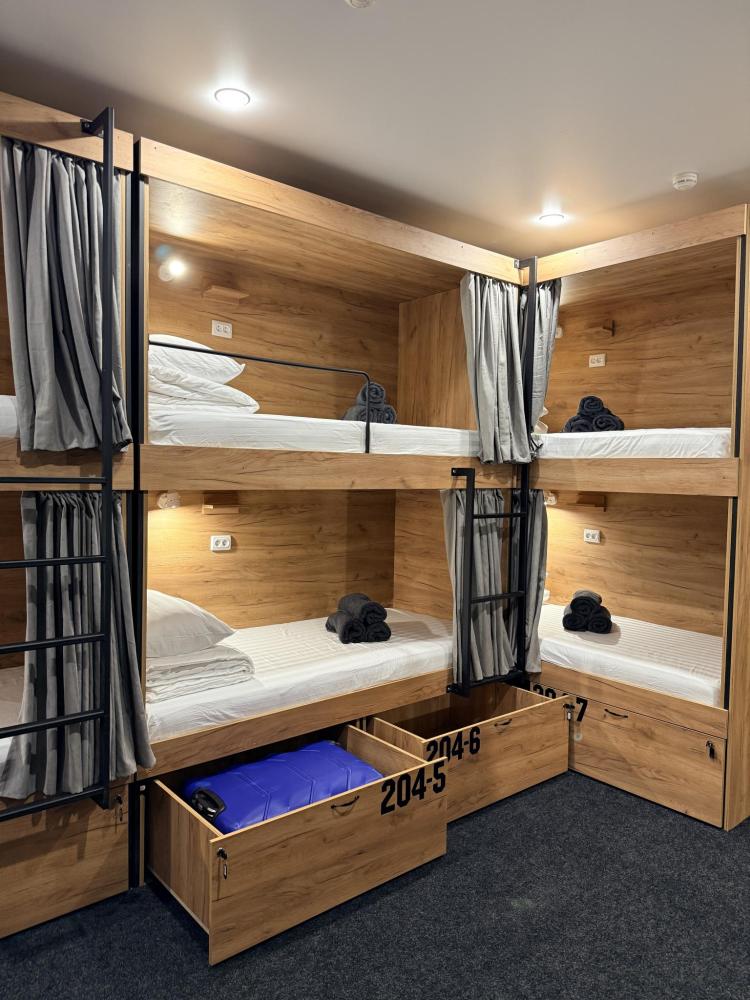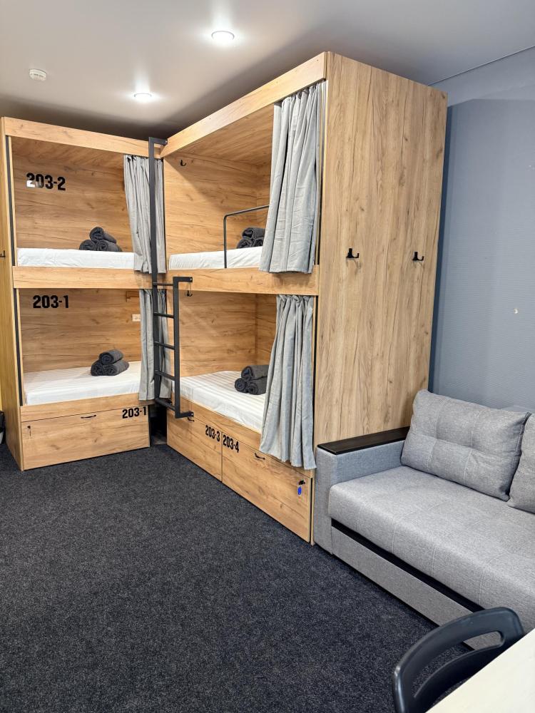 Добро пожаловать в наш общий шестиместный номер! Здесь вы найдете комфорт и удобство для приятного пребывания. Номер оснащен кондиционером, чтобы обеспечить комфортную температуру в любое время года. Каждая кровать оснащена выдвижными ящиками, где вы можете удобно хранить свои вещи и сохранять порядок. Также у каждой кровати есть индивидуальные шторки, чтобы создать личное пространство и обеспечить вам чувство уединения.
